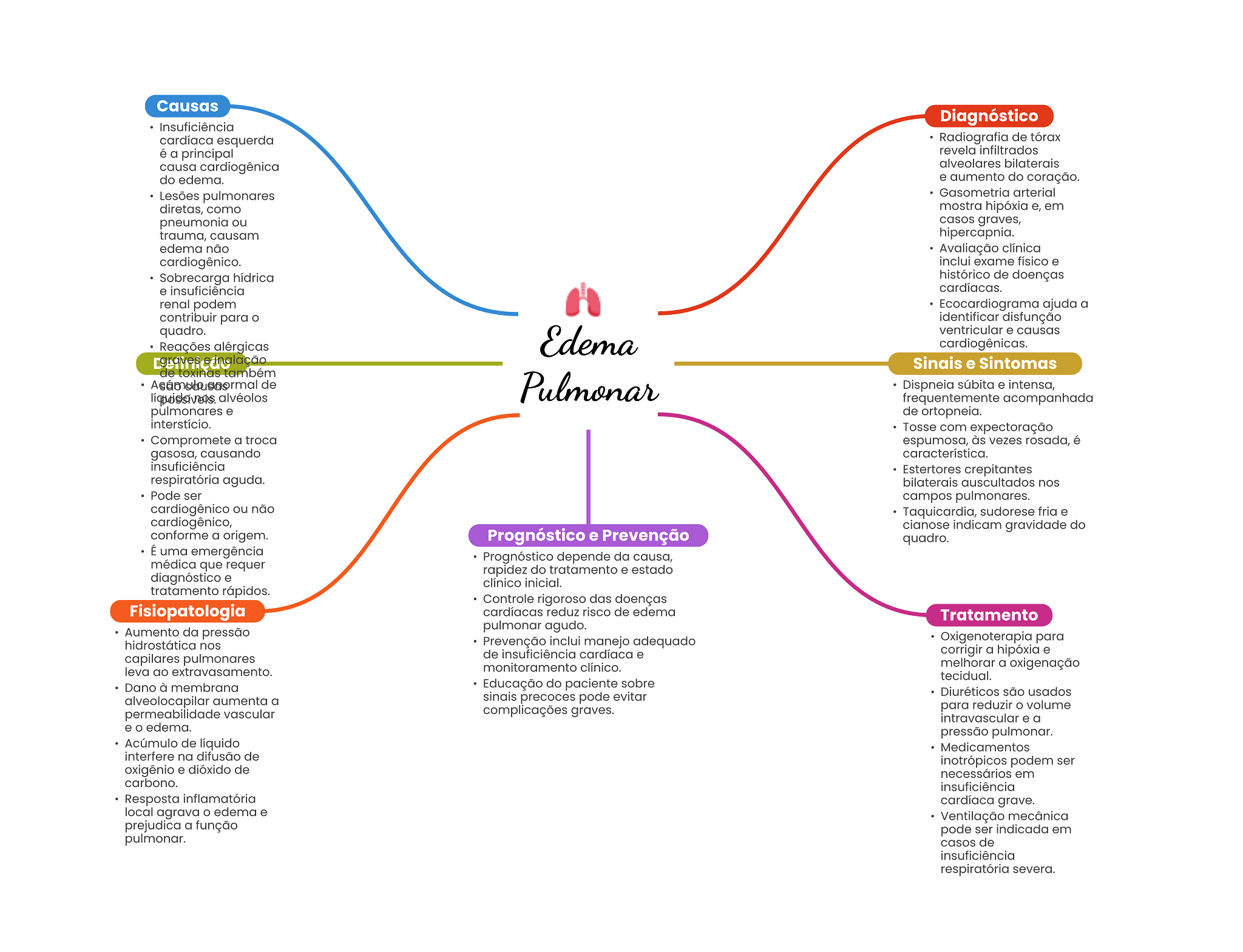 Causas Diagnóstico Insuficiência cardíaca esquerda Radiografia de tórax é a principal revela infiltrados causa cardiogênica alveolares bilaterais do edema. e aumento do coração. Lesões pulmonares Gasometria arterial diretas, como mostra hipóxia e, em pneumonia ou casos graves, trauma, causam hipercapnia. edema não Avaliação clínica cardiogênico. inclui exame físico e Sobrecarga hídrica histórico de doenças e insuficiência cardíacas. renal podem Ecocardiograma ajuda a contribuir para identificar disfunção quadro. Edema ventricular e causas Reações alérgicas cardiogênicas. Sinais e Sintomas de toxinas também de alvéolos Pulmonar Dispneia súbita e intensa, frequentemente acompanhada pulmonares e de ortopneia. interstício. Tosse com expectoração Compromete a troca espumosa, às vezes rosada, é gasosa, causando característica. insuficiência Estertores crepitantes respiratória aguda. bilaterais auscultados nos Pode ser campos pulmonares. cardiogênico ou não Taquicardia, sudorese fria e cardiogênico, cianose indicam gravidade do conforme a origem. Prognóstico e Prevenção quadro. É uma emergência Prognóstico depende da causa, médica que requer rapidez do tratamento e estado diagnóstico e clínico inicial. tratamento rápidos. Controle rigoroso das doenças Fisiopatologia cardíacas reduz risco de edema Tratamento Aumento da pressão pulmonar agudo. hidrostática nos Prevenção inclui manejo adequado Oxigenoterapia para de insuficiência cardíaca e corrigir a hipóxia e capilares pulmonares monitoramento clínico. melhorar a oxigenação leva ao extravasamento. tecidual. Dano à membrana Educação do paciente sobre alveolocapilar aumenta a sinais precoces pode evitar Diuréticos são usados permeabilidade vascular complicações graves. para reduzir O volume intravascular e a e edema. pressão pulmonar. Acúmulo de líquido Medicamentos interfere na difusão de inotrópicos podem ser oxigênio e dióxido de necessários em carbono. insuficiência Resposta inflamatória cardíaca grave. local agrava edema e Ventilação mecânica prejudica a função pode ser indicada em pulmonar. casos de insuficiência respiratória severa.