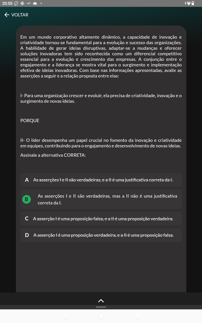 20:55 VOLTAR Em um mundo corporativo altamente dinâmico, a capacidade de inovação e criatividade tornou-se fundamental para a evolução e sucesso das organizações. A habilidade de gerar ideias disruptivas, adaptar-se a mudanças e oferecer soluções inovadoras tem sido reconhecida como um diferencial competitivo essencial para a evolução e crescimento das empresas. A conjunção entre O engajamento e a liderança se mostra vital para surgimento e implementação efetiva de ideias inovadoras. Com base nas informações apresentadas, avalie as asserções a seguir e a relação proposta entre elas: I- Para uma organização crescer e evoluir, ela precisa de criatividade, inovação e O surgimento de novas ideias. PORQUE II- líder desempenha um papel crucial no fomento da inovação e criatividade em equipes, contribuindo para O engajamento e desenvolvimento de novas ideias. Assinale a alternativa CORRETA: A As asserções le H são verdadeiras, ea uma justificativa correta dal. As asserções I e são verdadeiras, mas a II não é uma justificativa correta da I. A asserção lé uma proposição falsa, ea H é uma proposição verdadeira. D A asserção lé uma proposição verdadeira, e a H é uma proposição falsa.