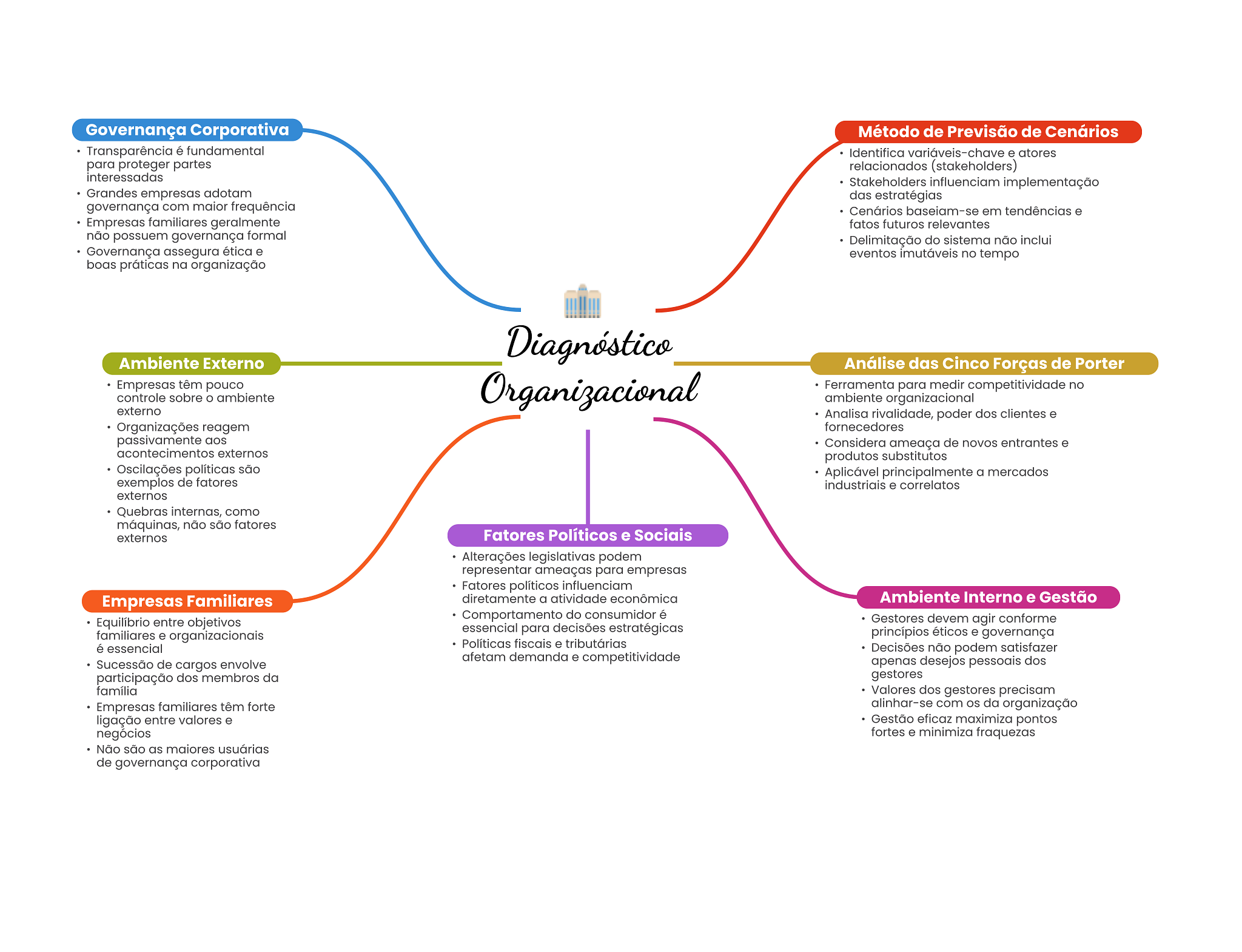 Governança Corporativa Método de Previsão de Cenários Transparência é fundamental Identifica variáveis-chave e atores para proteger partes relacionados (stakeholders) interessadas Stakeholders influenciam implementação Grandes empresas adotam das estratégias governança com maior frequência Cenários baseiam-se em tendências e Empresas familiares geralmente fatos futuros relevantes não possuem governança formal Delimitação do sistema não inclui Governança assegura ética e eventos imutáveis no tempo boas práticas na organização Diagnóstico Ambiente Externo Análise das Cinco Forças de Porter Empresas têm pouco controle sobre ambiente Organizacional Ferramenta para medir competitividade no ambiente organizacional externo Analisa rivalidade, poder dos clientes e Organizações reagem fornecedores passivamente aos Considera ameaça de novos entrantes e acontecimentos externos produtos substitutos Oscilações políticas são Aplicável principalmente a mercados exemplos de fatores industriais e correlatos externos Quebras internas, como máquinas, não são fatores externos Fatores Políticos e Sociais Alterações legislativas podem representar ameaças para empresas Fatores políticos influenciam Empresas Familiares diretamente a atividade econômica Ambiente Interno e Gestão Comportamento do consumidor é Equilíbrio entre objetivos Gestores devem agir conforme essencial para decisões estratégicas familiares e organizacionais princípios éticos e governança é essencial Políticas fiscais e tributárias Decisões não podem satisfazer afetam demanda e competitividade Sucessão de cargos envolve apenas desejos pessoais dos participação dos membros da gestores família Valores dos gestores precisam Empresas familiares têm forte alinhar-se com da organização ligação entre valores e Gestão eficaz maximiza pontos negócios fortes e minimiza fraquezas Não são as maiores usuárias de governança corporativa