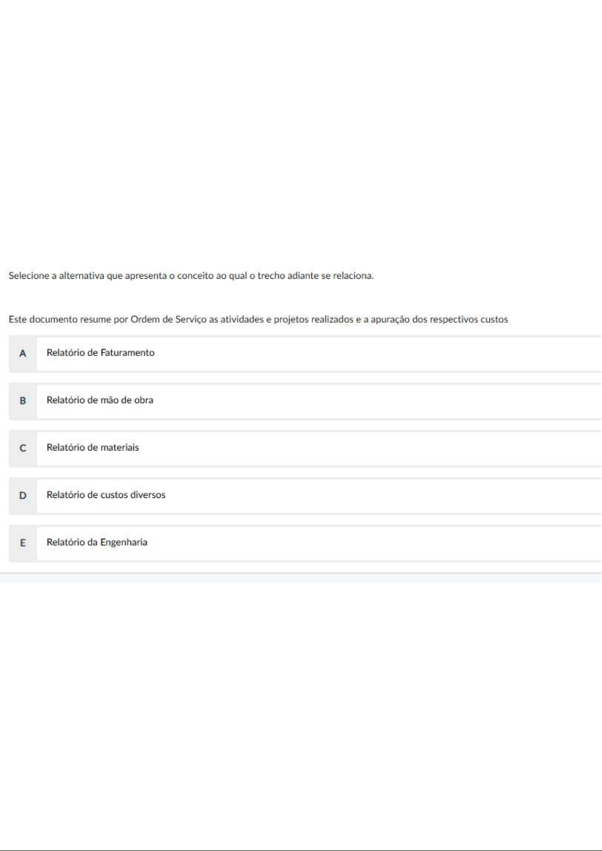 Selecione a alternativa que apresenta conceito ao qual o trecho adiante se relaciona. Este documento resume por Ordem de Serviço as atividades e projetos realizados e a apuração dos respectivos custos A Relatório de Faturamento B Relatório de mão de obra Relatório de materiais D Relatório de custos diversos E Relatório da Engenharia