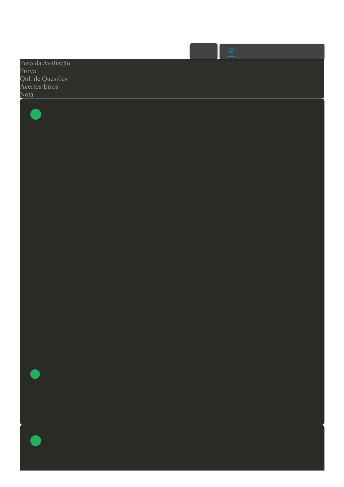 Prova Impressa GABARITO | Avaliação I - Individual (Cod.:1600636) Peso da Avaliação 1,50 Prova 118559986 Qtd. de Questões 10 Acertos/Erros 10/0 Nota 10,00 Uma nutricionista, responsável pela alimentação escolar, incluiu no cardápio dos Centros de Educação Infantil uma Papa de Aveia com Banana para ser ofertada para os bebês de 6 a 11 meses. A nutricionista elaborou a ficha técnica da preparação, em que consta os ingredientes per capta de: 20 g aveia em flocos, 30 g banana branca, 100 ml leite integral. Diante da importância da Ficha Técnica de Preparação na produção de alimentos em quantidades adequadas, classifique V para as sentenças verdadeiras e F para as falsas: Considere os dados: fator de correção: banana = 1,50. ( ) Para produzir 388 papas de aveia com banana é preciso a compra de 7760 g de banana branca, 17460 g de aveia e 38 litros de leite integral. ( ) Em um Centro de Educação Infantil que possui 52 bebês que devem receber a papa de aveia com banana, a cozinheira precisará de 1040 g de aveia, 1560 g de banana branca e 520 ml de leite integral para preparar a receita. ( ) Em um Centro de Educação Infantil que possui 28 bebês que devem receber a papa de aveia com banana, a cozinheira precisará de 560 g de aveia, 1260 g de banana branca e 2800 ml de leite integral para preparar a receita. ( ) Considerando que na Rede Municipal de Ensino estão matriculados 4800 bebês de 6 a 11 meses, ao fazer a previsão de compras para uma semana, no qual há oferta de papa de aveia com banana em 3 dias, a nutricionista deverá solicitar a compra de 648 kg de banana branca. Assinale a alternativa que apresenta a sequência CORRETA: A V - V - F - F. B V - F - F - V. C F - F - V - V. D V - F - V - F. Em uma Unidade de Alimentação e Nutrição (UAN) que fornece 580 refeições/dia, de segunda à sexta-feira é servido diariamente arroz. De acordo com a Ficha Técnica de Preparo elaborada pelo Nutricionista, o Fator de Correção do arroz é 1, o Indicador de Cocção é 2,33 e o per capta de arroz VOLTAR A+Aumentar, FonteAlterar modo de visualização 1 2 13/04/2026, 23:05 Avaliação I - Individual about:blank 1/6 cru é de 50g. Diante do exposto, assinale a alternativa CORRETA que apresenta a quantidade de arroz que deve ser comprada semanalmente: A 67,570 kg. B 145 kg. C 337,850 kg. D 29 kg. Em uma Unidade de Alimentação e Nutrição (UAN) de um Centro de Educação Infantil são servidos para os bebês de 6 a 9 meses, uma papinha de abacate. Na preparação da papinha de abacate são utilizados 60 g de abacate (peso líquido) por bebê. Quantos quilos de abacate precisam ser adquiridos para fazer a papinha para 32 bebês? Considere que o fator de correção do abacate é de 1,60. A 1,920 kg. B 3,072 kg. C 3,720 kg. D 3 kg. O calor seco ocorre quando, no método de cocção, existe a desidratação do alimento. O calor seco pode ser aplicado ao alimento com ou sem gordura. No calor seco com gordura é transmitido o calor, de forma indireta, por meio da gordura. Já no calor seco sem gordura há apenas ar seco (PHILIPPI, 2014). Sobre o método de cocção calor seco com gordura, associe os itens, utilizando o código a seguir: I- Frigir. II- Assar. III- Gratinar. IV- Saltear. ( ) Consiste em colocar o alimento no forno para que fique com uma camada dourada e crocante. ( ) Consiste em colocar o alimento em pouca gordura sem movimentar a frigideira. ( ) Consiste em colocar o alimento no forno ou no espeto. ( ) Consiste em colocar o alimento em pouca gordura numa frigideira e mexer constantemente. Assinale a alternativa que apresenta a sequência CORRETA: FONTE: PHILIPPI, Sônia Tucunduva. Nutrição e Técnica Dietética. 3. ed. Barueri: Manole, 2014. 3 4 13/04/2026, 23:05 Avaliação I - Individual about:blank 2/6 A III - I - II - IV. B IV - I - III - II. C I - IV - III - II. D II - III - II - IV. Em uma Unidade de Alimentação e Nutrição (UAN), o cardápio do dia é: arroz parboilizado, feijão preto, purê de batata, músculo ensopado, brócolis e cenoura ralada, e de sobremesa melancia. Considerando a importância da Ficha Técnica de Preparação (FTP), bem como os itens que a compõem: fator de correção (FC), o indicador de cocção (IC) e o indicador de reidratação (IR) dos alimentos, classifique V para as sentenças verdadeiras e F para as falsas: ( ) Na preparação do arroz parboilizado, se o peso líquido cru for de 10000 g e, depois de cozido, o peso for de 23300 g, é correto concluir que o indicador de cocção do arroz parboilizado é igual a 2,33. ( ) A UAN que possui FTP consegue realizar controle financeiro, controle na compra dos gêneros alimentícios e padronizar a execução da receita. ( ) O IC é obtido pela multiplicação do peso líquido final pelo peso bruto. ( ) O FC deve ser utilizado para a precisão de compras do feijão preto, batata, músculo bovino, brócolis, cenoura e melancia. Assinale a alternativa que apresenta a sequência CORRETA: A V - V - F - V. B V - F - V - F. C F - F - V - V. D F - V - F - F. A lista de compras deve ser realizada de forma a evitar desperdícios, bem como a falta de gêneros alimentícios. Em uma Unidade de Alimentação e Nutrição (UAN), na preparação da salada são utilizados 38 kg de cenoura (peso líquido). Quantos quilos de cenoura devem ser adquiridos para o consumo de dois dias? Considere que o fator de correção da cenoura é 1,17. A 44,460 kg. 5 6 13/04/2026, 23:05 Avaliação I - Individual about:blank 3/6 B 88,920 kg. C 78,920 kg. D 76 kg. Em um hospital é servido diariamente no jantar, a todos os pacientes em dieta livre, uma sopa de frango. Sendo os ingredientes per capta de: 50 g frango, 15 g arroz, 15 g cenoura, 20 g chuchu e 2 g tempero verde. Diante da importância da Ficha Técnica de Preparação na produção de alimentos em quantidades adequadas, classifique V para as sentenças verdadeiras e F para as falsas: Considere os dados: fator de correção: cenoura = 1,16