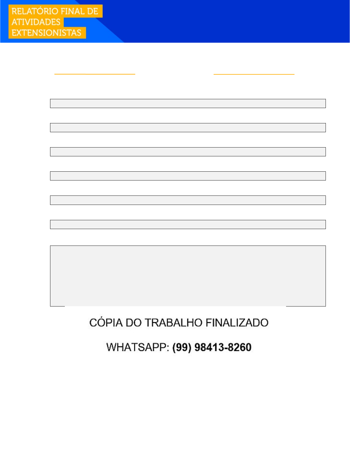 DADOS DO ALUNO: Aluno: [Nome completo] *SOLICITE O ORÇAMENTO: (99) 98413-8260* RA: [Número do RA do aluno] *MODELOS: CÓPIA OU EXCLUSIVO.* POLO / UNIDADE: CURSO: CST EM DESIGN DE INTERIORES COMPONENTE CURRICULAR: PROJETO DE EXTENSÃO II - DESIGN DE INTERIORES PROGRAMA DE EXTENSÃO: PROGRAMA DE AÇÃO E DIFUSÃO CULTURAL. FINALIDADE E MOTIVAÇÃO: A motivação da extensão no Programa de Ação e Difusão Cultural para o curso de Tecnologia em Design de Interiores está na preservação da memória e do patrimônio cultural em suas diversas vertentes junto à comunidade. Ao identificar as necessidades de seu entorno, os alunos poderão efetuar ações de apoio relacionados a temática do programa e poderão desenvolver habilidades e competências específicas no âmbito do curso. Os locais que poderão contemplar o projeto são: ONGs, Prefeitura, Associações de Bairros, Associações Comerciais, Escolas e diversos Órgãos Públicos. image1.png image2.png