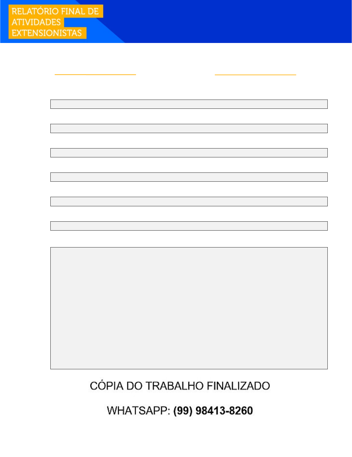 DADOS DO ALUNO: Aluno: [Nome completo] *SOLICITE O ORÇAMENTO: (99) 98413-8260* RA: [Número do RA do aluno] *MODELOS: CÓPIA OU EXCLUSIVO.* POLO / UNIDADE: CURSO: PSICOLOGIA - LICENCIATURA COMPONENTE CURRICULAR: PROJETO DE EXTENSÃO II - PSICOLOGIA PROGRAMA DE EXTENSÃO: PROGRAMA DE AÇÃO E DIFUSÃO CULTURAL. FINALIDADE E MOTIVAÇÃO: A finalidade da extensão no Programa de Ação e Difusão Cultural está na sua função social, por meio deste projeto ocorrerá uma maior integração entre a faculdade e a população, trazendo apoio a comunidade e difusão do ensino. Os alunos deverão identificar as necessidades da comunidade para o desenvolvimento de atividades que visem a melhoria da qualidade de vida na comunidade; a preservação da cultura brasileira; a difusão da cultura; a inclusão e a valorização da diversidade. A Psicologia se faz através da interação humana, assim, os alunos terão a oportunidade de desenvolver e aprimorar competências técnico-profissionais e soft skills específicas e importantes para o Psicólogo. Os locais que poderão contemplar esse projeto são: Parcerias com a Prefeitura e atuação em Unidades Básicas de Saúde; Associações de Bairros; Clínicas de Saúde Públicas e Privadas; Hospitais; Centros de Saúde; Casas de Repouso; Centros-Dia; Instituições de Longa Permanência para Idosos; Creches e Escolas; Instituições Religiosas; Organizações não-governamentais; Centros de Referência a Assistência Social e demais instituições que representem a comunidade que fará parte do projeto. image1.png image2.png