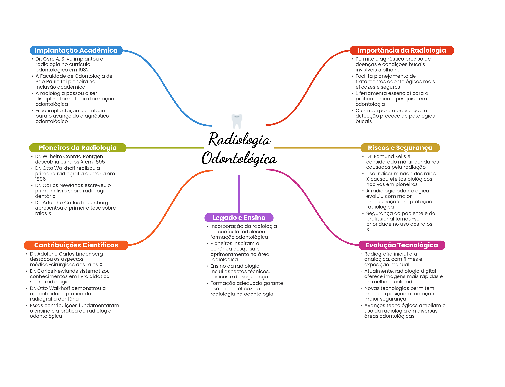 Implantação Acadêmica Importância da Radiologia Dr. Cyro Silva implantou a Permite diagnóstico preciso de radiologia no currículo doenças e condições bucais odontológico em 1932 invisíveis a olho nu A Faculdade de Odontologia de Facilita planejamento de São Paulo foi pioneira na tratamentos odontológicos mais inclusão acadêmica eficazes e seguros A radiologia passou a ser É ferramenta essencial para a disciplina formal para formação prática clínica e pesquisa em odontológica odontologia Essa implantação contribuiu Contribui para a prevenção e para avanço do diagnóstico detecção precoce de patologias odontológico bucais Radiologia Pioneiros da Radiologia Riscos e Segurança Dr. Wilhelm Conrad Röntgen descobriu raios X em 1895 Odontológica Dr. Edmund Kells é considerado mártir por danos Dr. Otto Walkhoff realizou a causados pela radiação primeira radiografia dentária em Uso indiscriminado dos raios 1896 X causou efeitos biológicos Dr. Carlos Newlands escreveu nocivos em pioneiros primeiro livro sobre radiologia A radiologia odontológica dentária evoluiu com maior Dr. Adolpho Carlos Lindenberg preocupação em proteção apresentou a primeira tese sobre radiológica raios X Segurança do paciente e do Legado e Ensino profissional tornou-se Incorporação da radiologia prioridade no uso dos raios no currículo fortaleceu a X formação odontológica Contribuições Científicas Pioneiros inspiram a contínua pesquisa e Evolução Tecnológica Dr. Adolpho Carlos Lindenberg aprimoramento na área Radiografia inicial era destacou aspectos radiológica analógica, com filmes e médico-cirúrgicos dos raios X Ensino da radiologia exposição manual Dr. Carlos Newlands sistematizou inclui aspectos técnicos, Atualmente, radiologia digital conhecimentos em livro didático clínicos e de segurança oferece imagens mais rápidas e sobre radiologia Formação adequada garante de melhor qualidade Dr. Otto Walkhoff demonstrou a uso ético e eficaz da Novas tecnologias permitem aplicabilidade prática da radiologia na odontologia menor exposição à radiação e radiografia dentária maior segurança Essas contribuições fundamentaram Avanços tecnológicos ampliam ensino e a prática da radiologia uso da radiologia em diversas odontológica áreas odontológicas