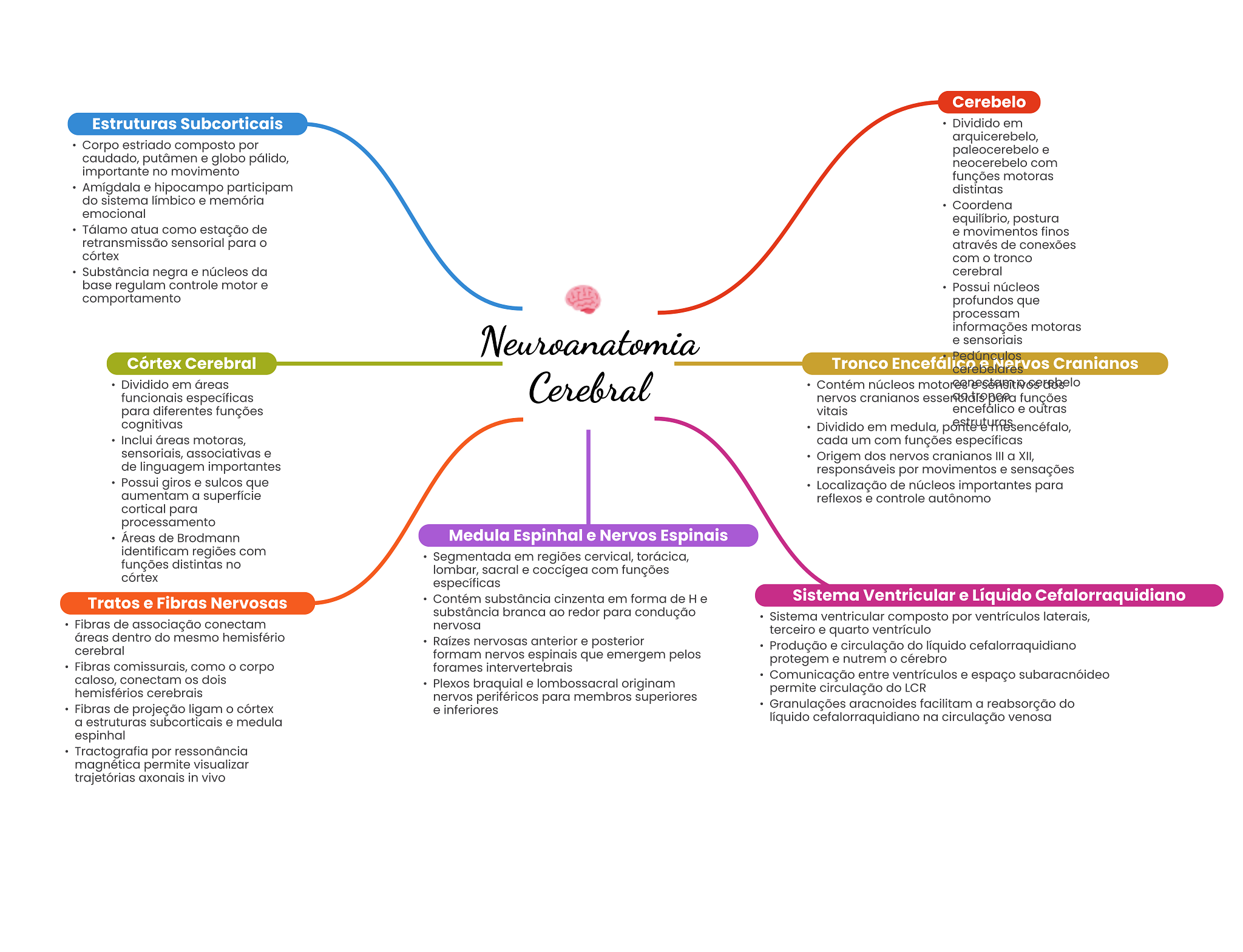 Cerebelo Estruturas Subcorticais Dividido em arquicerebelo, Corpo estriado composto por paleocerebelo e caudado, putâmen e globo pálido, neocerebelo com importante no movimento funções motoras Amígdala e hipocampo participam distintas do sistema límbico e memória Coordena emocional equilíbrio, postura Tálamo atua como estação de e movimentos finos retransmissão sensorial para através de conexões córtex com O tronco Substância negra e núcleos da cerebral base regulam controle motor e Possui núcleos comportamento profundos que processam informações motoras Neuroanatomia e sensoriais Córtex Cerebral Tronco Pedúnculos Nervos Cranianos Dividido em áreas funcionais específicas Cerebral Contém núcleos nervos cranianos funções para diferentes funções vitais encefálico e outras cognitivas Dividido em medula, Inclui áreas motoras, cada um com funções específicas sensoriais, associativas e Origem dos nervos cranianos III a XII, de linguagem importantes responsáveis por movimentos e sensações Possui giros e sulcos que Localização de núcleos importantes para aumentam a superfície reflexos e controle autônomo cortical para processamento Áreas de Brodmann Medula Espinhal e Nervos Espinais identificam regiões com Segmentada em regiões cervical, torácica, funções distintas no lombar, sacral e coccígea com funções córtex específicas Tratos e Fibras Nervosas Contém substância cinzenta em forma de H e Sistema Ventricular e Líquido Cefalorraquidiano substância branca ao redor para condução Sistema ventricular composto por ventrículos laterais, Fibras de associação conectam nervosa terceiro e quarto ventrículo áreas dentro do mesmo hemisfério Raízes nervosas anterior e posterior cerebral Produção e circulação do líquido cefalorraquidiano formam nervos espinais que emergem pelos protegem e nutrem cérebro Fibras comissurais, como corpo forames intervertebrais caloso, conectam dois Comunicação entre ventrículos e espaço subaracnóideo Plexos braquial e lombossacral originam hemisférios cerebrais permite circulação do LCR nervos periféricos para membros superiores Fibras de projeção ligam córtex e inferiores Granulações aracnoides facilitam a reabsorção do a estruturas subcorticais e medula líquido cefalorraquidiano na circulação venosa espinhal Tractografia por ressonância magnética permite visualizar trajetórias axonais in vivo