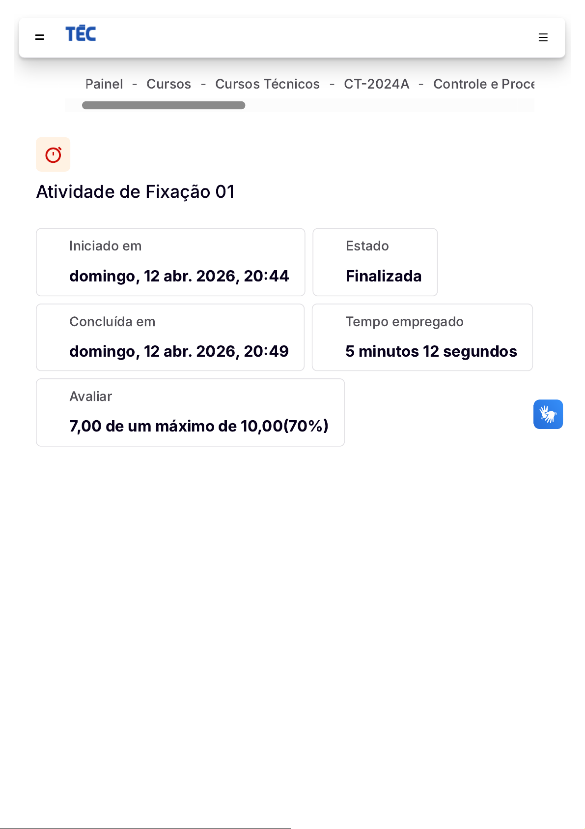 - - - - Iniciado em domingo, 12 abr. 2026, 20:44 Estado Finalizada Concluída em domingo, 12 abr. 2026, 20:49 Tempo empregado 5 minutos 12 segundos Avaliar 7,00 de um máximo de 10,00(70%) Atividade de Fixação 01 Painel Cursos Cursos Técnicos CT-2024A Controle e Proce https://virtual.politecnicabr.com.br/my/ https://virtual.politecnicabr.com.br/course/index.php https://virtual.politecnicabr.com.br/course/index.php?categoryid=36 https://virtual.politecnicabr.com.br/course/index.php?categoryid=167 https://virtual.politecnicabr.com.br/course/index.php?categoryid=40 https://virtual.politecnicabr.com.br/ QUESTÃO 1 Correto Atingiu 1,00 de 1,00 Marcar questão A primeira legislação existente é a ISSO 9000, que determina normas e requisitos que focam nos processos de gestão de qualidade e garantia da qualidade, dessa forma podemos dizer que a ISSO 9000, é focada nos processos que ocorrem dentro das indústrias, e não nos produtos. Sabendo que as demais ISOs são um desmembramento da ISO 9000, assinale a alternativa INCORRETA. Escolha uma opção: 1. A ISO 9001 dispões de normas e regulamentos que trata sobre a qualidade de projetos. 2. A ISO 9001 dispões de normas e regulamentos que trata sobre a qualidade da execução. 3. a ISO 9004, estabelece algumas regras de gestão da qualidade por meio de processos sustentáveis. 4. As diretrizes disponíveis na ISO 19011, servem somente para auditorias. 5. As diretrizes disponíveis na ISO 19011, estão relacionadas ao monitoramento da certificação. https://virtual.politecnicabr.com.br/ QUESTÃO 2 Incorreto Atingiu 0,00 de 1,00 Marcar questão O conceito de produtividade, por muitas vezes chega a ser confundido com o conceito de produção, por terem objetivos e significados parecidos, entretanto, o conceito dispõe de objetivos e significados com características particulares. Essas características fazem com que os conceitos sejam diferenciados. Considerando essa afirmativa, assinale a alternativa que apresenta a principal diferença entre produção e produtividade. Escolha uma opção: 1. A produção foca na quantidade e a produtividade foca na qualidade. 2. O conceito de produtividade é englobado pelo conceito de produção. 3. A produção foca no produto enquanto a produtividade foca no processo. 4. A produção é linear e a produtividade não. 5. A produção é continua e a produtividade intermitente. https://virtual.politecnicabr.com.br/ QUESTÃO 3 Incorreto Atingiu 0,00 de 1,00 Marcar questão Para obtenção do selo ISO, é necessário que alguma organização regulamentadora qualificada faça as análises dos requisitos na empresa. A implantação de ISO, também deve acontecer por meio de organizações regulamentadoras aptas. No Brasil, somente algumas organizações estão aptas a fazer. Assinale a alternativa que NÃO apresenta uma dessas organizações. Escolha uma opção: 1. NBR. 2. Selo Caixa. 3. Associação Vanzolini. 4. Associação Andrade. 5. Selo LED. https://virtual.politecnicabr.com.br/ QUESTÃO 4 Correto Atingiu 1,00 de 1,00 Marcar questão A organização do trabalho tem grande influência tanto na produção, como na produtividade, pois serve para elaborar planos de ação do cumprimento das tarefas, ou seja, determina quem e quando será realizado determinada tarefa, o que é de suma importância para o gerenciamento do controle de qualidade. Sobre esses conceitos, assinale a alternativa INCORRETA. Escolha uma opção: 1. O ambiente de trabalho deve garantir segurança ao trabalhador. 2. As condições de trabalho não influenciam diretamente na produtividade. 3. A empresa deve garantir higiene e qualidade de vida. 4. A antropometria é capaz de adequar os postos de trabalho aos trabalhadores. 5. As condições de trabalho ajudam no cumprimento da moral. https://virtual.politecnicabr.com.br/ QUESTÃO 5 Correto Atingiu 1,00 de 1,00 Marcar questão A qualidade de algo diz muito sobre uma empresa, não somente sobre o produto em específico, mas sobre a organização como um todo, a representação da qualidade, demonstra como está a saúde operacional da empresa, e esse conceito é de fundamental importância para o gerenciamento da qualidade dentro da organização. Nesse contexto a definição de qualidade está ligada em dois fundamentos. Assinale a alternativa que demonstra esses dois fundamentos. Escolha uma opção: 1. Sobrevivência da empresa e satisfação do cliente. 2. Conformidade de produtos e satisfação do cliente. 3. Sobrevivência da empresa e conformidade dos produtos. 4. Obtenção de lucros e resultados. 5. Produção e produtividade. https://virtual.politecnicabr.com.br/ QUESTÃO 6 Correto Atingiu 1,00 de 1,00 Marcar questão Os custos de produção, são todos os custos envolvidos na produção, desde a venda até a entrega de um produto final. Esses custos influenciam diretamente no preço final, ou seja, irão influenciar de forma significativa no valor que os produtos irão chegar ao consumidor final. Considerando essa afirmativa assinale a alternativa CORRETA. Escolha uma opção: 1. Quanto maior o custo-benefício, melhor. 2. Quanto menor o custo-benefício, melhor. 3. O custo-benefício não influencia na opinião do cliente. 4. A margem de custo não influencia nos custos que incidem sobre os consumidores. 5. O mark-up só considera o custo que incide sobre o consumidor. https://virtual.politecnicabr.com.br/ QUESTÃO 7 Correto Atingiu 1,00 de 1,00 Marcar questão O processo de correção de falhas é um processo complexo, que exige um planejamento. O primeiro passo nesse processo para dar início a correção de falhas, é a identificação do problema, para facilitar a identificação do problema, é possível utilizar três ferramentas disponíveis na administração. Assinale a alternativa que apresenta uma dessas ferramentas. Escolha uma opção: 1. Os 6 porquês. 2. Os 5 Ms. 3. Diagrama de Pareto. 4. atendimento e planejamento. 5. pesquisa e tráfego. https://virtual.pol