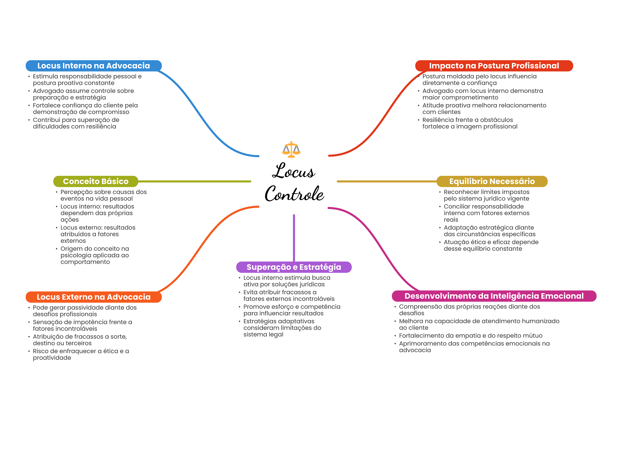 Locus Interno na Advocacia Impacto na Postura Profissional Estimula responsabilidade pessoal e Postura moldada pelo locus influencia postura proativa constante diretamente a confiança Advogado assume controle sobre Advogado com locus interno demonstra preparação e estratégia maior comprometimento Fortalece confiança do cliente pela Atitude proativa melhora relacionamento demonstração de compromisso com clientes Contribui para superação de Resiliência frente a obstáculos dificuldades com resiliência fortalece a imagem profissional Locus Conceito Básico Equilíbrio Necessário Percepção sobre causas dos eventos na vida pessoal Controle Reconhecer limites impostos pelo sistema jurídico vigente Locus interno: resultados Conciliar responsabilidade dependem das próprias interna com fatores externos ações reais Locus externo: resultados Adaptação estratégica diante atribuídos a fatores das circunstâncias específicas externos Atuação ética e eficaz depende Origem do conceito na desse constante psicologia aplicada ao comportamento Superação e Estratégia Locus interno estimula busca ativa por soluções jurídicas Evita atribuir fracassos a Locus Externo na Advocacia fatores externos incontroláveis Desenvolvimento da Inteligência Emocional Pode gerar passividade diante dos Promove esforço e competência Compreensão das próprias reações diante dos desafios profissionais para influenciar resultados desafios Sensação de impotência frente a Estratégias adaptativas Melhora na capacidade de atendimento humanizado fatores incontroláveis consideram limitações do ao cliente Atribuição de fracassos a sorte, sistema legal Fortalecimento da empatia e do respeito mútuo destino ou terceiros Aprimoramento das competências emocionais na Risco de enfraquecer a ética e a advocacia proatividade