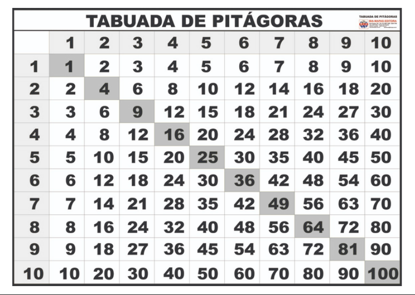 TABUADA DE PITÁGORAS DE PITAGORAS MAPAS EDITORA 1 2 3 4 5 6 7 8 9 10 1 1 2 3 4 5 6 7 8 9 10 2 2 4 6 8 10 12 14 16 18 20 3 3 6 9 12 15 18 21 24 27 30 4 4 8 12 16 20 24 28 32 36 40 5 5 10 15 20 25 30 35 40 45 50 6 6 12 18 24 30 36 42 48 54 60 7 7 14 21 28 35 42 49 56 63 70 8 8 16 24 32 40 48 56 64 72 80 9 9 18 27 36 45 54 63 72 81 90 10 10 20 30 40 50 60 70 80 90 100