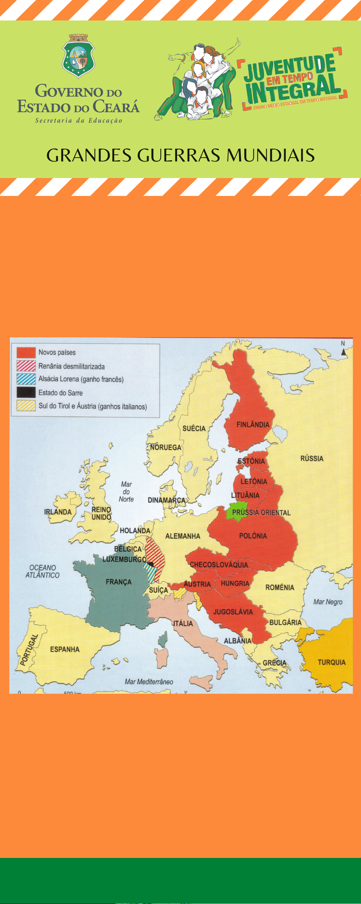 GRANDES GUERRAS MUNDIAIS C O O R D E N A D O R I A D E E D U C A Ç A O E M T E M P O I N T E G R A L - C O E T I / S E D U C Consequências da 1ª Guerra Mundial Surgimento de novos países Após a Grande Guerra, quatro impérios desmoronaram: Alemão, Austro Húngaro, Russo e Otomano. Deles surgiram uma série de novos países, como Polônia, Tchecoslováquia, Iugoslávia, Áustria, Hungria, Estônia, Lituânia e Letônia. Assim, uma das consequências da Primeira Guerra Mundial foi a nova divisão política europeia. Dos oito novos países citados acima, orientado pelo seu professor, pesquise sobre um deles. Como ficou o governo desse país? Quais os ganhos e perdas para a população local? Como ficou a economia após a guerra? Vários outros aspectos podem ser explorados, a critério do professor desta eletiva, então, siga as orientações e boa pesquisa.
