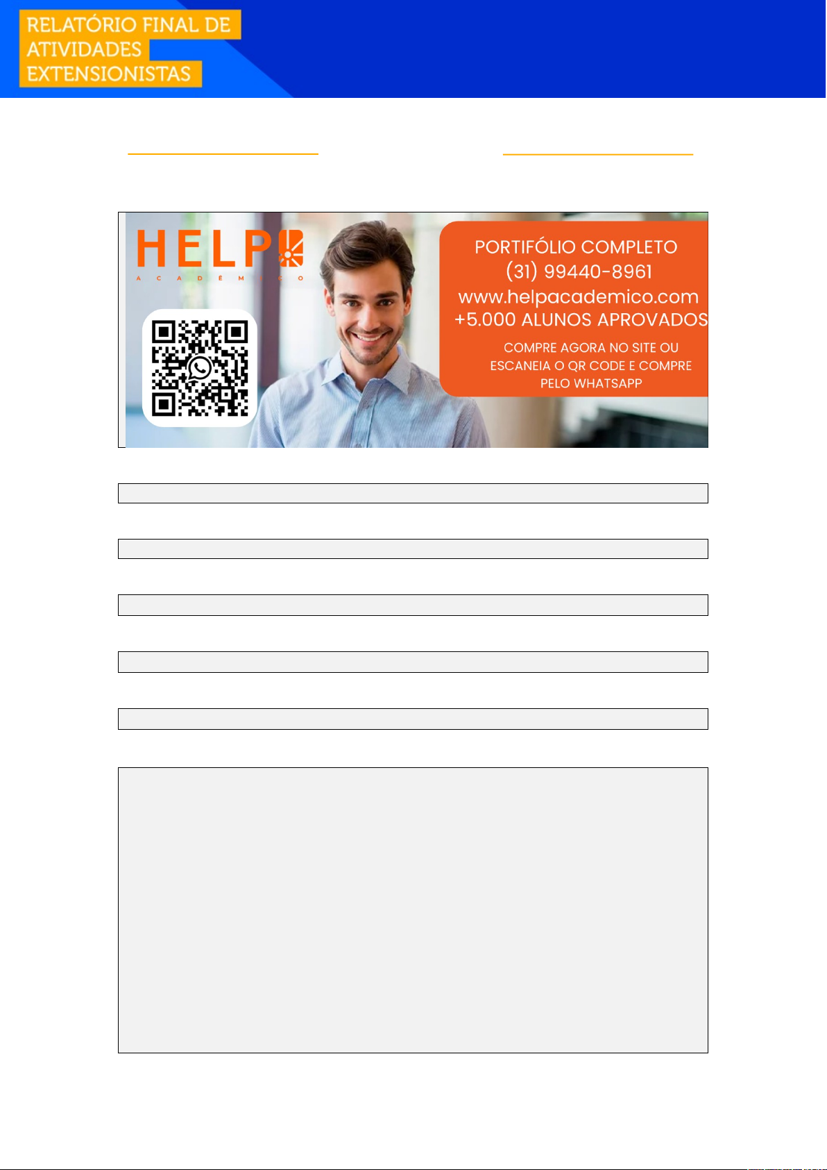 DADOS DO ALUNO: Aluno: [Nome completo] RA: [Número do RA do aluno] POLO / UNIDADE: CURSO: ENFERMAGEM - BACHARELADO COMPONENTE CURRICULAR: PROJETO DE EXTENSÃO III - ENFERMAGEM PROGRAMA DE EXTENSÃO: PROGRAMA DE SUSTENTABILIDADE. FINALIDADE E MOTIVAÇÃO: O programa extensionista voltado as ações de Sustentabilidade do curso de Enfermagem possui a finalidade de apoiar a comunidade por meio da disseminação do conhecimento adquirido no curso, priorizando o cuidado e compreensão do meio ambiente. Tais ações poderão reduzir impactos socioambientais negativos e criar uma cultura regenerativa para gerar impactos positivos que irão refletir no meio ambiente, que são importantes para possibilitar uma continuidade do uso de recursos naturais de forma sustentável. Ao identificar as problemáticas ambientais da comunidade os alunos terão a motivação para efetuar as ações de apoio relacionadas ao curso, pelas quais poderão ser desenvolvidas competências técnicas e soft skills específicas. Os conteúdos programáticos sugeridos para correlacionar as ações são: Saúde pública, estratégia da saúde da família, gestão em saúde, saúde do trabalhador, saúde do adulto, da mulher, da criança, do adolescente e do idoso. Os locais que poderão contemplar esse projeto são: Parcerias com a Prefeitura e atuação em Unidades Básicas de Saúde; Associações de Bairros; Clínicas de Saúde Públicas e Privadas; Hospitais; Centros de Saúde; Spas; Salões de Beleza; Centros Estéticos; Casas de Repouso; Instituições de Longa Permanência para Idosos; Creches; Templos Religiosos; Escolas; ONGs. COMPETÊNCIAS: I - Desenvolver ações, considerando as especificidades regionais e o perfil epidemiológico de saúde relacionados a promoção, prevenção, proteção, tratamento e reabilitação em saúde ao indivíduo, à família, ao grupo e à comunidade; II - Prestar cuidado de Enfermagem em conformidade com a legislação vigente relacionada ao processo de trabalho, aos princípios, às diretrizes e às políticas do SUS; III - Desenvolver o cuidado de Enfermagem pautado nos programas de assistência integral à saúde da criança, do adolescente, do adulto, do idoso, da mulher, do homem e do trabalhador, considerando suas vulnerabilidades. PERFIL DO EGRESSO: O perfil do egresso do curso de Enfermagem idealizado pela IES proporciona a formação de um profissional ético, crítico, reflexivo, ciente de sua responsabilidade social, O programa de Sustentabilidade permitirá o desenvolvimento de habilidades como Planejar, organizar, supervisionar e executar a assistência de Enfermagem ao doente, à família e à comunidade; Promover, prevenir, recuperar e reabilitar o a saúde do indivíduo, primando pelos princípios de segurança. SOFT SKILLS (COMPETÊNCIAS SOCIOEMOCIONAIS): Criatividade e inovação Tomada de Decisão Inteligência Emocional OBJETIVOS DE APRENDIZAGEM: O objetivo da extensão universitária em Programa de Sustentabilidade do curso de Enfermagem, está relacionado a transferir para a sociedade os conhecimentos desenvolvidos no curso mediante projetos e ações de apoio na resolução de diversas problemáticas, e com isso a possibilidade de potencializar a geração de conhecimentos aplicados, utilizados na resolução dos problemas relacionados ao meio ambiente com interação aos conteúdos específicos de radiologia estudados no curso, trazendo mais elementos para o desenvolvimento das habilitados do egresso. CONTEÚDOS: I - Indicadores de saúde; II - Epidemiologia em saúde; III - Sistemas de informação em saúde e comunicação em saúde; IV - Diagnóstico situacional e territorialização; VI - Linhas do cuidado (da criança, do adolescente, da mulher, do homem, do adulto, do idoso, do trabalhador). INDICAÇÕES BIBLIOGRÁFICAS: PAVANI, Kamile; HAUBERT, Márcio. Introdução à profissão: enfermagem. Porto Alegre: SAGAH, 2017. NASCIMENTO, Alexandra Bulgarelli do. Conhecimento e métodos do cuidar em enfermagem. Porto Alegre: SAGAH, 2019. SOLHA, Raphaela Karla de Toledo. Saúde Coletiva para iniciantes: políticas e praticas profissionais. 2. ed. São Paulo: Érica, 2014. RELATÓRIO FINAL: Aluno e Aluna, após realizar suas atividades de extensão, é necessário que você o formalize, enviando esse Relatório Final para ser avaliado junto ao seu Ambiente Virtual (AVA) e também para você poder comprovar sua atuação. Para o preenchimento, busque as anotações junto ao TEMPLATE PCDA para auxiliar na apresentação das atividades desenvolvidas. Todos os campos são de preenchimento obrigatório! DESCRIÇÃO DA AÇÃO COM RESULTADOS ALCANÇADOS Metas dos Objetivos de Desenvolvimento Sustentável (ODS) aderentes a este projeto: CAMPO OBRIGATÓRIO – busque no seu Template PDCA quais Metas você selecionou como aderentes ao seu projeto, conforme cada Objetivo de Desenvolvimento Sustentável (ODS) da Organização das Nações Unidas (ONU) que você explorou no seu planejamento. Liste as Metas selecionadas (pelo menos uma opção): Local de realização da atividade extensionista: Durante a ação: Caso necessário, houve mudança de estratégia para alcançar o resultado: Resultado da ação: Conclusão: Depoimentos (se houver): RELATE SUA PERCEPÇÃO DAS AÇÕES EXTENSIONISTAS REALIZADAS NO PROGRAMA DESENVOLVIDO: CAMPO OBRIGATÓRIO – relate em no mínimo 15 (quinze) linhas sua experiência com as ações extensionistas. O texto deve ser de sua autoria e inédito, evite plágio. Questões norteadoras: (1) Você notou que suas habilidades profissionais foram aprimoradas, com a atuação nas ações extensionistas? (2) Você identificou melhoria/resolução do problema identificado? (3) Você conseguiu articular os conhecimentos adquiridos no curso com as ações extensionistas? Ao escrever seu texto evite deixá-lo em forma de respostas as questões norteadoras, relate sua experiência em forma de texto dissertativo com justificativas. DEPOIMENTO DA INSTIT