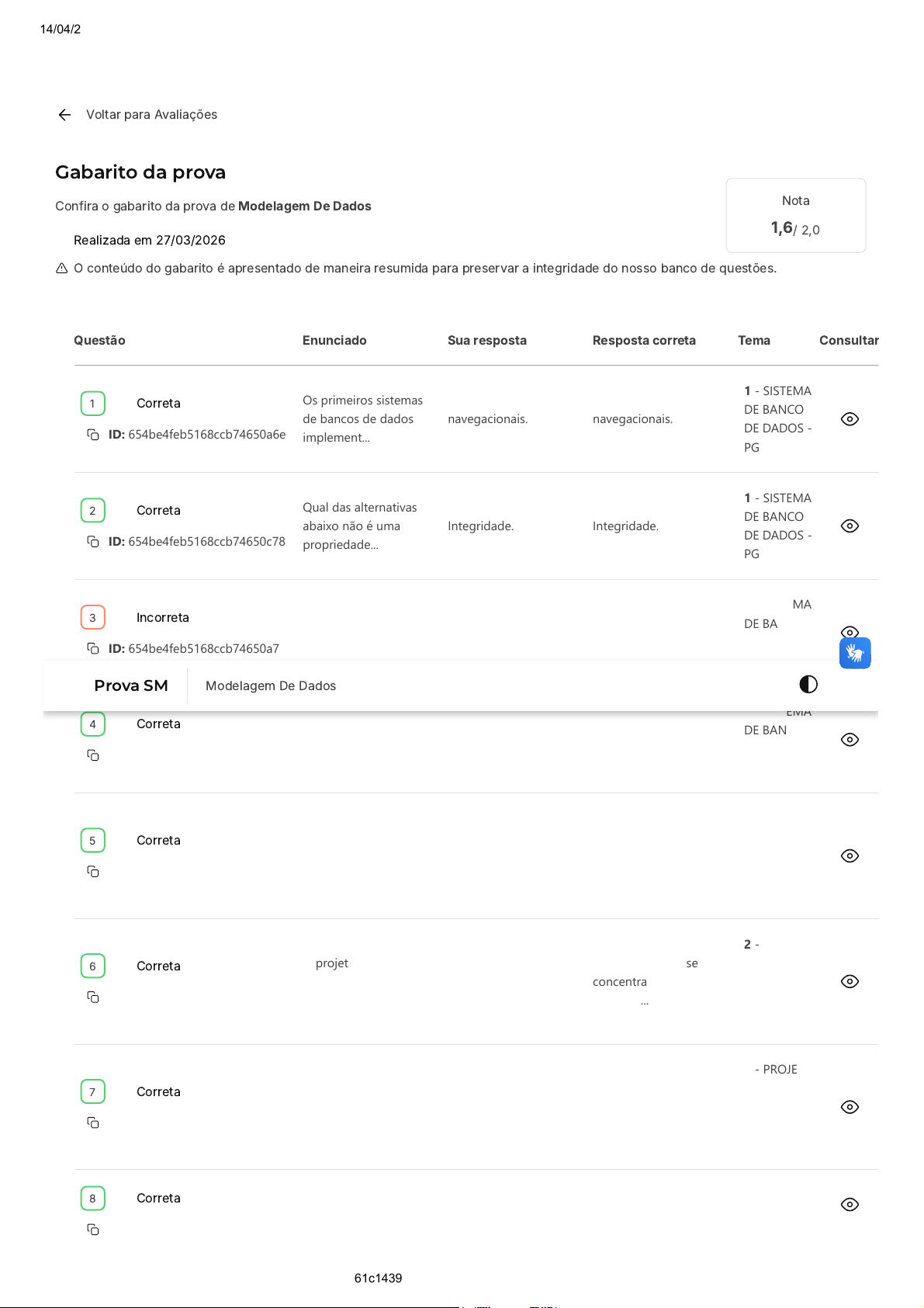 Voltar para Avaliações Gabarito da prova Confira o gabarito da prova de Modelagem De Dados Realizada em 27/03/2026 Nota 1,6/ 2,0 O conteúdo do gabarito é apresentado de maneira resumida para preservar a integridade do nosso banco de questões. Questão Enunciado Sua resposta Resposta correta Tema Consultar Correta ID: 654be4feb5168ccb74650a6e Os primeiros sistemas de bancos de dados implement... navegacionais. navegacionais. 1 - SISTEMA DE BANCO DE DADOS - PG Correta ID: 654be4feb5168ccb74650c78 Qual das alternativas abaixo não é uma propriedade... Integridade. Integridade. 1 - SISTEMA DE BANCO DE DADOS - PG Incorreta ID: 654be4feb5168ccb74650a74 Analise as afirmações abaixo e responda qual alter... Somente a afirmação I está correta. Somente as afirmações I e II estão corretas. 1 - SISTEMA DE BANCO DE DADOS - PG Correta ID: 654be6deb5168ccb7467d77c NoSQL é um termo usado para se referir a uma categ... Não somente SQL. Não somente SQL. 1 - SISTEMA DE BANCO DE DADOS - PG Correta ID: 654be4fdb5168ccb74650864 Na nomenclatura de banco de dados, restrição corre... Semântica Semântica 2 - PROJETO DE BANCO DE DADOS: MODELAGEM CONCEITUAL Correta ID: 654be6deb5168ccb7467d78e O projeto conceitual e o projeto lógico de um banc... O projeto lógico se concentra em detalhes de imple... O projeto lógico se concentra em detalhes de imple... 2 - PROJETO DE BANCO DE DADOS: MODELAGEM CONCEITUAL Correta ID: 654be68eb5168ccb7467843e Considere os seguintes exemplos de atributos conti... I, apenas. I, apenas. 2 - PROJETO DE BANCO DE DADOS: MODELAGEM CONCEITUAL Correta ID: 654be4feb5168ccb74650a68 O Modelo Relacional usa: Uma coleção de tabelas para representar os dados e... Uma coleção de tabelas para representar os dados e... 3 - PROJETO DE BANCO DE DADOS: MODELAGEM 1 2 3 4 5 6 7 8 Prova SM Modelagem De Dados 14/04/2026, 12:00 estacio.saladeavaliacoes.com.br/prova/69c67adc561c14392d5aaa2f/gabarito/reduzido/ https://estacio.saladeavaliacoes.com.br/prova/69c67adc561c14392d5aaa2f/gabarito/reduzido/ 1/2 https://estacio.saladeavaliacoes.com.br/avaliacoes/ LÓGICA E FÍSICA Incorreta ID: 66902fe2ad20d876346fdd2d O que é um modelo físico de dados e ... É um modelo de dados que descreve os dados ... É um modelo de dados que descreve os dados ... 3 - PROJETO DE BANCO DE DADOS: MODELAGEM LÓGICA E FÍSICA Correta ID: 66902f64573958aee7c83fc3 O que é um modelo conceitual de dados e qua... É um modelo de dados que descreve os dados ... É um modelo de dados que descreve os dados ... 3 - PROJETO DE BANCO DE DADOS: MODELAGEM LÓGICA E FÍSICA 9 10 Encontrou algum problema? Você pode copiar o ID da questão e abrir um requerimento. Na tela inicial do Campus Virtual �SIA�, acesse "Atendimento > Requerimento > Novo > Currículo/Aula/horário > Analisar ambiente de avaliação/exercícios" 14/04/2026, 12:00 estacio.saladeavaliacoes.com.br/prova/69c67adc561c14392d5aaa2f/gabarito/reduzido/ https://estacio.saladeavaliacoes.com.br/prova/69c67adc561c14392d5aaa2f/gabarito/reduzido/ 2/2