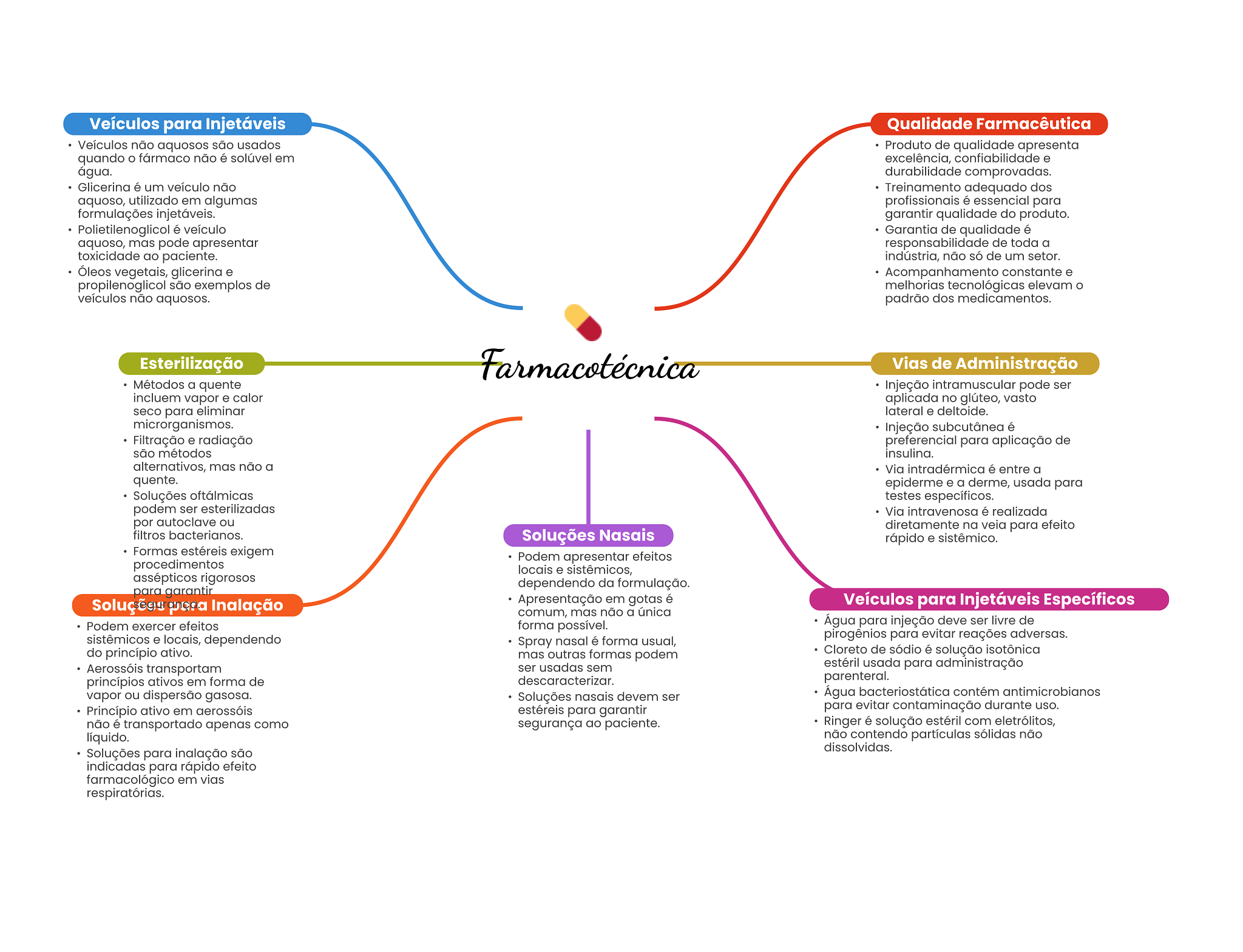 Veículos para Injetáveis Qualidade Farmacêutica Veículos não aquosos são usados Produto de qualidade apresenta quando fármaco não é solúvel em excelência, confiabilidade e água. durabilidade comprovadas. Glicerina é um veículo não Treinamento adequado dos aquoso, utilizado em algumas profissionais é essencial para formulações injetáveis. garantir qualidade do produto. Polietilenoglicol é veículo Garantia de qualidade é aquoso, mas pode apresentar responsabilidade de toda a toxicidade ao paciente. indústria, não só de um setor. Óleos vegetais, glicerina e Acompanhamento constante e propilenoglicol são exemplos de melhorias tecnológicas elevam veículos não aquosos. padrão dos medicamentos. Esterilização Farmacotécnica Vias de Administração Métodos a quente Injeção intramuscular pode ser incluem vapor e calor aplicada no glúteo, vasto seco para eliminar lateral e deltoide. microrganismos. Injeção subcutânea é Filtração e radiação preferencial para aplicação de são métodos insulina. alternativos, mas não a Via intradérmica é entre a quente. epiderme e a derme, usada para Soluções oftálmicas testes específicos. podem ser esterilizadas Via intravenosa é realizada por autoclave ou diretamente na veia para efeito filtros bacterianos. Soluções Nasais rápido e sistêmico. Formas estéreis exigem Podem apresentar efeitos procedimentos locais e sistêmicos, assépticos rigorosos dependendo da formulação. para garantir Inalação Apresentação em gotas é Veículos para Injetáveis Específicos comum, mas não a única Podem exercer efeitos forma possível. Água para injeção deve ser livre de sistêmicos e locais, dependendo Spray nasal é forma usual, pirogênios para evitar reações adversas. do princípio ativo. mas outras formas podem Cloreto de sódio é solução isotônica Aerossóis transportam ser usadas sem estéril usada para administração princípios ativos em forma de descaracterizar. parenteral. vapor ou dispersão gasosa. Soluções nasais devem ser Água bacteriostática contém antimicrobianos Princípio ativo em aerossóis estéreis para garantir para evitar contaminação durante uso. não é transportado apenas como segurança ao paciente. Ringer é solução estéril com eletrólitos, líquido. não contendo partículas sólidas não dissolvidas. Soluções para inalação são indicadas para rápido efeito farmacológico em vias respiratórias.