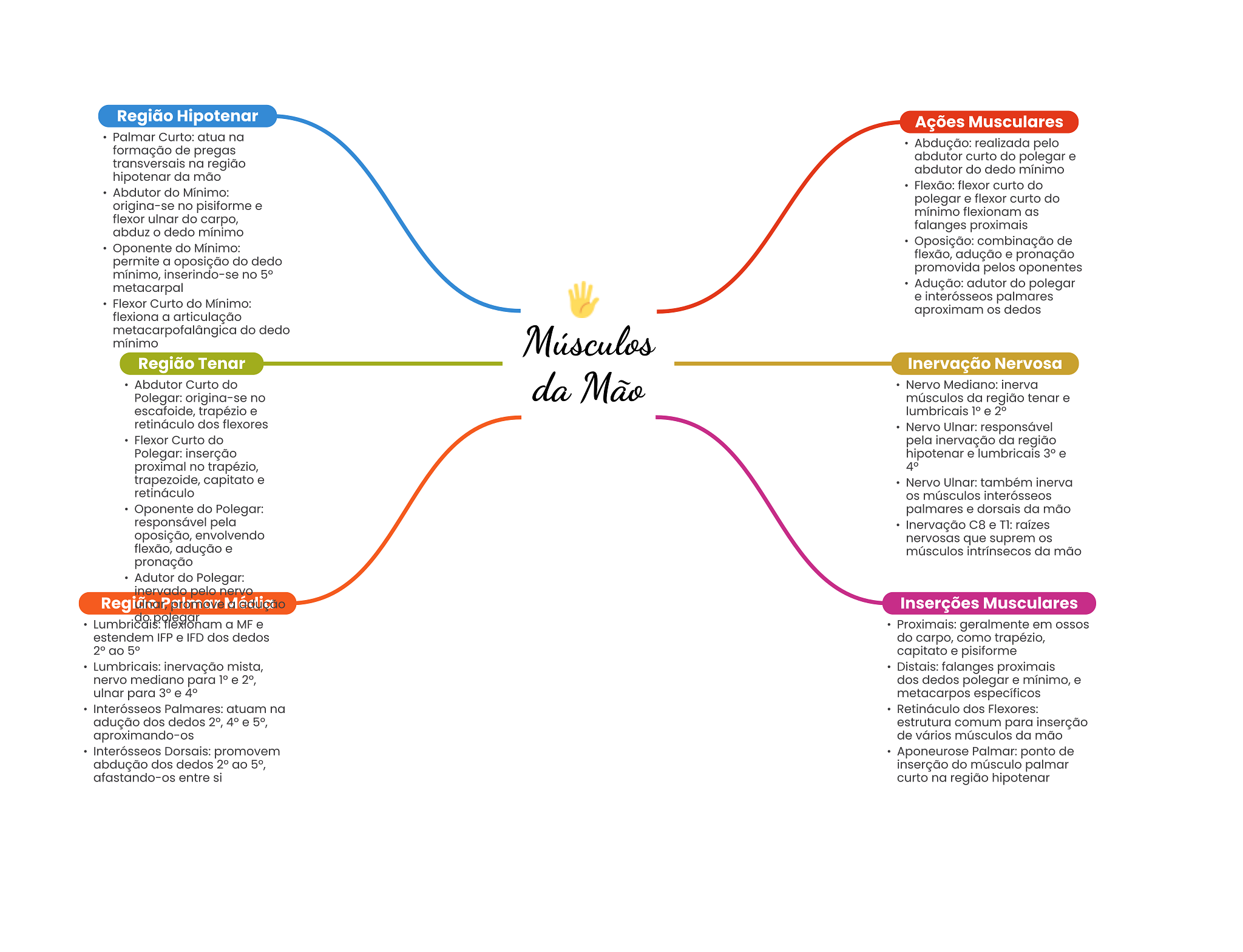 Região Hipotenar Ações Musculares Palmar Curto: atua na Abdução: realizada pelo formação de pregas abdutor curto do polegar e transversais na região abdutor do dedo mínimo hipotenar da mão Flexão: flexor curto do Abdutor do Mínimo: polegar e flexor curto do origina-se no pisiforme e mínimo flexionam as flexor ulnar do carpo, abduz dedo mínimo falanges proximais Oposição: combinação de Oponente do Mínimo: flexão, e pronação permite a oposição do dedo mínimo, inserindo-se no 5° promovida pelos oponentes metacarpal Adução: adutor do polegar Flexor Curto do Mínimo: e interósseos palmares aproximam OS dedos flexiona a articulação metacarpofalângica do dedo mínimo Músculos Região Tenar Inervação Nervosa Abdutor Curto do da Mão Nervo Mediano: inerva Polegar: origina-se no músculos da região tenar e escafoide, trapézio e lumbricais e 2° retináculo dos flexores Nervo Ulnar: responsável Flexor Curto do pela inervação da região Polegar: inserção hipotenar e lumbricais 3° e proximal no trapézio, 4° trapezoide, capitato e Nervo Ulnar: também inerva retináculo OS músculos interósseos Oponente do Polegar: palmares e dorsais da mão responsável pela Inervação C8 e T1: raízes oposição, envolvendo nervosas que suprem flexão, adução e músculos intrínsecos da mão pronação Adutor do Polegar: inervado pelo nervo Inserções Musculares do. polegar Lumbricais: flexionam a MF e Proximais: geralmente em estendem IFP e IFD dos dedos do carpo, como trapézio, 2° ao 5° capitato e pisiforme Lumbricais: inervação mista, Distais: falanges proximais nervo mediano para 1° e 2°, dos dedos polegar e mínimo, e ulnar para 3° e 4° metacarpos específicos Interósseos Palmares: atuam na Retináculo dos Flexores: adução dos dedos 2°, 4° e 5°, estrutura comum para inserção aproximando-os de vários músculos da mão Interósseos Dorsais: promovem Aponeurose Palmar: ponto de abdução dos dedos 2° ao 5°, inserção do músculo palmar afastando-os entre si curto na região hipotenar