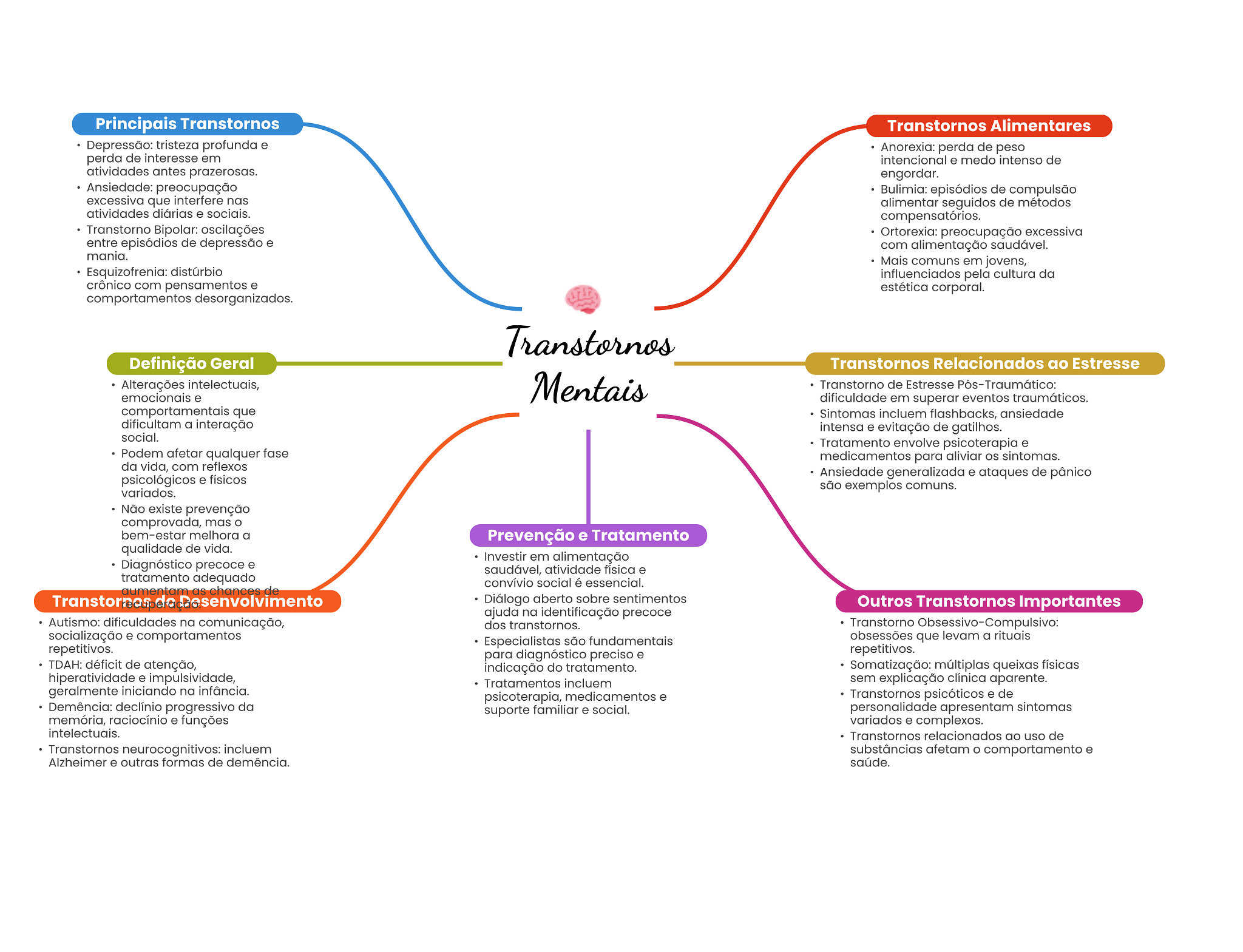 Principais Transtornos Transtornos Alimentares Depressão: tristeza profunda e Anorexia: perda de peso perda de interesse em intencional e medo intenso de atividades antes prazerosas. engordar. Ansiedade: preocupação Bulimia: episódios de compulsão excessiva que interfere nas alimentar seguidos de métodos atividades diárias e sociais. compensatórios. Transtorno Bipolar: oscilações Ortorexia: preocupação excessiva entre episódios de depressão e com alimentação saudável. mania. Mais comuns em jovens, Esquizofrenia: distúrbio influenciados pela cultura da crônico com pensamentos e estética corporal. comportamentos desorganizados. Transtornos Definição Geral Transtornos Relacionados ao Estresse Alterações intelectuais, Mentais Transtorno de Estresse Pós-Traumático: emocionais e dificuldade em superar eventos traumáticos. comportamentais que Sintomas incluem flashbacks, ansiedade dificultam a interação intensa e evitação de gatilhos. social. Tratamento envolve psicoterapia e Podem afetar qualquer fase medicamentos para aliviar sintomas. da vida, com reflexos Ansiedade generalizada e ataques de pânico psicológicos e físicos são exemplos comuns. variados. Não existe prevenção comprovada, mas bem-estar melhora a Prevenção e Tratamento qualidade de vida. Investir em alimentação Diagnóstico precoce e saudável, atividade física e tratamento adequado convívio social é essencial. aumentam as chances de do Desenvolvimento Diálogo aberto sobre sentimentos Outros Transtornos Importantes ajuda na identificação precoce Autismo: dificuldades na comunicação, dos transtornos. Transtorno Obsessivo-Compulsivo: socialização e comportamentos Especialistas são fundamentais obsessões que levam a rituais repetitivos. para diagnóstico preciso e repetitivos. TDAH: déficit de atenção, indicação do tratamento. Somatização: múltiplas queixas físicas hiperatividade e impulsividade, Tratamentos incluem sem explicação clínica aparente. geralmente iniciando na infância. psicoterapia, medicamentos e Transtornos psicóticos e de Demência: declínio progressivo da suporte familiar e social. personalidade apresentam sintomas memória, raciocínio e funções variados e complexos. intelectuais. Transtornos relacionados ao uso de Transtornos neurocognitivos: incluem substâncias afetam comportamento e Alzheimer e outras formas de demência. saúde.