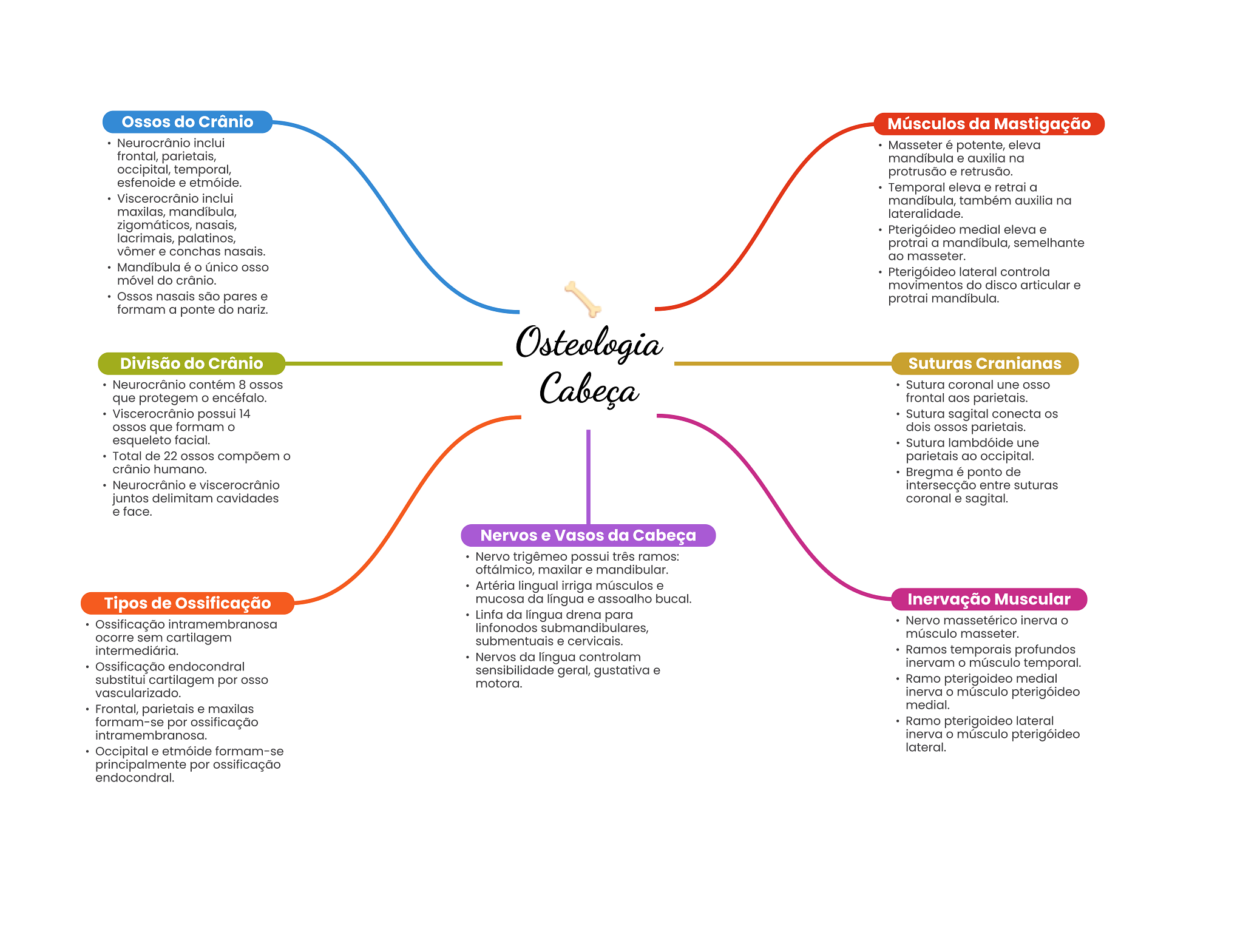Ossos do Crânio Músculos da Mastigação Neurocrânio inclui Masseter é potente, eleva frontal, parietais, mandíbula e auxilia na occipital, temporal, protrusão e retrusão. esfenoide e etmóide. Temporal eleva e retrai a Viscerocrânio inclui mandíbula, também auxilia na maxilas, mandíbula, lateralidade. zigomáticos, nasais, Pterigóideo medial eleva e lacrimais, palatinos, protrai a mandíbula, semelhante vômer e conchas nasais. ao masseter. Mandíbula é único Pterigóideo lateral controla móvel do crânio. movimentos do disco articular e Ossos nasais são pares e protrai mandíbula. formam a ponte do nariz. Osteologia Divisão do Crânio Suturas Cranianas Neurocrânio contém 8 que protegem encéfalo. Cabeça Sutura coronal une frontal aos parietais. Viscerocrânio possui 14 Sutura sagital conecta OSSOS que formam dois parietais. esqueleto facial. Sutura lambdóide une Total de 22 compõem parietais ao occipital. crânio humano. Bregma é ponto de Neurocrânio e viscerocrânio intersecção entre suturas juntos delimitam cavidades coronal e sagital. e face. Nervos e Vasos da Cabeça Nervo trigêmeo possui três ramos: oftálmico, maxilar e mandibular. Artéria lingual irriga músculos e Tipos de Ossificação mucosa da língua e assoalho bucal. Inervação Muscular Linfa da língua drena para Ossificação intramembranosa Nervo massetérico inerva linfonodos submandibulares, ocorre sem cartilagem músculo masseter. submentuais e cervicais. intermediária. Ramos temporais profundos Nervos da língua controlam Ossificação endocondral inervam músculo temporal. sensibilidade geral, gustativa e substitui cartilagem por motora. Ramo pterigoideo medial vascularizado. inerva O músculo pterigóideo Frontal, parietais e maxilas medial. formam-se por ossificação Ramo pterigoideo lateral intramembranosa. inerva músculo pterigóideo Occipital e etmóide formam-se lateral. principalmente por ossificação endocondral.