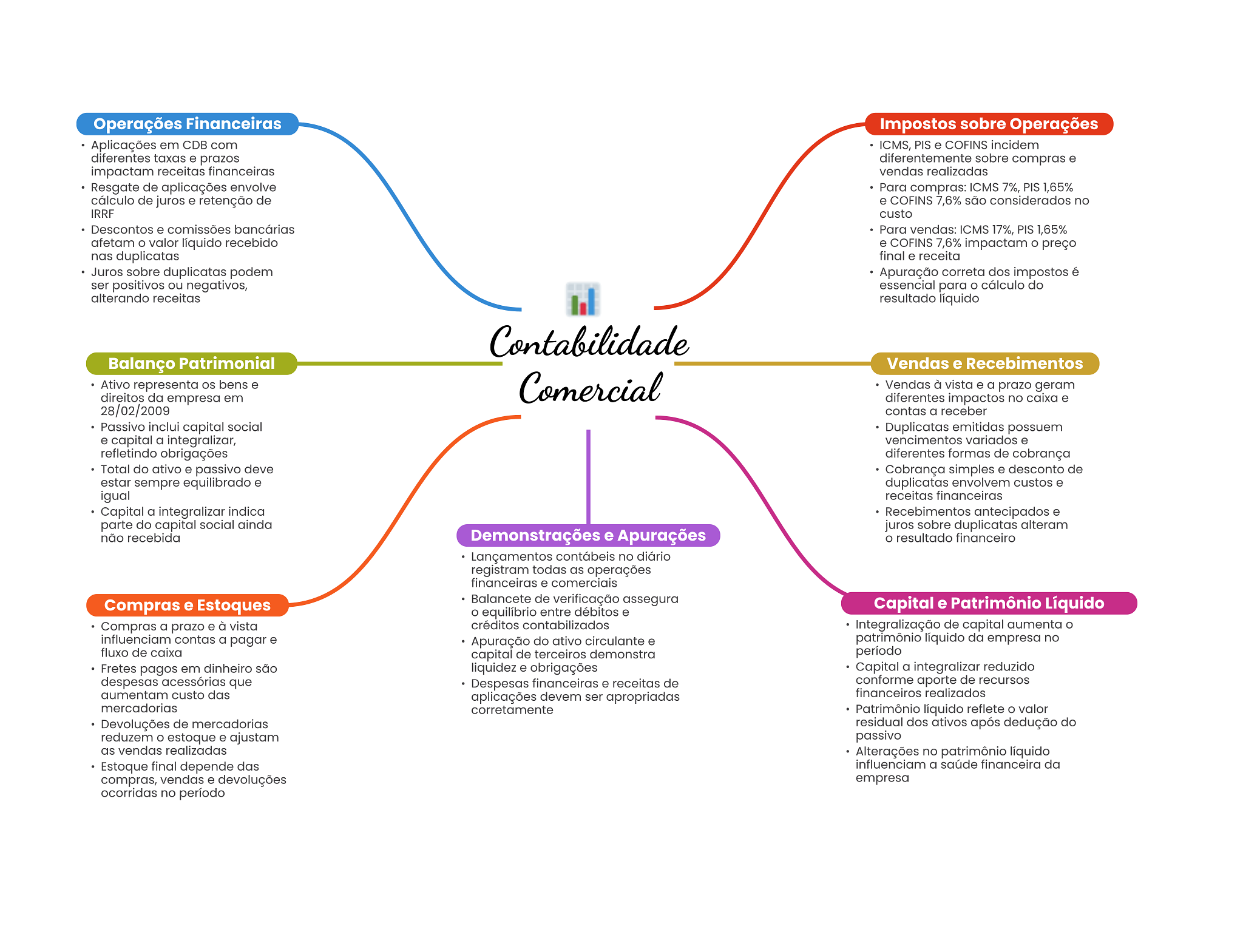 Operações Financeiras Impostos sobre Operações Aplicações em CDB com ICMS, PIS e COFINS incidem diferentes taxas e prazos diferentemente sobre compras e impactam receitas financeiras vendas realizadas Resgate de aplicações envolve Para compras: ICMS 7%, PIS 1,65% cálculo de juros e retenção de e COFINS 7,6% são considerados no IRRF custo Descontos e comissões bancárias Para vendas: ICMS 17%, PIS 1,65% afetam valor líquido recebido e COFINS 7,6% impactam preço nas duplicatas final e receita Juros sobre duplicatas podem Apuração correta dos impostos é ser positivos ou negativos, essencial para cálculo do alterando receitas resultado líquido Contabilidade Balanço Patrimonial Vendas e Recebimentos Ativo representa bens e Comercial Vendas à vista e a prazo geram direitos da empresa em diferentes impactos no caixa e 28/02/2009 contas a receber Passivo inclui capital social Duplicatas emitidas possuem e capital a integralizar, vencimentos variados e refletindo obrigações diferentes formas de cobrança Total do ativo e passivo deve Cobrança simples e desconto de estar sempre equilibrado e duplicatas envolvem custos e igual receitas financeiras Capital a integralizar indica Recebimentos antecipados e parte do capital social ainda juros sobre duplicatas alteram não recebida Demonstrações e Apurações O resultado financeiro Lançamentos contábeis no diário registram todas as operações financeiras e comerciais Compras e Estoques Balancete de verificação assegura Capital e Patrimônio Líquido equilíbrio entre débitos e Compras a prazo e à vista créditos contabilizados Integralização de capital aumenta influenciam contas a pagar e Apuração do ativo circulante e patrimônio líquido da empresa no fluxo de caixa capital de terceiros demonstra período Fretes pagos em dinheiro são liquidez e obrigações Capital a integralizar reduzido despesas acessórias que Despesas financeiras e receitas de conforme aporte de recursos aumentam custo das aplicações devem ser apropriadas financeiros realizados mercadorias corretamente Patrimônio líquido reflete valor Devoluções de mercadorias residual dos ativos após dedução do reduzem estoque e ajustam passivo as vendas realizadas Alterações no patrimônio líquido Estoque final depende das influenciam a saúde financeira da compras, vendas e devoluções empresa ocorridas no período