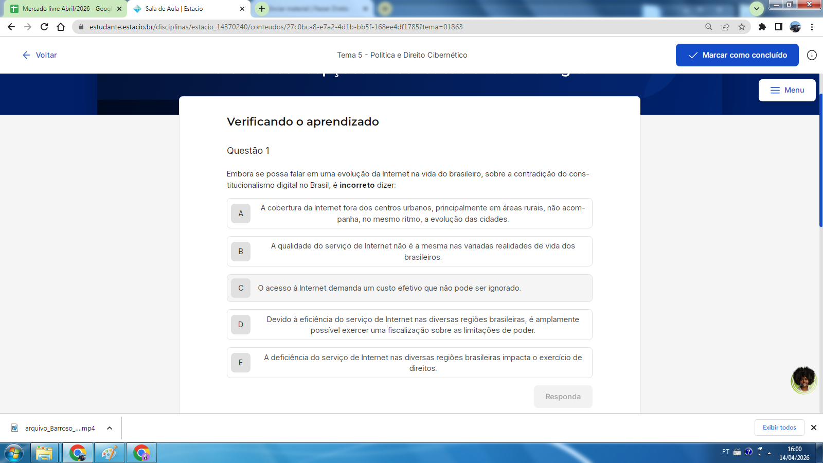 . Mercado livre Abril/2026 Goog Sala de Aula Estacio + Voltar Tema 5 Politica e Direito Cibernético Marcar como concluído i Menu Verificando aprendizado Questão 1 Embora se possa falar em uma evolução da Internet na vida do brasileiro, sobre a contradição do cons- titucionalismo digital no Brasil, é incorreto dizer: A cobertura da Internet fora dos centros urbanos, principalmente em áreas rurais, não acom- A panha, no mesmo ritmo, a evolução das cidades. A qualidade do serviço de Internet não é a mesma nas variadas realidades de vida dos B brasileiros. C acesso à Internet demanda um custo efetivo que não pode ser ignorado. Devido à eficiência do serviço de Internet nas diversas regiões brasileiras, é amplamente D possível exercer uma fiscalização sobre as limitações de poder. A deficiência do serviço de Internet nas diversas regiões brasileiras impacta exercício de E direitos. Responda Exibir todos PT ? 16:00 14/04/2026