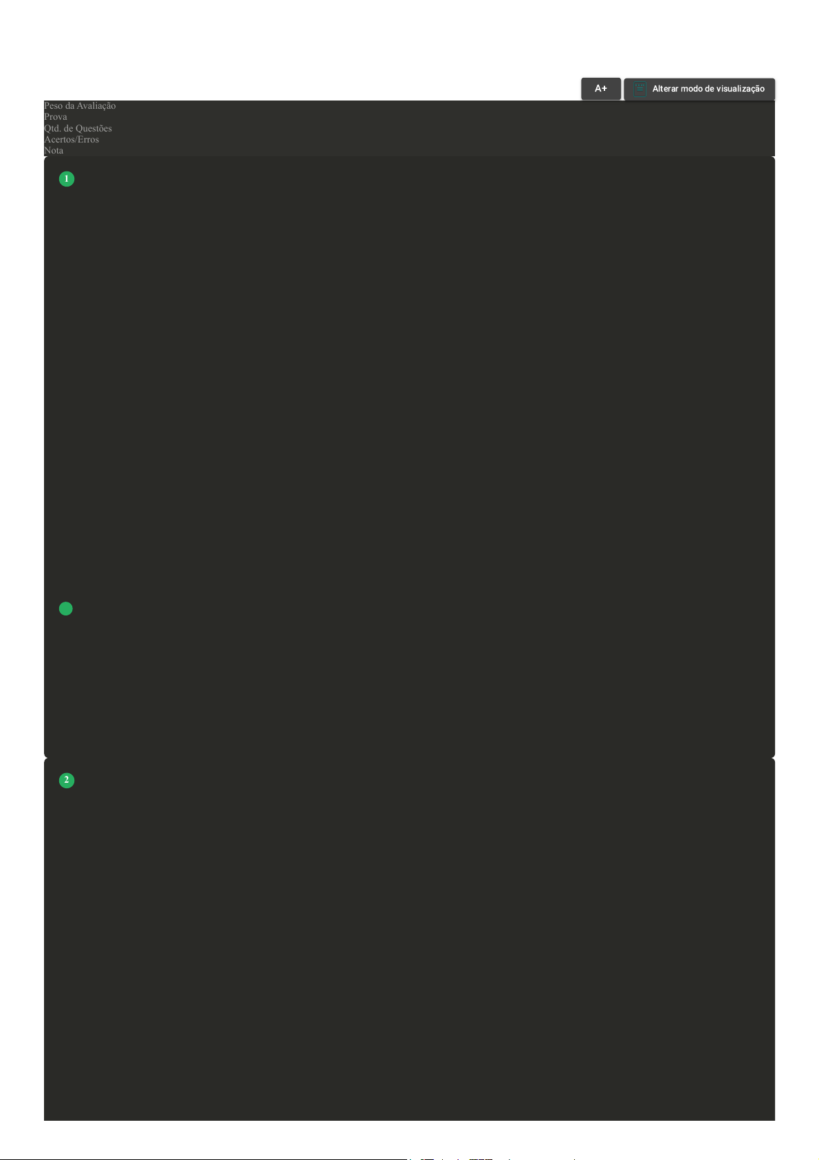 Prova Impressa GABARITO | Avaliação I - Individual (Cod.:1596995) Peso da Avaliação 1,50 Prova 116183441 Qtd. de Questões 10 Acertos/Erros 9/1 Nota 9,00 O que torna bom um professor é a capacidade de realizar todas as tarefas envolvidas em uma instrução eficaz. Calor humano, entusiasmo e carinho são essenciais (MARZANO, 2011; ALVES, 1994), assim como o conhecimento do conteúdo e a compreensão de como as crianças aprendem (BAUMERT et al., 2010; TOUGH, 2017). Quanto à denominação utilizada para criar um elo entre o que um professor deseja que os alunos aprendam e a aprendizagem real dos alunos, classifique V para as sentenças verdadeiras e F para as falsas: ( ) O elo entre o que um professor deseja que os alunos aprendam e a aprendizagem real dos alunos é chamado de instrução ou pedagogia. ( ) A instrução eficaz exige o uso de muitas estratégias. ( ) O elo entre o que um professor deseja que os alunos aprendam e a aprendizagem real dos alunos é chamado de instrumentação ou psicologia. ( ) A instrução eficaz não é uma simples questão de uma pessoa com mais conhecimento transmitir esse conhecimento para outra. Assinale a alternativa CORRETA: FONTE: BAUMERT, J. et al. Teachers’ mathematical knowledge, cognitive activation in the classroom, and student progress. American Educational Research Journal, Washington, v. 47, n. 1, p. 133-180, 2010. MARZANO, R. J.; PICKERING, D. J.; POLLOCK, J. E. Classroom instruction that works: research-based strategies for increasing student achievement. Alexandria: ASCD, 2001. TOUGH, P. Como as crianças aprendem: o papel da garra, da curiosidade e da personalidade no desenvolvimento infantil. 2. ed. Rio de Janeiro: Intrínseca, 2017. A V - V - F - V. B V - F - F - V. C F - V - F - F. D V - F - V - F. Para Piaget, as pessoas progridem por meio de quatro estágios de desenvolvimento cognitivo entre o nascimento e a idade adulta. Cada estágio é marcado pelo surgimento de novas habilidades intelectuais que permitem às pessoas compreenderem o mundo de maneiras cada vez mais complexas. O autor define as idades aproximadas em que crianças e adolescentes passam pelos quatro estágios. Com base no exposto, associe os itens, utilizando o código a seguir: I- Sensório-motor. II- Pré-operatório. III- Operacional concreto. IV- Operacional formal. ( ) De 7 a 11 anos. ( ) A partir dos 11 anos. VOLTAR A+Aumentar, FonteAlterar modo de visualização 1 2 ( ) De 2 a 7 anos. ( ) Do nascimento aos 2 anos. Assinale a alternativa que apresenta sequência CORRETA: A II - IV - I - III. B III - IV - II - I. C III - I - IV - II. D I - II - III - IV. A psicologia educacional e da aprendizagem não pode dizer a você, como futuro professor, o que fazer, mas pode fornecer os princípios a serem usados para tomar uma boa decisão e uma linguagem para discutir suas experiências e pensamentos. Considere o caso de Eliane Medeiros e Lídia Weber. Nada neste ou em qualquer outro texto de psicologia educacional dirá exatamente como ensinar escrita criativa a um determinado grupo de alunos do quarto ano. Com base no caso de Eliane Medeiros e Lídia Weber, quais os conceitos utilizados por Lídia para considerar como ela vai ensinar a escrever e, então, interpretar e resolver os problemas que ela encontra, bem como para explicar a Eliane o que ela está fazendo? A Conceitos de sociologia educacional e da aprendizagem. B Conceitos de psicologia educacional e da tecnologia. C Conceitos de engenharia educacional e da aprendizagem. D Conceitos de psicologia educacional e da aprendizagem. Em sua teoria, Piaget dividiu o desenvolvimento cognitivo de crianças e adolescentes em quatro estágios. Cada um dos estágios possui uma idade e características específicas do desenvolvimento. Estes estágios formam, como Piaget descreveu, o desenvolvimento de crianças e adolescentes em suas respectivas etapas. Sobre o estágio operacional concreto, assinale a alternativa INCORRETA: A Crianças no estágio operacional concreto são egocêntricas em seu pensamento. As crianças nesta fase acreditam que todos veem o mundo exatamente como elas. B Neste estágio, o indivíduo já possui a capacidade de mudar a direção do pensamento para voltar a um ponto de partida. C O indivíduo é capaz de responder à realidade inferida, vendo as coisas no contexto de outros significados. D As crianças aprendem durante o estágio operacional concreto a seriação, ou organizar as coisas em uma progressão lógica. Vejamos a seguinte situação hipotética: O professor Haroldo ministra aula de História no oitavo ano. Ele tem um problema com o aluno Thomas, que frequentemente se comporta mal. Hoje, quando o professor Haroldo virou as costas, Thomas fez um avião de papel e o atirou para voar pela sala de aula para o deleite de toda a turma. O que o professor Haroldo deve fazer? Como um professor intencional, ele considera uma série de opções para resolver esse problema, cada uma delas proveniente de uma teoria sobre por que Thomas está se comportando mal e o que o motivará a se comportar de maneira mais adequada. Sobre o exposto, associe os itens, utilizando o código a seguir: I- Repreenda o Thomas. II- Ignore o Thomas. 3 Revisar Conteúdo do Livro 4 5 III- Envie o Thomas à sala da supervisora. IV- Diga à turma que é responsabilidade de todos manter um bom ambiente de aprendizagem e que se algum aluno se comportar mal, 5 minutos serão subtraídos do recreio. ( ) Ser mandado para a sala da supervisora é punitivo. Também priva Thomas do (aparente) apoio de seus colegas de classe. ( ) Thomas está se comportando mal para chamar a atenção de seus colegas. Se toda a turma perder quando ele se comportar mal, a turma o manterá na linha. ( ) A atenção pode ser gratificante para Thomas. Ignorá-lo o privaria dessa recompensa. ( ) A reprimenda é uma forma de punição. Thomas vai se comportar bem para evitar punições. Assinale a alternativa que apresenta a sequência CORRETA: A