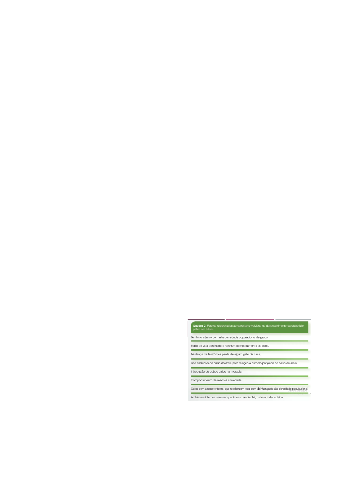 CLÍNICA MÉDICA DE PEQUENOS ANIMAIS 20/09/2024 - AULA ONLINE ➽ DOENÇAS RENAIS Cistite idiopática felina - SÍNDROME DE PANDORA ⇨ É uma consequência inflamatória que pode ou não ter uma infecção. Se tiver infecção bacteriana: cistite bacteriana. ⇨ É uma cistite irritativa, inflamatória. ⇨ ENVOLVIMENTO: psico (quais as condições de ambiente - disputa de território, animais que entram), neuro (influência do sistema nervoso simpático), endócrino e imune. PREDISPOSIÇÃO ● Idade: 2 a 6 anos ● Qualquer sexo Mas lembre-se que macho tem uma uretra mais fina. ● Dieta seca: mas o problema não é nem esse, é a falta de água. O gato não bebe água, ele come a água, a falta do acesso a água junta com a dieta e são fatores importantes para ter a CIF. Tem que tentar readaptar a alimentação com a água misturada. ● Animais adultos na forma mais ativa, porém já está tendendo de animais de todas as idades (filhote a idosos) ● Os mediadores químicos, a composição da vesícula urinária, é influenciado pela gestação da mãe. ● Siamês e suas variantes são mais predispostos. Mas observa-se animais de rua, de criatórios, por causa do ambiente que vive. ● Consumo de água baixo (é natural do gato, então temos que facilitar isso) ● Sobrepeso, sedentários ● O gato inteiro é procriação mas o castrado não tem mais estímulo (caça, brincadeira) e se torna sedentário ganhando peso. Falta de atividade e motivação, então temos que dar motivação. ● Animais confinados, local com bastante população de gatos: É UM FATOR, o animal confinado fica preso, sem estímulo, leva a ansiedade, estresse, leva a um gatilho a ter CIF. ● Distresse: o problema é quando o estresse vira crônico, o cérebro começa a usar demais adrenalina, noradrenalina. Fica em hipervigilância. É patológico. Não vem somente de um momento, ele vem de meses, de anos antes. O desencadear da cistite é causado de coisas que aconteceram antes, não é pontual do momento. Gato gosta de rotina, sente padrões de comportamento. ➤ QUAIS SÃO OS FATORES RELACIONADOS COM O ESTRESSE ⇨ Família ansiosa = gato ansioso ⇨ Tem gato que se estressa com mudança de sofá. Hipotálamo libera CRH que libera ACHTH e libera cortisol. O cortisol vai no tronco encefálico ativa o sistema nervoso simpático. Tem a adrenalina para fugir da situação de estresse. Mas quando isso é crônico, tem uma estimulação frequente. O estresse do cortisol, vai ter liberação da catecolamina, pela liberação simpática vai até a vesícula urinária desencadeia um processo inflamatório, edema, sangue e essa urina com esses fatores IL inflamatórios começa a causar lesão na parede da vesícula que causa a cistite. Tem a liberação do processo inflamatório, esses mastócitos se ligam nos nervos sensoriais, vai causar todo um processo inflamatório na mucosa, na submucosa, diminui a produção dessa camada protetora de glicosaminoglicanos. Pelo nervo sensorial e pela urina, tem um desgaste dessa camada, então tem contato da urina com a parede da bexiga. ➤ SINAIS CLÍNICOS - Periúria (urina em locais diferentes) - Disúria (dor para urinar) - Estrangúria, é uma disúria piorada (dor + tempo prolongado) - Disúria (pior ainda, dor + um tempão para urinar e não tem sucesso) - Iscúria - Hematúria Ele cava areia, ele cheira, circula e cobre a urina. O gato com sinais clínicos da CIF ele adota a posição de esforço. Os sinais clínicos são autolimitantes, recorrentes, persistentes ou obstrutivos. - Obstrutivo -> mais grave, começa a conter ureia, creatinina, potássio e faz sinais de azotemia pós renal (problema não está no rim e sim na eliminação). - Paratormônio = muito tóxico, precisa eliminar. - Podem desencadear sinais em outros sistemas: TGI, pele, respiratório, cardiovascular, SNC, endócrino. - Pode desenvolver doença intestinal inflamatória - Tem animais que começam a fazer alopecia psicogênica da região inguinal bilateral simétrica. Veja se não é comportamental ou alérgica. - Cardiomiopatia hipertrófica COMPORTAMENTAIS - Marcação urinária/arranhaduras inadequadas em sofá, cama - Eliminação inadequada (marcação urinária em vários locais da casa, fêmeas podem fazer quando se sentem ameaçadas). - Hiper-reatividade / hipervigilância - Agressividade (irritativa, medo, redirecionada) - Apático - Vocalizações - Autolimpeza excessiva ou diminuída ➤ DIAGNÓSTICOS DIFERENCIAIS Urólitos, cistite bacteriana, neoplasias vesicais, pólipos vesicais ➤ EXAMES COMPLEMENTARES É por exclusão Ultrassom: pode ver cálculo, mucosa da parede espessada, neoplasia. Não fecha diagnóstico. Urinálise: para confirmar se tem a cistite bacteriana ou cif, lembrando que ele pode ter cif e fazer cistite bacteriana. Vai apresentar sinais de inflamação. Urólitos pode ser secundário à CIF. pH muda. O que vamos ver na urinálise da cistite bacteriana secundária a CIF: bactéria. CIF: NÃO TEM BACTÉRIA. Vai aparecer leucócitos, proteínas, hemácias, células vesicais (pela descamação), se é bacteriano, tem bactéria. Vesícula urinária descama: células vesicais descamativas, hemácias, leucócitos, proteína (que pode ser da bactéria, hemácias). QUEM CONTROLA DENSIDADE DA URINA: rim e hormônios. Na CIF a densidade vai aumentar porque vai ter mais SEDIMENTOS (solutos). Os laboratórios colocam que o valor de referência da densidade é de 1015-1045 mas os gatos, em si, o limite é de 1030-1040. Quanto mais baixo, mais diluído está a urina. Se o animal estiver obstruído faz ureia, creatinina, potássio (arritmia e leva a morte) para ver o grau que está pensando na toxicidade. Hemograma: o animal pode ter CIF não vai apresentar mas ele pode estar com a imunidade por causa do estresse, será que o animal não é FIV, FELV? Utiliza como um complemento do que a doença pode interferir. QUAIS OS SINAIS NO HEMOGRAMA DE UM QUADRO INFLAMATÓRIO E INFECCI