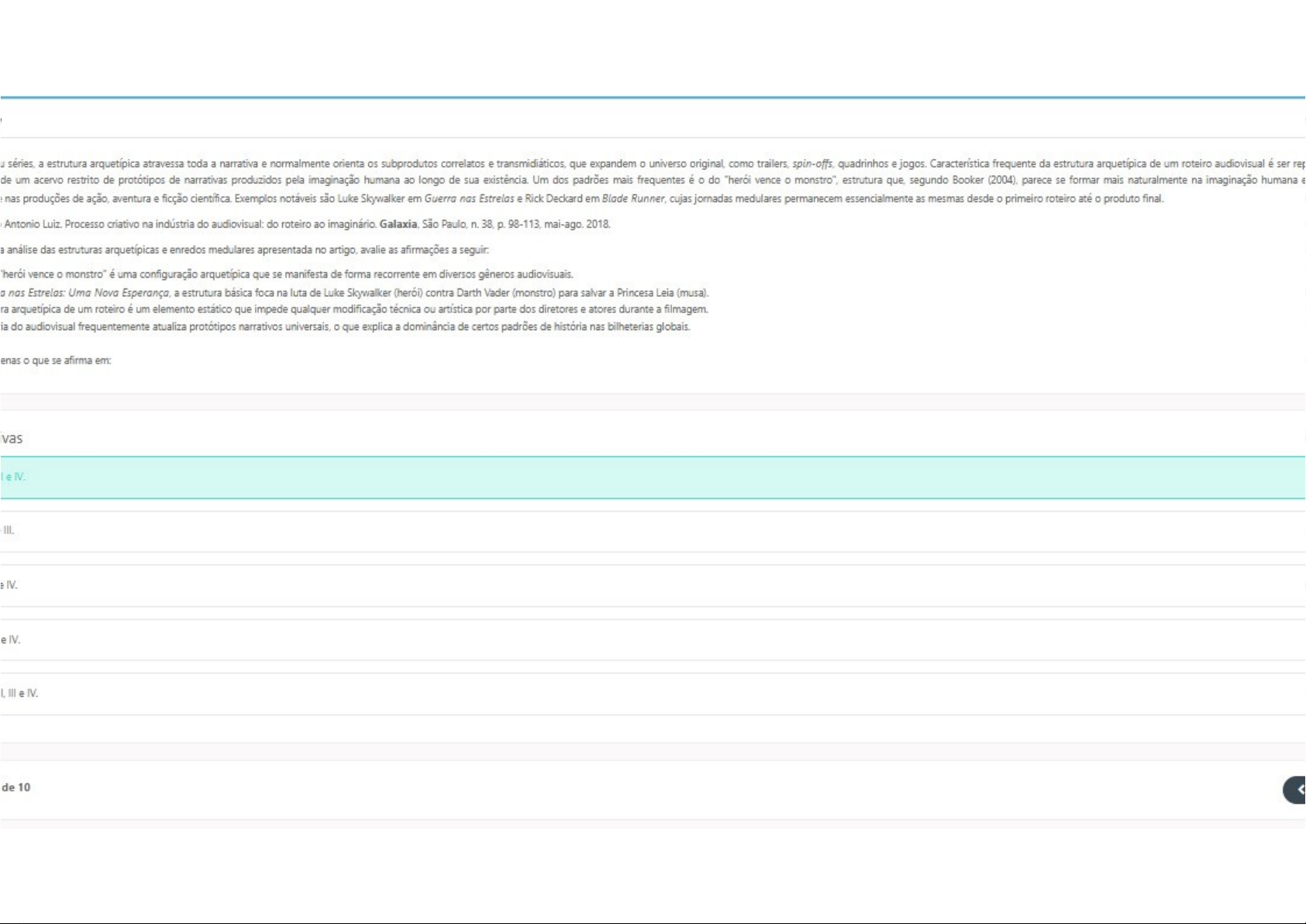séries, a estrutura arquetípica atravessa toda a narrativa e normalmente orienta os subprodutos correlatos e que expandem universo original, como trailers, spin-offs, quadrinhos e jogos. Característica frequente da estrutura arquetípica de um roteiro audiovisual é ser rep de um acervo restrito de protótipos de narrativas produzidos pela imaginação humana ao longo de sua existência. Um dos padrões mais frequentes é do "herói vence monstro", estrutura que, segundo Booker parece se formar mais naturalmente na imaginação humana e nas produções de ação, aventura e ficção Exemplos notáveis são Luke Skywalker em Guerra nas Estrelas e Rick Deckard em Blade Runner, cujas jornadas medulares permanecem essencialmente as mesmas desde primeiro roteiro até o produto final. Antonio Luiz. Processo criativo na indústria do audiovisual: do roteiro ao imaginário. São Paulo, n. 38, 98-113, mai-ago. 2018. análise das estruturas e enredos medulares apresentada no artigo, avalie as afirmações a vence o monstro" é uma configuração que se manifesta de forma recorrente em diversos gêneros audiovisuais. nas Estrelas: Uma Nova Esperança, a estrutura básica foca na luta de Luke Skywalker (herói) contra Darth Vader (monstro) para salvar a Princesa Leia (musa). arquetípica de um roteiro é um elemento estático que impede qualquer modificação técnica ou artística por parte dos diretores e atores durante a filmagem. do audiovisual frequentemente atualiza protótipos narrativos universais, que explica a dominância de certos padrões de história nas bilheterias globais. o que se afirma em: e IV. III. IV. e IV. III e IV. de 10