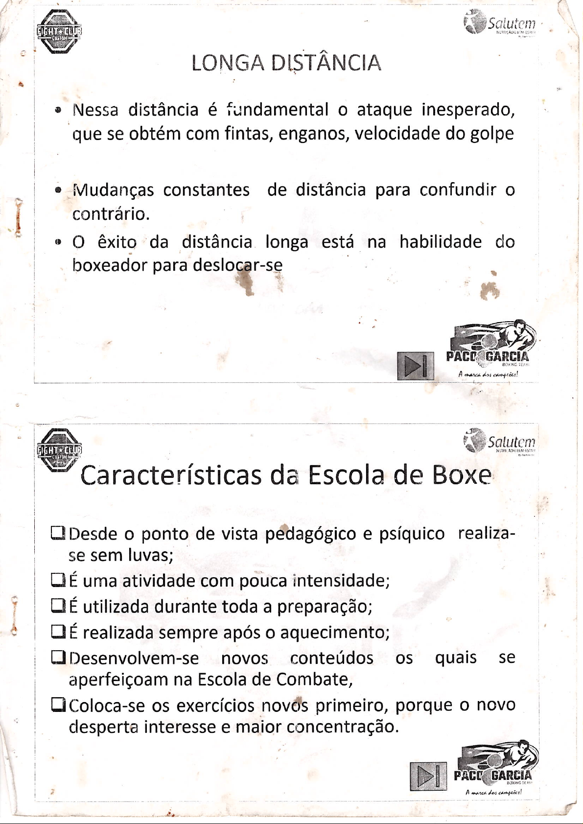 Salutem CUSTOM LONGA DISTÂNCIA Nessa distância é fundamental ataque inesperado, que se obtém com fintas, enganos, velocidade do golpe Mudanças constantes de distância para confundir contrário. O êxito da distância longa está na habilidade do boxeador para deslocar-se GARCIA BOXING TEAM A march dos Salutem NUTRI ADE BEM ESTAR Características da Escola de Boxe Desde ponto de vista pedagógico e psíquico realiza- se sem luvas; É uma atividade com pouca intensidade; É utilizada durante toda a preparação; É realizada sempre após aquecimento; Desenvolvem-se novos conteúdos os quais se aperfeiçoam na Escola de Combate, Coloca-se os exercícios novos primeiro, porque novo desperta interesse e maior concentração. GARCIA BOXING A marcaSalutem ESTAR CUSTOM A Escola de COMBATE É outro tipo de CARACTERÍSTICAS: treinamento que 1. Realiza-se após o aquecimento e a possibilita-nos 2. Em pares ou duplas ensino e 3. Com luvas atendendo ao aperfeiçoamento dos peso das mesmas (Ex: 16 elementos da técnica oz) e tática. 4. A complexidade das tarefas depende do período e etapa da preparação em que se encontram os atletas. GARCIA BOXING TEAM A marca dos Salutem FIGHT CLUB CUSTOM Classificação Escola de Combate Dirigida Livre Condicionada Livre É quando professor É quando o professor É quando os alunos dirige todo as as tarefas a condiciona as tarefas Executam livremente realizar pelos alunos as técnicas e táticas de combate GARCIA BOXING TEAM A dosSalutem ESTAR COMO TREINAR BOXE MODERNO NAS ESCOLAS DE COMBATES? Criando linhas de ataques procurando diferentes ângulos Contra-atacando mais rápido possível, antes que nosso adversário adote posições ofensivas Deslocamentos em ângulos para a direita e esquerda, giros, shuffles. GARCIA BOXING TEAM A marca dos Salutem TRABALHOS PRÁTICOS DE EB/ECD/ECLC/ECL BEM-ESTAR CUSTOM 1: OBJETIVO: Saída por ângulos Escola de Boxe (EB) Boxeadores sem executar golpes se deslocam e saem por ângulos Boxeadores se deslocam em círculo, e ao comando do professor atacam saindo por ângulos Boxeador 1/ Deslocando-se trabalham Reto de Esquerda, Saindo por ângulos fazendo defesa Boxeador 2/ Contra-ataca Reto de Esquerda ESCOLA DE COMBATE DIRIGIDA (E.C.D) Round 1: Boxeador 1/ Se desloca em círculos/ ataca Reto de Esquerda e sai por ângulos Boxeador 2/ Defende Round 2: Trocam Round 3: Boxeador 1/ Se desloca em círculos/ataca Reto de Esquerda e sai por ângulos Boxeador 2/ Defende e Contra-ataca Reto de Esquerda ou Direita Round 4: Trocam ESCOLA COMBATE LIVRE CONDICIONADA (E.C.L.C) Round 5: Boxeador 1/ Se desloca em círculos atacando com Reto de Esquerda saindo pela lateral/ contra-atacando livre Boxeador 2/ Contra-ataca 1-2 isolados Round 6: Trocam ESCOLA COMBATE LIVRE (E.C.L) Round 7: Livre GARCIA BOXING TEAM A marca dosFIGHT*CLUB GIROS E PIVÔS COMPOSTOS Salutem BEM ESTAR CUSTOM ESCOLA DE BOXE (EB) Boxeadores com o pé fixo giram à esquerda e à direita em Passos compostos para a Direita e Esquerda ESCOLA DE COMBATE CONDICIONADA (E.C.D) Round 1: Boxeador 1/ Ataca Reto de Esquerda Boxeador 2/ Defende e Gira à Esquerda e Direita Contra-atacando com um Golpe Round 2: Trocam Round 3: Boxeador 1/ Ataca Reto de Esquerda Boxeador 2: Defende/ Passo composto à Esquerda e Direita e Contra-ataca Round 4: Trocam ESCOLA DE COMBATE LIVRE CONDICIONADA (E.C.L.C) Round 5: Boxeador 1/ Ataca Reto de Esquerda Boxeador 2: Defende/Passo Composto e Contra-ataca Livre Round 6: Trocam Round 7: Livre 50-60% GARCIA BOXING TEAM A marca dos Salutem FIGHT* CUSTOM SHUFFLES PARA AMBOS OS LADOS ESCOLA DE BOXE (EB) Shuffles para ambos os lados Fixo Passo lateral /Direita à Frente/Shuffles Passo Lateral à Esquerda /Shuffles ESCOLA DE COMBATE DIRIGIDA (E.C.D.) Round 1: Boxeador 1/ Ataca Reto de Esquerda e Direita Boxeador 2: Passo diagonal/ direita à frente/Shuffles/Contra-ataca Defesa com Passo lateral à Esquerda/ Shuffles/Contra-ataca Round 2: Trocam Round 3: Boxeador 1/ Ataca Reto de Esquerda e Direita Boxeador 2/ Defende/Passo Diagonal/Direita à Frente/Shuffles/Contra-ataca/Shuffles Para a Esquerda/Ataca Defesa com Passo à Para a Direita e Ataca Round 4: Trocam ESCOLA COMBATE LIVRE CONDICIONADA(ECLC) Round 5: Boxeador 1/ Livre com Retos Isolados Boxeador 2: Defesas/Shuffles e contra-ataca Livre Round 6: Trocam ESCOLA DE COMBATE LIVRE (ECL) 50 a 60% Round 7: Livres GARCIA BOXING TEAM A marca dosSalutem ESTAR COMO GOLPEAR O SACO UTILIZANDO O BOXE MODERNO Marcar saco com um X para melhorar a precisão e exatidão no golpe Exercícios onde trabalha-se : Potência Velocidade Mobilidade - Troca de Ritmos GARCIA BOXING TEAM A dos FIGHT*CLUB POTÊNCIA Salutem CUSTOM Tempo de trabalho: 45" bloco: 1-2-1-2 / Velocidade/potência, Defesa 5-3-5 Força 3-5-3 bloco 1-2-3/ Velocidade/potência, Defesa 1-2-5 2-5 Força 2+3 bloco 1-2/ Velocidade/potência, passo atrás 2-5 Força 2+3 bloco 1/ passo atrás, volta, esquiva/3-4 5+6 Velocidade, potência/Força 3-3 5+5 GARCIA BOXING TEAM A dosSalutem VELOCIDADE ADE ESTAR CUSTOM - Tempo de Trabalho: 6x (20"velocida/Força X 10"rapidez) - 1- (1-2 Duplo pêndulo 5-2), (rápidos golpes na curta) 3+2 - 2- (1-2 Duplo pêndulo ( rápidos na meia), - 3- (1-esquiva/5-2 esquiva/4-3), (rápido na longa), 3+2 6+5 - 4- (1-2 esquiva circular direita (rápido na curta) 5+5 - 5- (1-2-3-5 passo atrás 6-3), (rápidos na meia) 4+5 - 6- (1-2-3-4 passo atrás 5-2-5), (rápidos na longa) 3+2+3 GARCIA BOXING TEAM A march dos Salutem ESTAR CUSTOM MOBILIDADE - 45" (sempre mexendo as pernas) 1-2-3 Rápido- sai para lateral esquerda/ cruzado de direta/ volta/ esquerda com movimentação das pernas Ataca 1 passo atrás/contra-ataca/ 2 passo atrás volta 2-5 Giros 2+3 - 1-2 giro composto à direta/ 3 corpo-6 +4 5 - 1-2-5 pivôs composto à esquerda/ 4-5 com giro 1r2r3 6+ GARCIA BOXING TEAM A marca dosSalutem TROCAS DE RITMO NUTRICADE BEM ESTAR CUSTOM Mudanças de ritmo de golpe, com golpes fortes - 03 intensidades: Baixa, Média e Alta (6 X 30")- repete-se 1-I