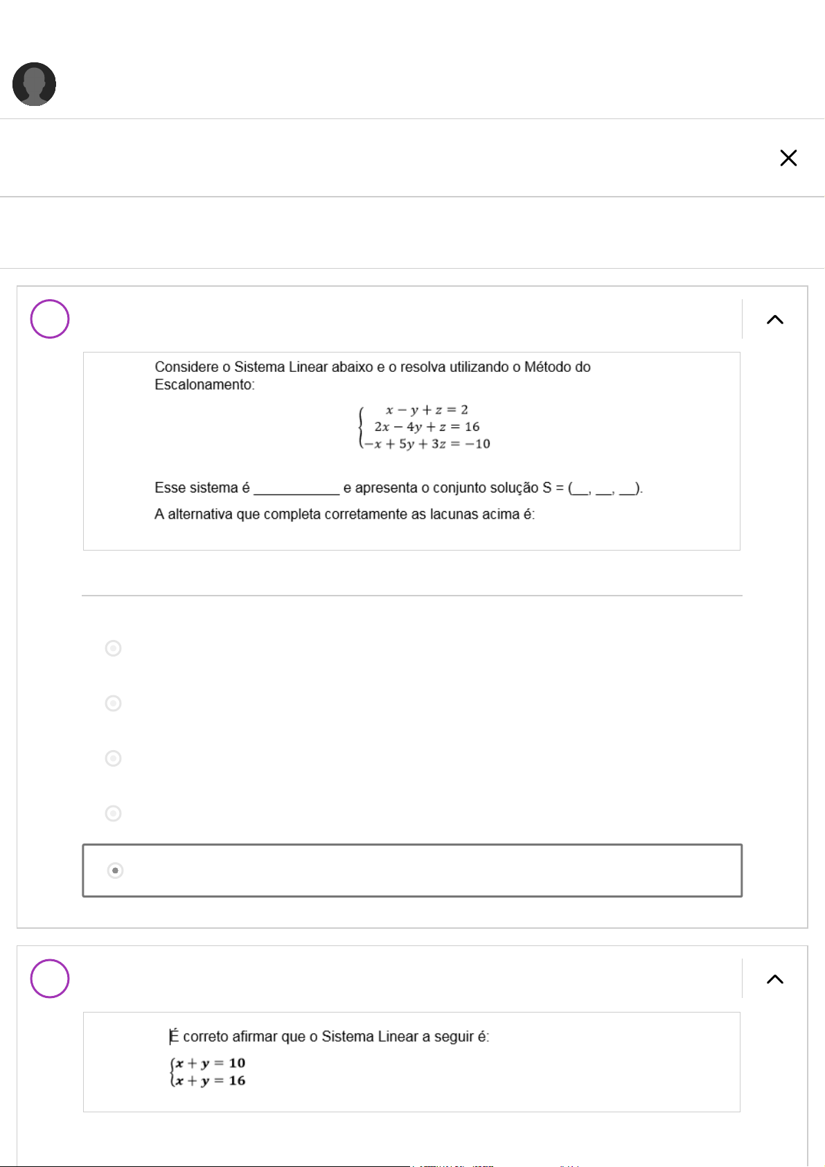 Atividade de Sistematização – Unidade IV 1 MÚLTIPLA ESCOLHA 0,25 / 0,25 2 MÚLTIPLA ESCOLHA 0,25 / 0,25 A SPD e S = (1, 3, 3) B SPI C SI D SPD e S = (1, 3, -3) E SPD e S = (-16, -10, 8) Os comentários estarão disponíveis após a data de entrega As respostas corretas estarão disponíveis após a data de entrega ENVIADO: 14/04/26 17:34 RECIBO: 211120FC847F4D60A44D64C86EFCDC52 1 / 1 Nota final Tentativa com a nota mais alta 1 / 1 3 MÚLTIPLA ESCOLHA 0,25 / 0,25 4 MÚLTIPLA ESCOLHA 0,25 / 0,25 A SPD B SI C Nenhuma das anteriores. D SP E SPI A S = (-1, -3, -2) B O sistema é impossível. C S = (1, 3, 2) D S = (-1, -2, -3) E S = (1, 2, 3) A S = (4, 2, -5) B S = (4, -2, 5) C S = (-4, -2, 5) D O sistema é impossível. E S = (4, 2, 5)