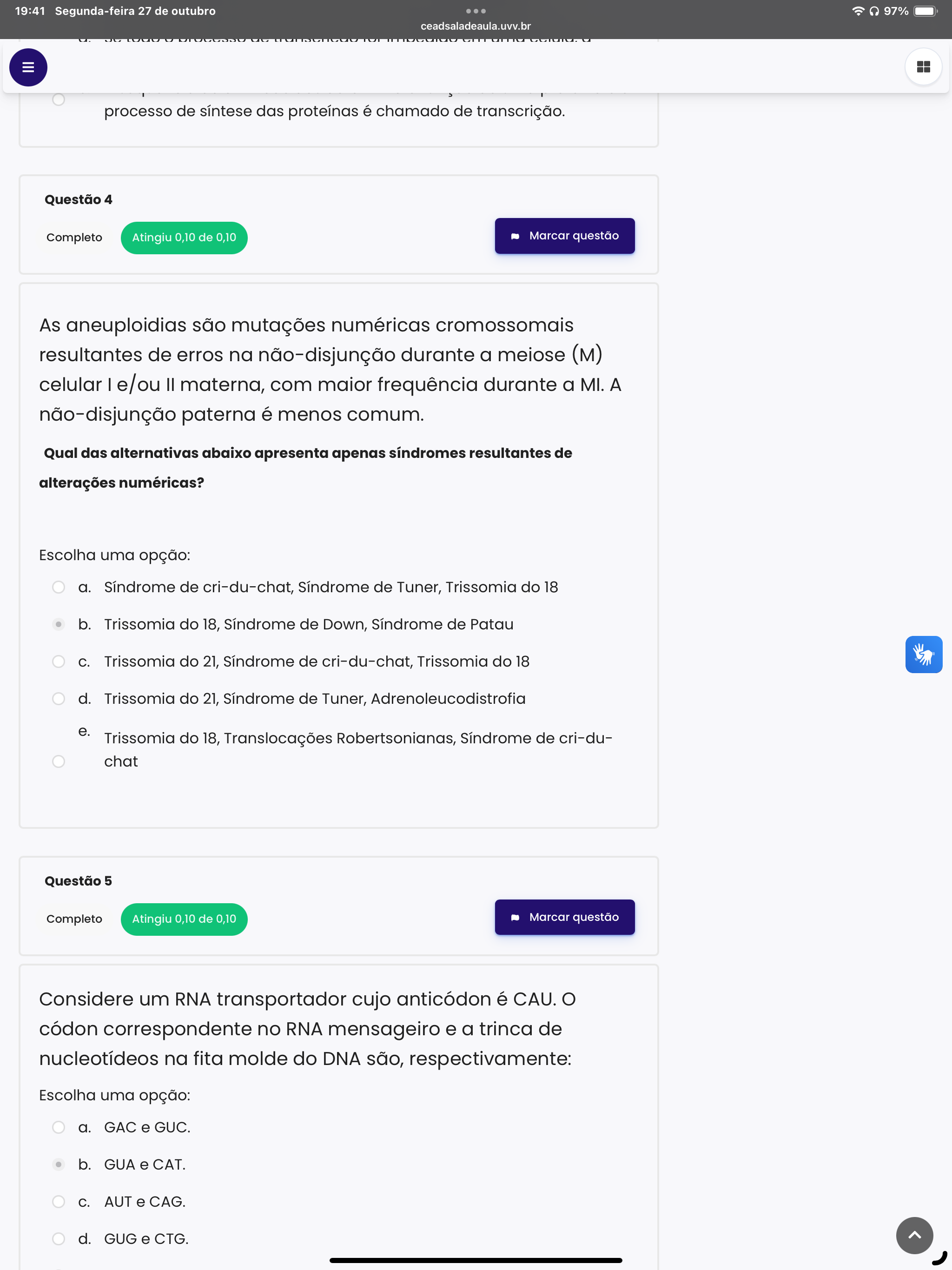 19:41 Segunda-feira 27 de outubro 97% ceadsaladeaula.uvv.br III processo de síntese das proteínas é chamado de transcrição. Questão 4 Completo Atingiu 0,10 de 0,10 Marcar questão As aneuploidias são mutações numéricas cromossomais resultantes de erros na não-disjunção durante a meiose (M) celular e/ou II materna, com maior frequência durante a MI. não-disjunção paterna é menos comum. Qual das alternativas abaixo apresenta apenas síndromes resultantes de alterações numéricas? Escolha uma opção: a. Síndrome de cri-du-chat, Síndrome de Tuner, Trissomia do 18 b. Trissomia do 18, Síndrome de Down, Síndrome de Patau C. Trissomia do 21, Síndrome de cri-du-chat, Trissomia do 18 d. Trissomia do 21, Síndrome de Tuner, Adrenoleucodistrofia e. Trissomia do 18, Translocações Robertsonianas, Síndrome de cri-du- chat Questão 5 Completo Atingiu 0,10 de 0,10 Marcar questão Considere um RNA transportador cujo anticódon é CAU. códon correspondente no RNA mensageiro e a trinca de nucleotídeos na fita molde do DNA são, respectivamente: Escolha uma opção: a. GAC e GUC. b. GUA e CAT. C. AUT e CAG. d. GUG e CTG.