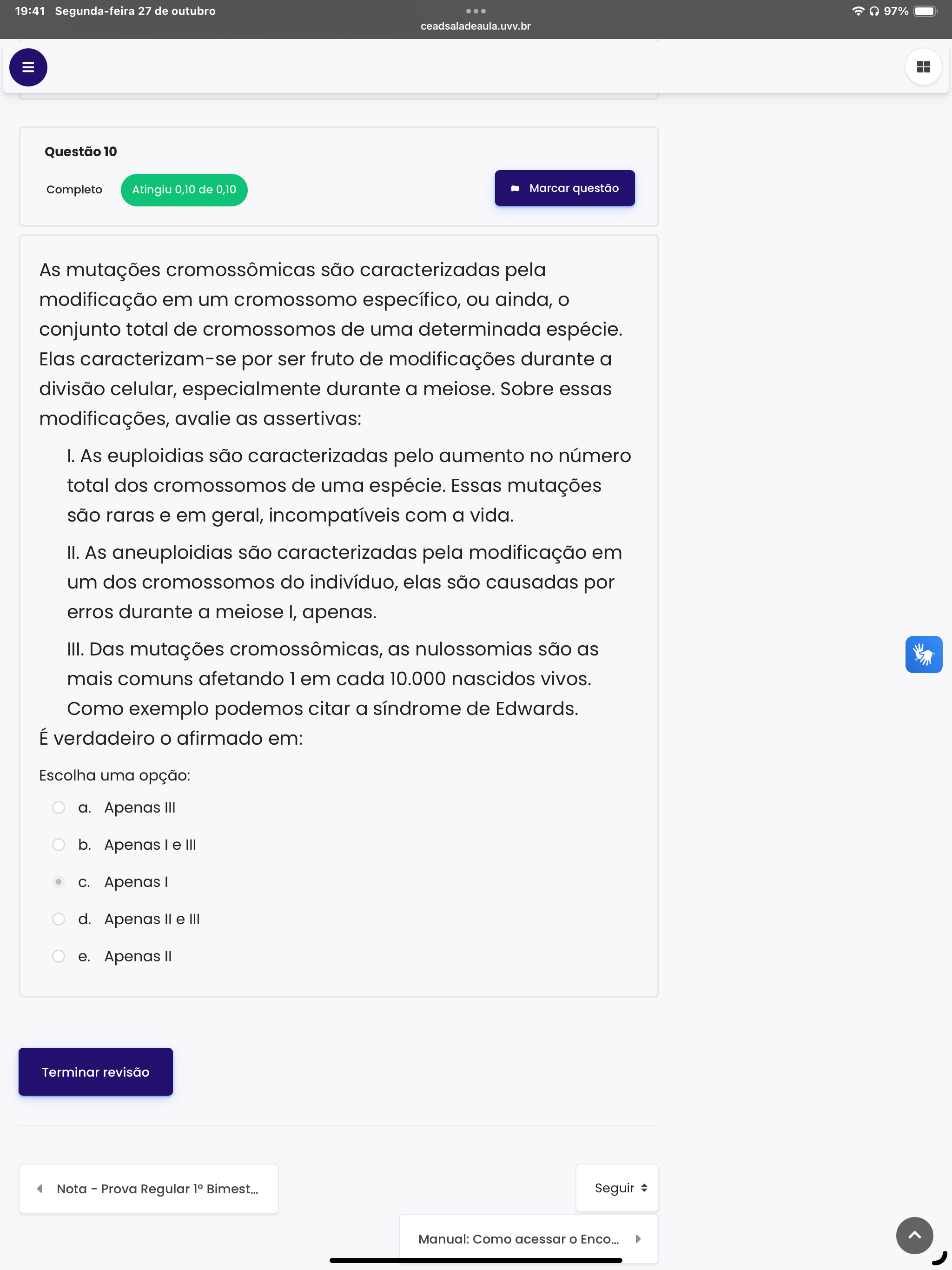 19:41 Segunda-feira 27 de outubro 97% ceadsaladeaula.uvv.br III Questão 10 Completo Atingiu 0,10 de 0,10 Marcar questão As mutações cromossômicas são caracterizadas pela modificação em um cromossomo específico, ou ainda, conjunto total de cromossomos de uma determinada espécie. Elas caracterizam-se por ser fruto de modificações durante a divisão celular, especialmente durante a meiose. Sobre essas modificações, avalie as assertivas: I. As euploidias são caracterizadas pelo aumento no número total dos cromossomos de uma espécie. Essas mutações são raras e em geral, incompatíveis com a vida. II. As aneuploidias são caracterizadas pela modificação em um dos cromossomos do indivíduo, elas são causadas por erros durante a meiose I, apenas. III. Das mutações cromossômicas, as nulossomias são as mais comuns afetando 1 em cada 10.000 nascidos vivos. Como exemplo podemos citar a síndrome de Edwards. É verdadeiro afirmado em: Escolha uma opção: a. Apenas III b. Apenas I e III C. Apenas d. Apenas e III e. Apenas Terminar revisão Nota Prova Regular 1° Bimest... Seguir = Manual: Como acessar Enco...