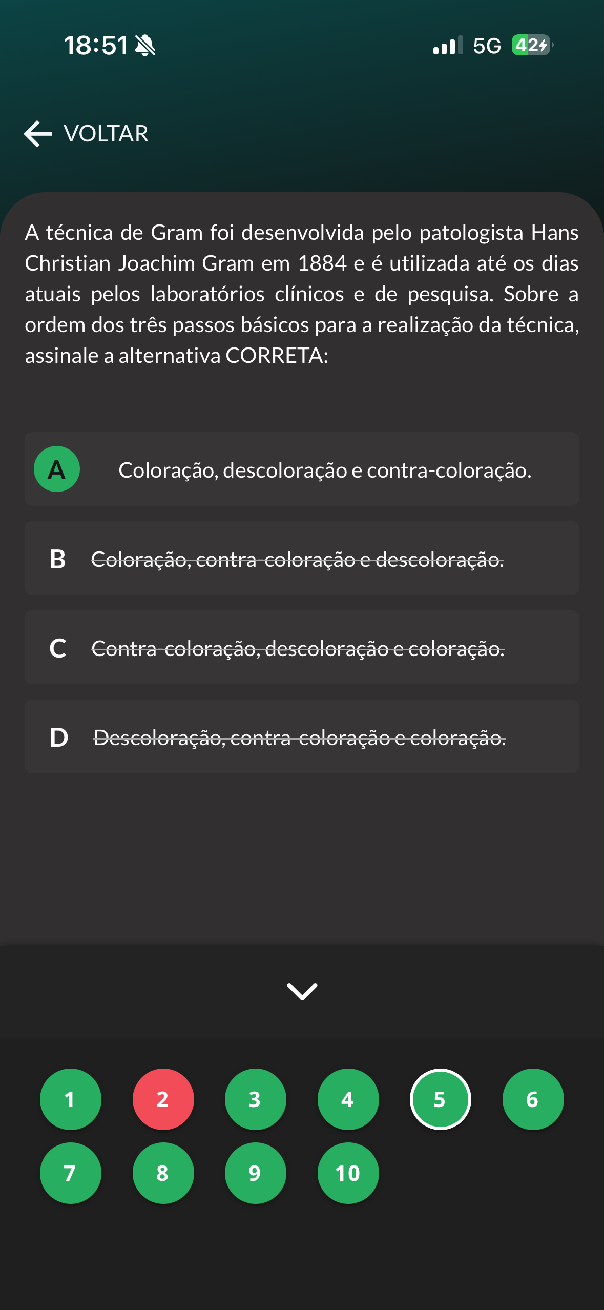 18:51 5G 424 VOLTAR A técnica de Gram foi desenvolvida pelo patologista Hans Christian Joachim Gram em 1884 e é utilizada até os dias atuais pelos laboratórios clínicos e de pesquisa. Sobre a ordem dos três passos básicos para a realização da técnica, assinale a alternativa CORRETA: A Coloração, descoloração e contra-coloração. Coloração, contra coloração e descoloração. c Contra coloração, descoloração e coloração. D Descoloração, contra coloração e coloração. 1 2 3 4 5 6 7 8 9 10