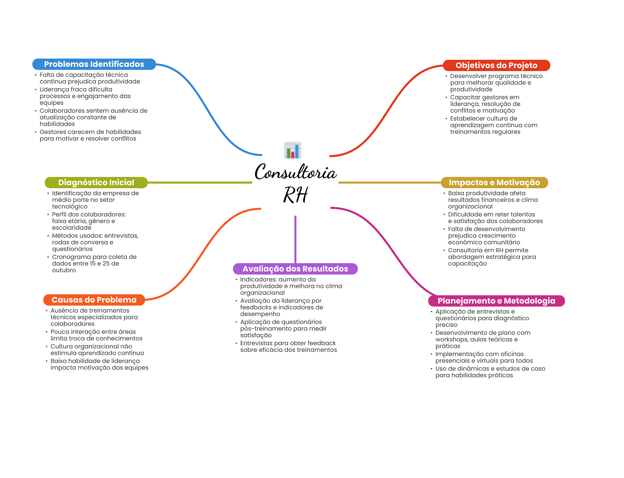Problemas Identificados Objetivos do Projeto Falta de capacitação técnica Desenvolver programa técnico contínua prejudica produtividade para melhorar qualidade e Liderança fraca dificulta produtividade processos e engajamento das Capacitar gestores em equipes liderança, resolução de Colaboradores sentem ausência de conflitos e motivação atualização constante de Estabelecer cultura de habilidades aprendizagem contínua com Gestores carecem de habilidades treinamentos regulares para motivar e resolver conflitos Consultoria Diagnóstico Inicial Impactos e Motivação Identificação da empresa de RH Baixa produtividade afeta médio porte no setor resultados financeiros e clima tecnológico organizacional Perfil dos colaboradores: Dificuldade em reter talentos faixa etária, gênero e e satisfação dos colaboradores escolaridade Falta de desenvolvimento Métodos usados: entrevistas, prejudica crescimento rodas de conversa e econômico comunitário questionários Consultoria em RH permite Cronograma para coleta de abordagem estratégica para dados entre 15 e 25 de capacitação outubro Avaliação dos Resultados Indicadores: aumento da produtividade e melhora no clima organizacional Causas do Problema Avaliação da liderança por Planejamento e Metodologia feedbacks e indicadores de Ausência de treinamentos técnicos especializados para desempenho Aplicação de entrevistas e questionários para diagnóstico colaboradores Aplicação de questionários pós-treinamento para medir preciso Pouca interação entre áreas satisfação Desenvolvimento de plano com limita troca de conhecimentos workshops, aulas teóricas e Cultura organizacional não Entrevistas para obter feedback sobre eficácia dos treinamentos práticas estimula aprendizado contínuo Implementação com oficinas Baixa habilidade de liderança presenciais e virtuais para todos impacta motivação das equipes Uso de dinâmicas e estudos de caso para habilidades práticas