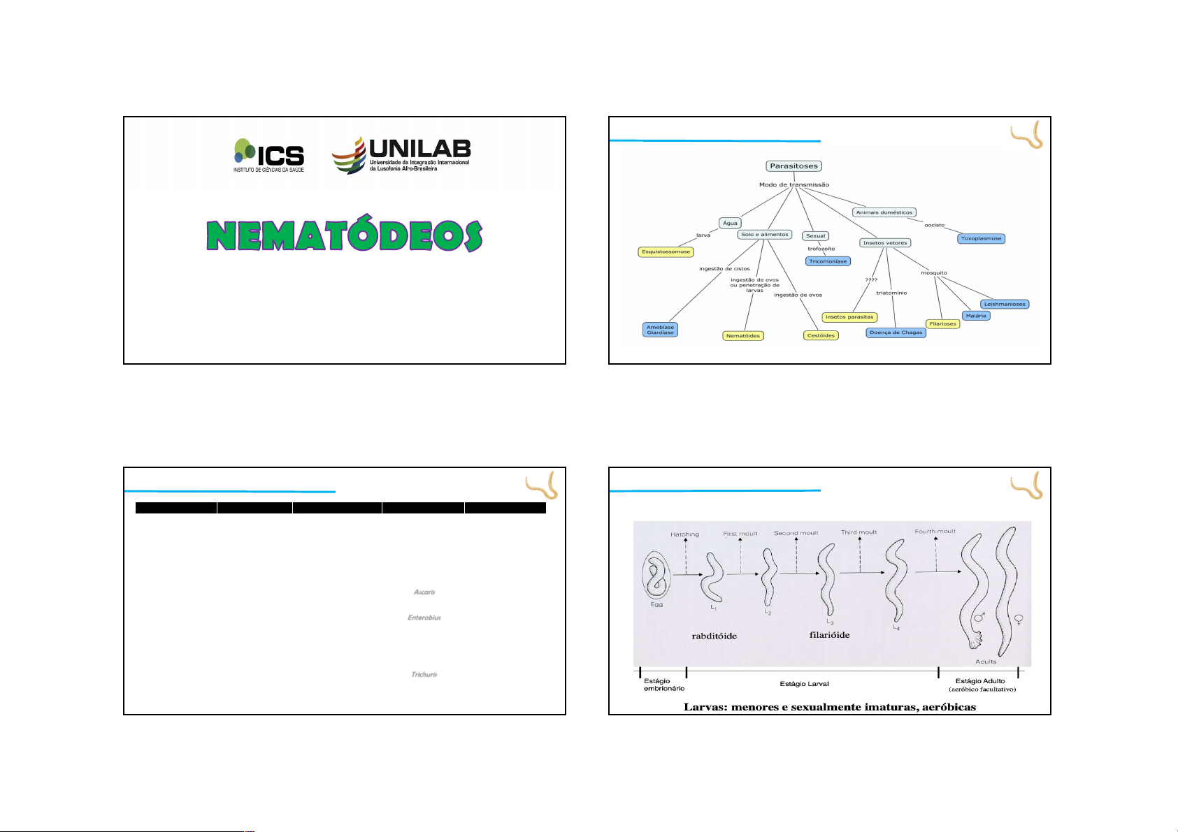 18/03/2026 1 PROFA. DRA. LUANNE EUGÊNIA NUNES PARASITOLOGIA HUMANA DIVULGAÇÃO NÃO AUTORIZADA PELA DOCENTE. 1 NEMATODEOS Nematódeos – Profa. Luanne EugêniaDIVULGAÇÃO NÃO AUTORIZADA PELA DOCENTE. 2 NEMATODEOS Nematódeos – Profa. Luanne EugêniaDIVULGAÇÃO NÃO AUTORIZADA PELA DOCENTE. Filo Classe Família Gênero Espécie Platyhelminthes Trematoda Schistosomatidae Schistosoma S. mansoni S. japonicum S. haematobium Fasciolidae Fasciola F. hepatica Cestoda Taeniidae Taenia T. solium T. saginata Echinococcus E. granulosus Nemathoda Secernentea Ascarididae Ascaris A. lumbricoides Toxocara T. canis Oxyuridae Enterobius E. vermicularis Strongyloididae Strongyloides S. stercoralis Ancylostomidae Ancylostoma A. duodenale A. braziliense Necator N. americanus Trichuridae Trichuris T. trichiura Onchocercidae Wuchereria W. bancrofti Onchocerca O. volvulus 3 NEMATODEOS Desenvolvimento 4 18/03/2026 2 NEMATODEOS Sistemas 5 NEMATODEOS Nematódeos – Profa. Luanne EugêniaDIVULGAÇÃO NÃO AUTORIZADA PELA DOCENTE. TRANSMISSÃO ORAL TRANSCUTÂNEA Ascaris lumbricoides Enterobius vermiculares Trichuris trichiura Strongyloides stercoralis Ancylostoma duodenalis Necator americanus 6 Nematódeos – Profa. Luanne EugêniaDIVULGAÇÃO NÃO AUTORIZADA PELA DOCENTE. 7 Sistemática Nematódeos – Profa. Luanne EugêniaDIVULGAÇÃO NÃO AUTORIZADA PELA DOCENTE. REINO: Animal FILO: Nematoda CLASSE: Secernentea ORDEM: Ascaridida SUPERFAMÍLIA: Ascaridoidea FAMÍLIA: Ascarididae SUB-FAMÍLIA: Ascaridinae Ascaris lumbricoides (Linnaeus,1758) 8 18/03/2026 3 Características gerais Nematódeos – Profa. Luanne EugêniaDIVULGAÇÃO NÃO AUTORIZADA PELA DOCENTE. Parasitam o intestino delgado NUTRIÇÃO à NUTRIENTES DO HOSPEDEIRO 9 Características gerais Nematódeos – Profa. Luanne EugêniaDIVULGAÇÃO NÃO AUTORIZADA PELA DOCENTE. Ovo com casca espessa (mamilonado) Ovo com larva infectante Ovo resistente por anos no ambiente Melhor técnica de diagnóstico: sedimentação Infecção se dá pela ingestão do ovo SOLO HUMANO 10 Características gerais Nematódeos – Profa. Luanne EugêniaDIVULGAÇÃO NÃO AUTORIZADA PELA DOCENTE. -Ovos inférteis (não resistentes) e férteis (se tornam infectantes no ambiente) -Após ingestão ovo com L2 ou L3 infectantes -PERIODO DE INCUBAÇÃO: 8 a 9 semanas 11 VERME ADULTO - MORFOLOGIA Nematódeos – Profa. Luanne EugêniaDIVULGAÇÃO NÃO AUTORIZADA PELA DOCENTE. TAMANHO: MÉDIO – GRANDE COR: AMARELO - ROSA MACHO: 15 – 30 cm FÊMEA: 20 – 40 cm 12 18/03/2026 4 VERME ADULTO - MORFOLOGIA Nematódeos – Profa. Luanne EugêniaDIVULGAÇÃO NÃO AUTORIZADA PELA DOCENTE. BOCA COM TRÊS LÁBIOS MUSCULOSOS PROVIDOS DE ANFIDIOS 13 VERME ADULTO - MORFOLOGIA Nematódeos – Profa. Luanne EugêniaDIVULGAÇÃO NÃO AUTORIZADA PELA DOCENTE. MACHO: CAUDA ENCURVADA FÊMEA: CAUDA AFILADA 200.000 ovos/dia 14 VERME ADULTO - MORFOLOGIA Nematódeos – Profa. Luanne EugêniaDIVULGAÇÃO NÃO AUTORIZADA PELA DOCENTE. SISTEMA REPRODUTIVO 15 OVO - MORFOLOGIA Nematódeos – Profa. Luanne EugêniaDIVULGAÇÃO NÃO AUTORIZADA PELA DOCENTE. TAMANHO: • 60 μm por 45 μm POSSUEM TRÊS MEMBRANAS: • interna (proteínas e lipídios); • média (proteínas e quitina); • externa (mucopolissacarídeos). • aspecto mamilonado (casca de abacaxi). FORMATO: • Arredondado (fértil) • Decorticado (ausência da membrana mucopolissacarídica) • Alongado (infértil) 16 18/03/2026 5 Nematódeos – Profa. Luanne EugêniaDIVULGAÇÃO NÃO AUTORIZADA PELA DOCENTE. CICLO DE VIDA – Ascaris lumbricoides -MONOXENO -HEPATOPULMONAR -OVO: FERTILIZADO EM 15 DIAS 17 CICLO DE VIDA – Ascaris lumbricoides Nematódeos – Profa. Luanne Eugênia 18 Nematódeos – Profa. Luanne EugêniaDIVULGAÇÃO NÃO AUTORIZADA PELA DOCENTE. CICLO DE VIDA – Ascaris lumbricoides -MONOXENO -HEPATOPULMONAR -OVO: FERTILIZADO EM 15 DIAS 19 Nematódeos – Profa. Luanne EugêniaDIVULGAÇÃO NÃO AUTORIZADA PELA DOCENTE. TRANSMISSÃO – Ascaris lumbricoides Ingestão de água ou alimentos contaminados (ovos L3) 20 18/03/2026 6 Nematódeos – Profa. Luanne EugêniaDIVULGAÇÃO NÃO AUTORIZADA PELA DOCENTE. PATOGENIA – Ascaris lumbricoides LARVAS o Baixa parasitemia: assintomático ou dor abdominal o Alta parasitemia: Lesões hepáticas/pulmonares ADULTOS: o Ação espoliadora: o Ptn, carb, vit. A e C, lipídios o Ação tóxica: o Irritação intestinal o Manifestações nervosas o Ação mecânica: o Irritação o Obstrução 21 Nematódeos – Profa. Luanne EugêniaDIVULGAÇÃO NÃO AUTORIZADA PELA DOCENTE. PATOGENIA – Ascaris lumbricoides 22 Nematódeos – Profa. Luanne EugêniaDIVULGAÇÃO NÃO AUTORIZADA PELA DOCENTE. SINTOMATOLOGIA – Ascaris lumbricoides DIARRÉIA MÁ-ABSORÇÃO INTOLERÂNCIA A LACTOSE PERDA DE APETITE MANCHAS CIRCULARES BRANCAS NA PELE 23 Nematódeos – Profa. Luanne EugêniaDIVULGAÇÃO NÃO AUTORIZADA PELA DOCENTE. SINTOMATOLOGIA – Ascaris lumbricoides -SÍNDROME DE LOEFFLER’s -Tosse -Dispnéia -Dor sub-esternal -Febre Carga parasitária: • Distensão abdominal • Dor Bloqueio mecânico • Intussuscepção intestinal • Obstrução parcial ou completa Isquemia • Necrose parede intestinal Migração para ductos biliares e pacreáticos 24 18/03/2026 7 Nematódeos – Profa. Luanne EugêniaDIVULGAÇÃO NÃO AUTORIZADA PELA DOCENTE. DIAGNÓSTICO – Ascaris lumbricoides Exame coproparasitológico: • Sedimentação ( Hoffman, Pons e Janer - HPJ) ü Arredondados ou elípticos ü Casca c/ 3 camadas ü No ambiente com L2 ou L3 25 Nematódeos – Profa. Luanne EugêniaDIVULGAÇÃO NÃO AUTORIZADA PELA DOCENTE. CONTROLE – Ascaris lumbricoides - Tratamento dos parasitados - Higiene de alimentos crus - Saneamento básico - Educação em saúde 26 27 CARACTERISTICAS GERAIS Nematódeos – Profa. Luanne EugêniaDIVULGAÇÃO NÃO AUTORIZADA PELA DOCENTE. MORFOLOGIA • Aspecto de chicote • posterior mais larga • anterior afilada HABITAT • Ceco e cólon • Se fixam pela porção c
