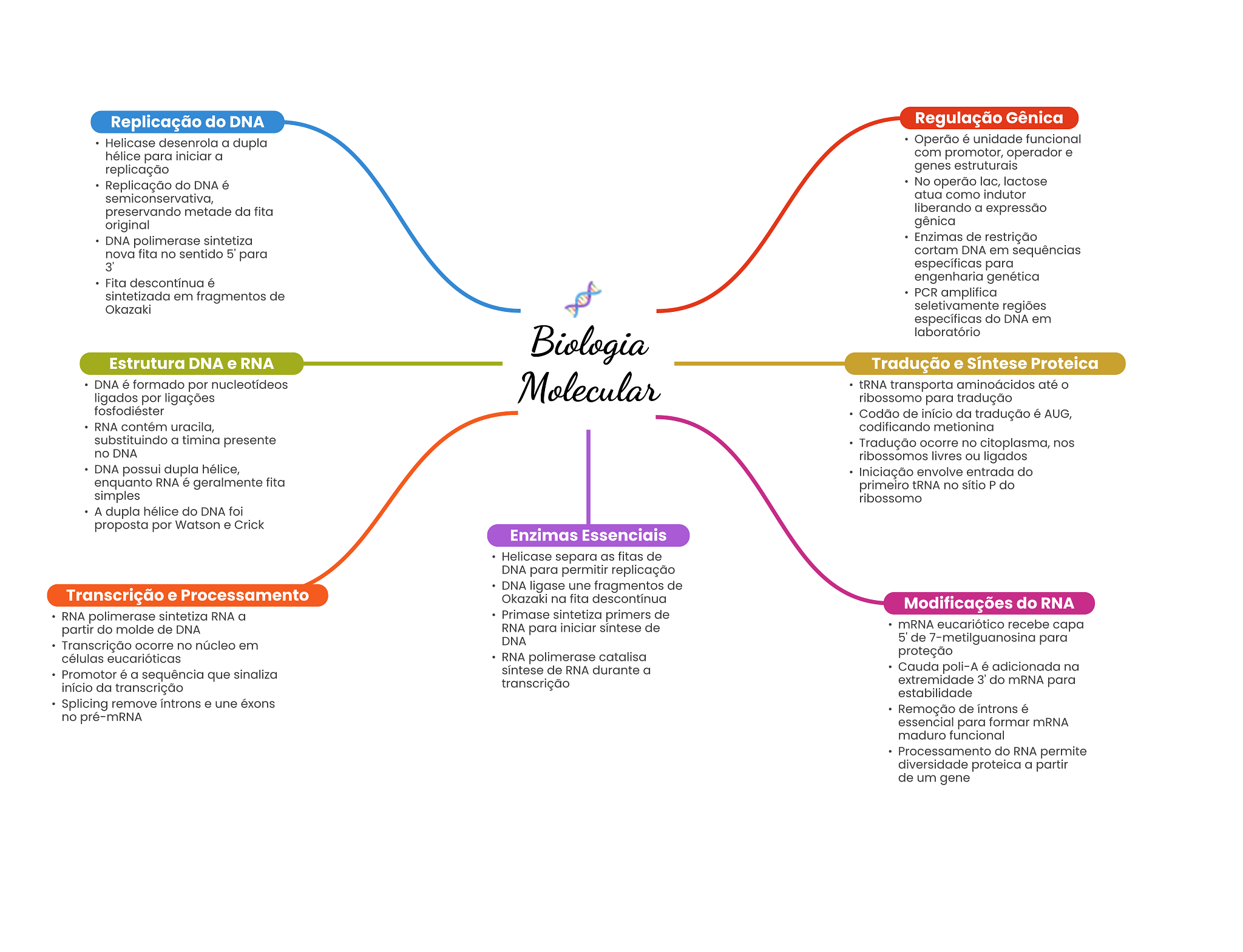 Replicação do DNA Regulação Gênica Helicase desenrola a dupla Operão é unidade funcional hélice para iniciar a com promotor, operador e replicação genes estruturais Replicação do DNA é No operão lac, lactose semiconservativa, atua como indutor preservando metade da fita liberando a expressão original gênica DNA polimerase sintetiza Enzimas de restrição nova fita no sentido 5' para cortam DNA em sequências 3' específicas para Fita descontínua é engenharia genética sintetizada em fragmentos de PCR amplifica Okazaki seletivamente regiões específicas do DNA em Biologia laboratório Estrutura DNA e RNA Tradução e Síntese Proteica DNA é formado por nucleotídeos ligados por ligações Molecular tRNA transporta aminoácidos até ribossomo para tradução fosfodiéster Codão de início da tradução é AUG, RNA contém uracila, codificando metionina substituindo a timina presente Tradução ocorre no citoplasma, nos no DNA ribossomos livres ou ligados DNA possui dupla hélice, Iniciação envolve entrada do enquanto RNA é geralmente fita primeiro tRNA no sítio P do simples ribossomo A dupla hélice do DNA foi proposta por Watson e Crick Enzimas Essenciais Helicase separa as fitas de DNA para permitir replicação DNA ligase une fragmentos de Transcrição e Processamento Okazaki na fita descontínua Modificações do RNA RNA polimerase sintetiza RNA a Primase sintetiza primers de partir do molde de DNA RNA para iniciar síntese de mRNA eucariótico recebe capa DNA 5' de 7-metilguanosina para Transcrição ocorre no núcleo em RNA polimerase catalisa proteção células eucarióticas síntese de RNA durante a Cauda poli-A é adicionada na Promotor é a sequência que sinaliza início da transcrição transcrição extremidade 3' do mRNA para estabilidade Splicing remove íntrons e une éxons Remoção de é no pré-mRNA essencial para formar mRNA maduro funcional Processamento do RNA permite diversidade proteica a partir de um gene