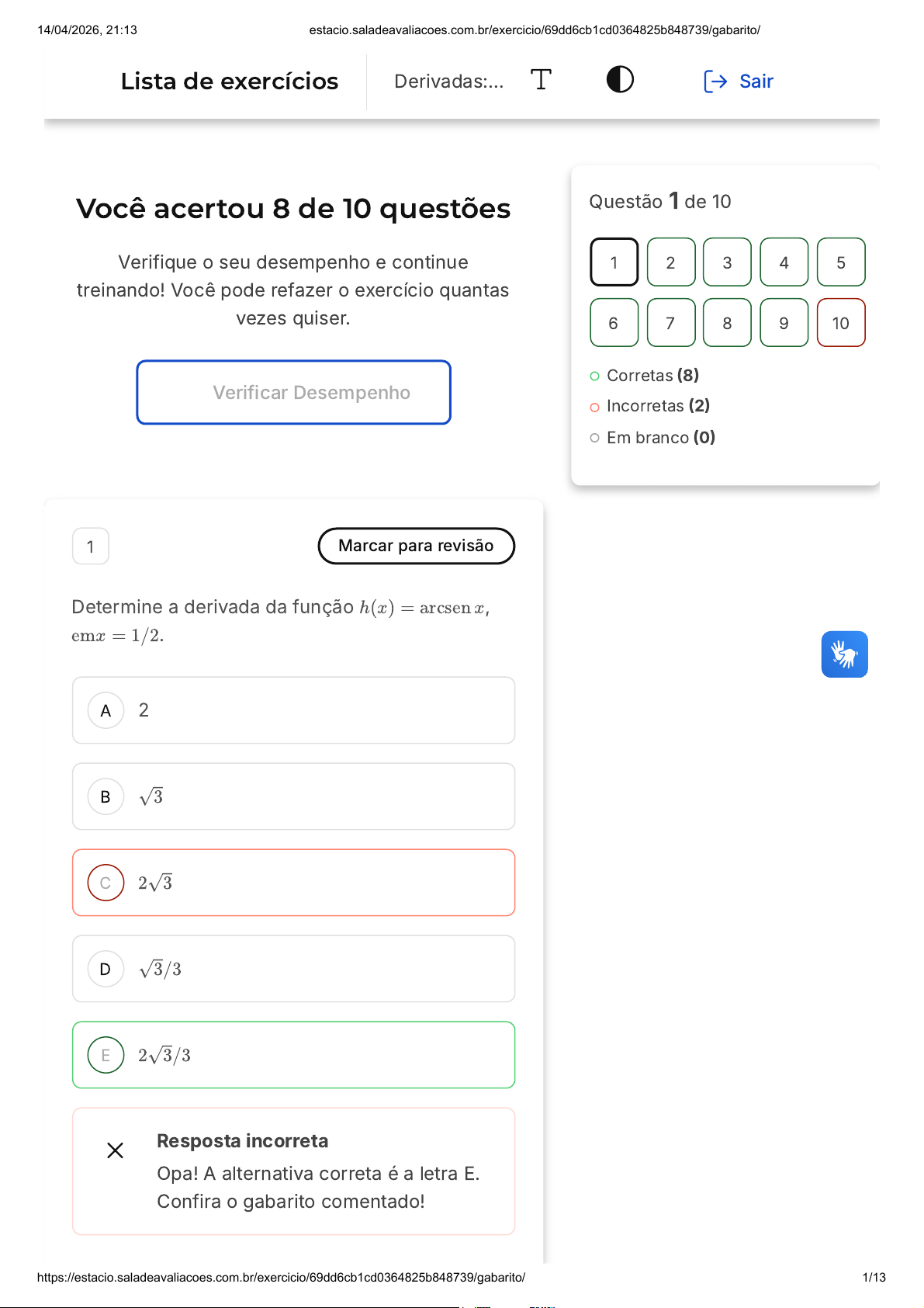 Você acertou 8 de 10 questões Verifique o seu desempenho e continue treinando! Você pode refazer o exercício quantas vezes quiser. Verificar Desempenho A B C D E 1 Marcar para revisão Determine a derivada da função , . h(x) = arcsen x emx = 1/2 2 √3 2√3 √3/3 2√3/3 Resposta incorreta Opa! A alternativa correta é a letra E. Confira o gabarito comentado! Questão 1 de 10 Corretas (8) Incorretas (2) Em branco (0) 1 2 3 4 5 6 7 8 9 10 Lista de exercícios Derivadas:… Sair 14/04/2026, 21:13 estacio.saladeavaliacoes.com.br/exercicio/69dd6cb1cd0364825b848739/gabarito/ https://estacio.saladeavaliacoes.com.br/exercicio/69dd6cb1cd0364825b848739/gabarito/ 1/13 A B C D E Gabarito Comentado \ Como(arcsen x) ′ = , temos: h ′ ( ) = = 1 √1 − x2 1 2 1 √ 1 − ( ) 21 2 2√3 3 2 Marcar para revisão Sempre que houver o quociente entre funções em uma derivada, deve-se aplicar a regra do quociente. Calcule a derivada abaixo: f(x) = x sen(x) sen(x)−xco sen2(x) sen(x)−xco sen(x) xsen(x)−xco cos2(x) xsen(x)−xco cos(x) sen(x)−xco tg(x) Resposta correta Parabéns, você selecionou a alternativa correta. Confira o gabarito comentado! 14/04/2026, 21:13 estacio.saladeavaliacoes.com.br/exercicio/69dd6cb1cd0364825b848739/gabarito/ https://estacio.saladeavaliacoes.com.br/exercicio/69dd6cb1cd0364825b848739/gabarito/ 2/13 A B C D E Gabarito Comentado Para resolver essa questão, utilizamos a regra do quociente na derivada. A regra do quociente é uma fórmula usada para encontrar a derivada de uma razão de duas funções. Neste caso, temos que u = x e v = sen(x). Aplicando a regra do quociente, temos que a derivada f'(x) é dada por: Portanto, a alternativa correta é a letra A: . f ′(x) = =u ′ v−uv ′ v2 sen(x)−xcos(x) sen2(x) sen(x)−xcos(x) sen2(x) 3 Marcar para revisão Calcular a taxa de variação de uma função em relação à variável independente é aplicada para interpretar fenômenos físicos e matemáticos. Seja , definida para . Determine o valor da taxa de variação de em relação a , no instante . h(x) = ln(sen x) 0estacio.saladeavaliacoes.com.br/exercicio/69dd6cb1cd0364825b848739/gabarito/ https://estacio.saladeavaliacoes.com.br/exercicio/69dd6cb1cd0364825b848739/gabarito/ 9/13 A B C D E Note que o gráfico sugere que a reta tangente ao gráfico de no ponto de abscissa faz com o eixo horizontal, pois passa por e por . f ′ (x) = (x ⋅ ln x) ′ f ′ (x) = x ′ ln x + x(ln x) ′ f ′ (x) = 1 ⋅ ln x + x f ′ (x) = ln x + 1 f ′ (1) = ln 1 + 1 = 1 1 x f x = 1 45 ∘ (0; −1) (1; 0) 8 Marcar para revisão Dada a função abaixo: f(x)=sen(4x²) Calcule ∂ 2 f ∂x2 -64sen(4x²)x²+8cos(4x²) 64sen(4x²)x²+8cos(4x²) -8sen(4x²)x²+8cos(4x²) 8sen(4x²)x²+8cos(4x²) sen(4x²)x²+cos(4x²) Resposta correta Parabéns, você selecionou a alternativa correta. Confira o gabarito comentado! 14/04/2026, 21:13 estacio.saladeavaliacoes.com.br/exercicio/69dd6cb1cd0364825b848739/gabarito/ https://estacio.saladeavaliacoes.com.br/exercicio/69dd6cb1cd0364825b848739/gabarito/ 10/13 A B C D E Gabarito Comentado Para resolver essa questão, precisamos calcular a segunda derivada da função dada. A primeira derivada da função f(x)=sen(4x²) é 8cos(4x²).x. Para obter a segunda derivada, precisamos aplicar a regra do produto. A regra do produto, aplicada à primeira derivada, nos dá -64sen(4x²)x²+8cos(4x²), que é a alternativa A. Portanto, a segunda derivada da função f(x)=sen(4x²) é -64sen(4x²)x²+8cos(4x²). 9 Marcar para revisão Determinar o valor de m + 4p , reais, para que a função h(x) seja derivável em todos os pontos do seu domínio. 0 1 2 3 4 14/04/2026, 21:13 estacio.saladeavaliacoes.com.br/exercicio/69dd6cb1cd0364825b848739/gabarito/ https://estacio.saladeavaliacoes.com.br/exercicio/69dd6cb1cd0364825b848739/gabarito/ 11/13 A B C D E Resposta correta Parabéns, você selecionou a alternativa correta. Confira o gabarito comentado! Gabarito Comentado As funções px +2 e mx+1 devem ser iguais quando x=2, logo, 4p+2=2m+1. As derivadas das funções também devem ser iguais em x=2, logo, 4p = m. Com essas duas equações, encontramos m = 1 e p = 1/4. Então, m = 4p = 2 2 10 Marcar para revisão Dada a relação , indique uma expressão para a derivada x 2 + xy + y 2 = 1 y ′ y ′ = − x+2 x+y y ′ = − 2x+ x+y y ′ = − x+y x+2 y ′ = 2x− x+2 y ′ = − 2x+ x+2 14/04/2026, 21:13 estacio.saladeavaliacoes.com.br/exercicio/69dd6cb1cd0364825b848739/gabarito/ https://estacio.saladeavaliacoes.com.br/exercicio/69dd6cb1cd0364825b848739/gabarito/ 12/13 Resposta incorreta Opa! A alternativa correta é a letra E. Confira o gabarito comentado! Gabarito Comentado (x 2 + xy + y 2) ′ = 1 ′ 2x + xy ′ + y + 2yy ′ = 0 y ′ (x + 2y) = −(2x + y) y ′ = − 2x + y x + 2y 14/04/2026, 21:13 estacio.saladeavaliacoes.com.br/exercicio/69dd6cb1cd0364825b848739/gabarito/ https://estacio.saladeavaliacoes.com.br/exercicio/69dd6cb1cd0364825b848739/gabarito/ 13/13