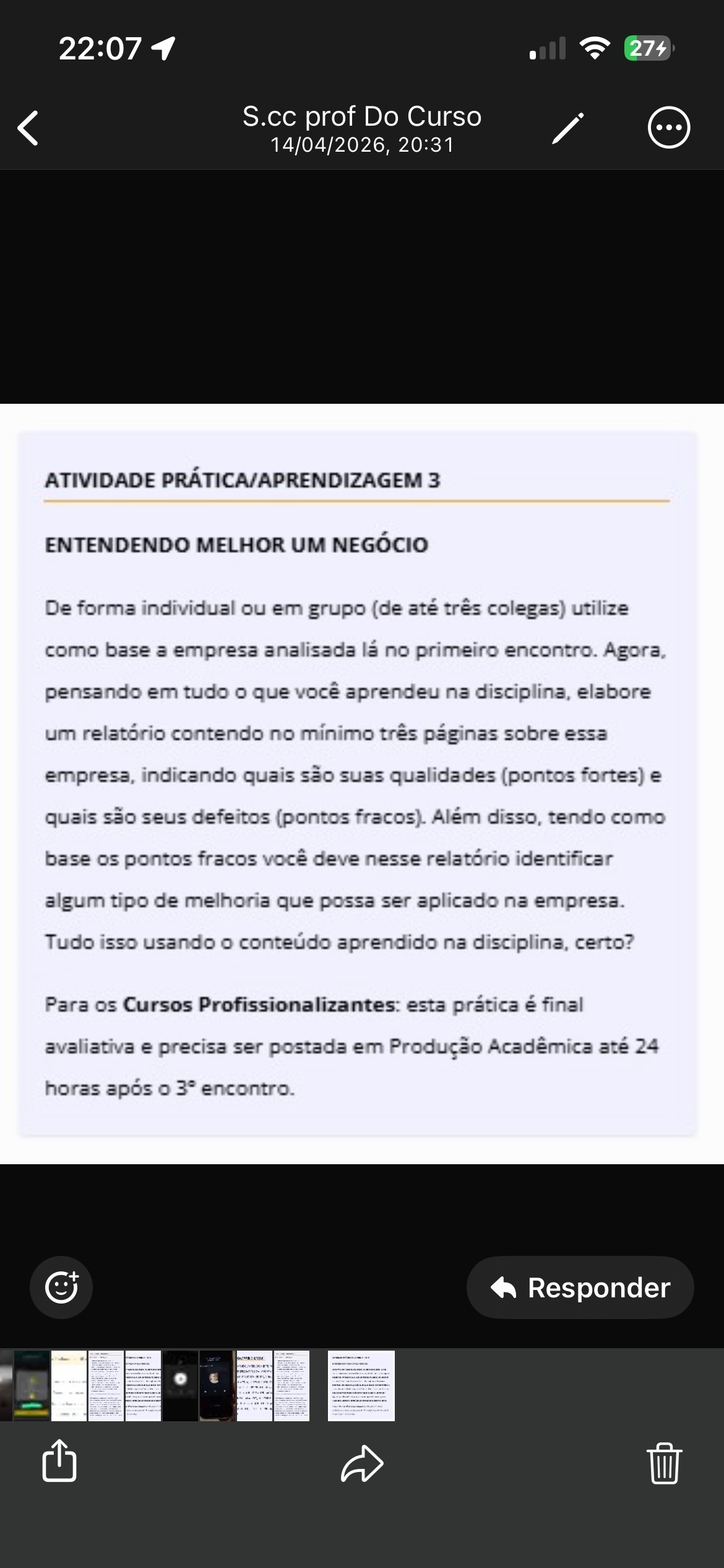 22:07 274 S.cc prof Do Curso 14/04/2026, 20:31 ATIVIDADE 3 ENTENDENDO MELHOR UM NEGÓCIO De forma individual ou em grupo (de até três colegas) utilize como base a empresa analisada lá no primeiro encontro. Agora, pensando em tudo que você aprendeu na disciplina, elabore um relatório contendo no mínimo três páginas sobre essa empresa, indicando quais são suas qualidades (pontos fortes) e quais são seus defeitos (pontos fracos). Além disso, tendo como base os pontos fracos você deve nesse relatório identificar algum tipo de melhoria que possa ser aplicado na empresa. Tudo isso usando conteúdo aprendido na disciplina, certo? Para os Cursos Profissionalizantes esta prática é final avaliativa e precisa ser postada em Produção Acadêmica até 24 horas após 3° encontro. Responder