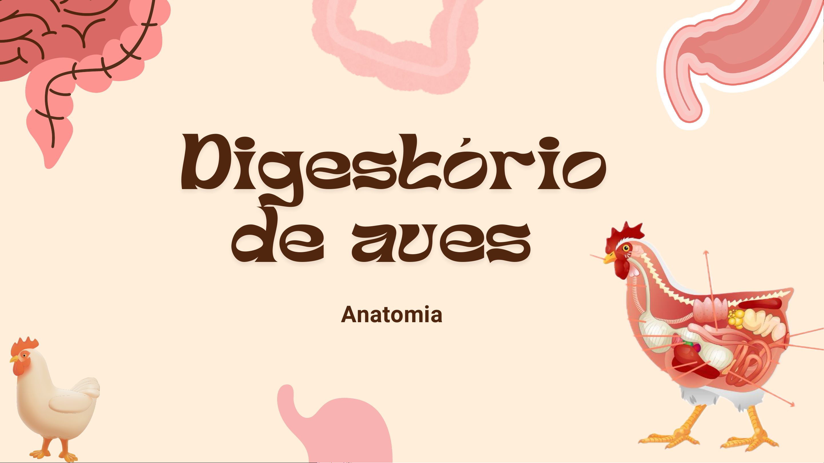 Digestório de aves Digestório de aves Anatomia Bico 1 Esôfago 2 Papo/ ingluvio 3 Proventriculo 4 Ventrículo/ moela 5 Duodeno 6 Jejuno 7 Cloaca Ceco 9 8 COMPONENTES Cavidade oral sem dentes e lábios possui bico (formato vai depender da alimentação) língua sem muito movimento não possui palto mole Esôfago e papo Possui um desvio para a direita dividido em região cervical e celomatica ( tórax e abdôme) amolece o alinhamento ausente e aves que se alimenta de coisas úmidas Proventriculo Primeira porção do estômago glandular ( possui suco gástrico) Zona intermediária Entre o proventriculo e o ventrículo Ventrículo/ moela Estomago mecânico tritura o alimento ingerem pedras “gastrolitos” para ajudar na trituração Duodeno Ao redor do pâncreas (linear) Jejuno Divertículo de Meckel-> Ducto vitelínico (involuido) Ceco Possuem dois (carnívoros tem pouco desenvolvido) Cloaca desemboca três sistemas proctodeu : reprodutor urodeu: urinário coprodeu: fezes FimFim Anatomia