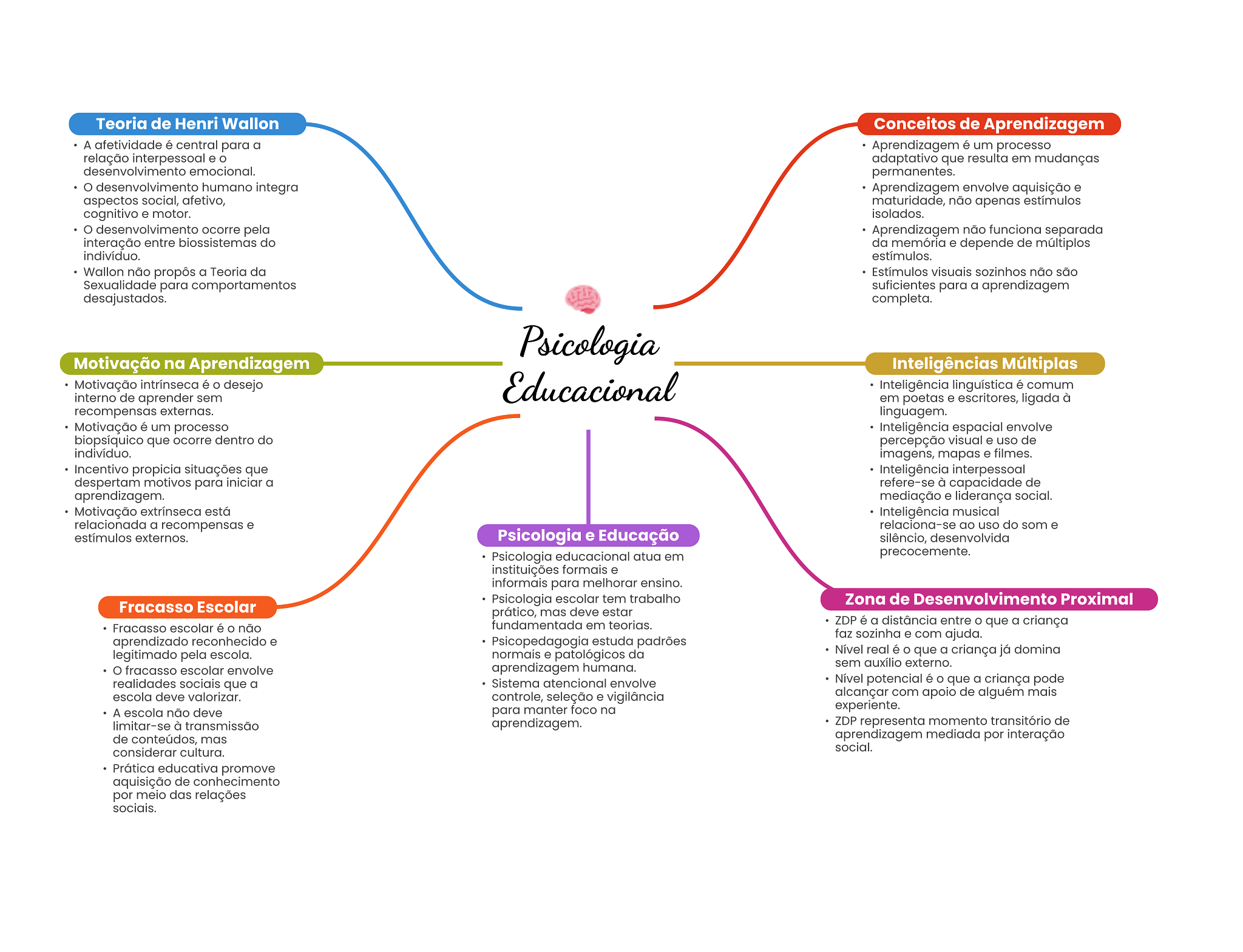 Teoria de Henri Wallon Conceitos de Aprendizagem A afetividade é central para a Aprendizagem é um processo relação interpessoal e adaptativo que resulta em mudanças desenvolvimento emocional. permanentes. desenvolvimento humano integra Aprendizagem envolve aquisição e aspectos social, afetivo, maturidade, não apenas estímulos cognitivo e motor. isolados. desenvolvimento ocorre pela Aprendizagem não funciona separada interação entre biossistemas do da memória e depende de múltiplos indivíduo. estímulos. Wallon não propôs a Teoria da Estímulos visuais sozinhos não são Sexualidade para comportamentos suficientes para a aprendizagem desajustados. completa. Psicologia Motivação na Aprendizagem Inteligências Múltiplas Motivação intrínseca é desejo Educacional Inteligência linguística é comum interno de aprender sem em poetas e escritores, ligada à recompensas externas. linguagem. Motivação é um processo Inteligência espacial envolve biopsíquico que ocorre dentro do percepção visual e uso de indivíduo. imagens, mapas e filmes. Incentivo propicia situações que Inteligência interpessoal despertam motivos para iniciar a refere-se à capacidade de aprendizagem. mediação e liderança social. Motivação extrínseca está Inteligência musical relacionada a recompensas e relaciona-se ao uso do som e estímulos externos. Psicologia e Educação silêncio, desenvolvida Psicologia educacional atua em precocemente. instituições formais e informais para melhorar ensino. Psicologia escolar tem trabalho Zona de Desenvolvimento Proximal Fracasso Escolar prático, mas deve estar Fracasso escolar é não fundamentada em teorias. ZDP é a distância entre que a criança faz sozinha e com ajuda. aprendizado reconhecido e Psicopedagogia estuda padrões legitimado pela escola. normais e patológicos da Nível real é O que a criança já domina aprendizagem humana. sem auxílio externo. fracasso escolar envolve realidades sociais que a Sistema atencional envolve Nível potencial é que a criança pode escola deve valorizar. controle, seleção e vigilância alcançar com apoio de alguém mais A escola não deve para manter foco na experiente. limitar-se à transmissão aprendizagem. ZDP representa momento transitório de de conteúdos, mas aprendizagem mediada por interação considerar cultura. social. Prática educativa promove aquisição de conhecimento por meio das relações sociais.
