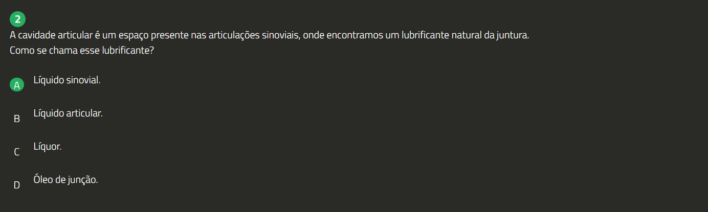 2 A cavidade articular é um espaço presente nas articulações sinoviais, onde encontramos um lubrificante natural da juntura. Como se chama esse lubrificante? A Líquido sinovial. B Líquido articular. Líquor. D Óleo de junção.