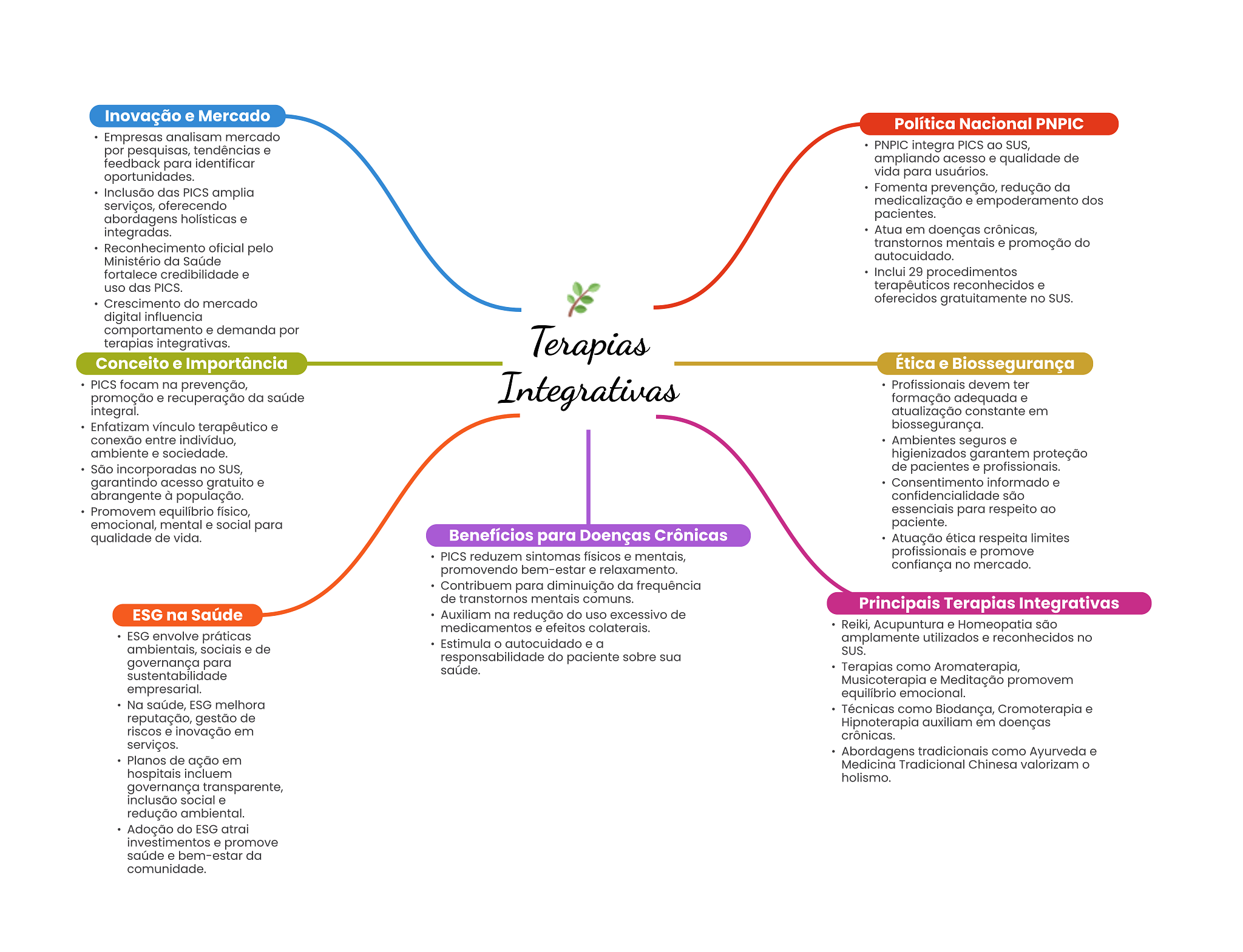Inovação e Mercado Política Nacional PNPIC Empresas analisam mercado por pesquisas, tendências e PNPIC integra PICS ao SUS, feedback para identificar ampliando acesso e qualidade de oportunidades. vida para usuários. Inclusão das PICS amplia Fomenta prevenção, redução da serviços, oferecendo medicalização e empoderamento dos abordagens holísticas e pacientes. integradas. Atua em doenças crônicas, Reconhecimento oficial pelo transtornos mentais e promoção do Ministério da Saúde autocuidado. fortalece credibilidade e Inclui 29 uso das PICS. terapêuticos reconhecidos e Crescimento do mercado oferecidos gratuitamente no SUS. digital influencia comportamento e demanda por terapias integrativas. Terapias Conceito e Importância Ética e Biossegurança PICS focam na prevenção, promoção e recuperação da saúde Integrativas Profissionais devem ter formação adequada e integral. atualização constante em Enfatizam vínculo terapêutico e biossegurança. conexão entre indivíduo, Ambientes seguros e ambiente e sociedade. higienizados garantem proteção São incorporadas no SUS, de pacientes e profissionais. garantindo acesso gratuito e Consentimento informado e abrangente à população. confidencialidade são Promovem equilíbrio físico, essenciais para respeito ao emocional, mental e social para paciente. qualidade de vida. Benefícios para Doenças Crônicas Atuação ética respeita limites PICS reduzem sintomas físicos e mentais, profissionais e promove promovendo bem-estar e relaxamento. confiança no mercado. Contribuem para diminuição da frequência de transtornos mentais comuns. Principais Terapias Integrativas ESG na Saúde Auxiliam na redução do uso excessivo de medicamentos e efeitos colaterais. Reiki, Acupuntura e Homeopatia são ESG envolve práticas Estimula autocuidado e a amplamente utilizados e reconhecidos no ambientais, sociais e de SUS. governança para responsabilidade do paciente sobre sua saúde. Terapias como Aromaterapia, sustentabilidade Musicoterapia e Meditação promovem empresarial. equilíbrio emocional. Na saúde, ESG melhora Técnicas como Biodança, Cromoterapia e reputação, gestão de Hipnoterapia auxiliam em doenças riscos e inovação em crônicas. serviços. Abordagens tradicionais como Ayurveda e Planos de ação em Medicina Tradicional Chinesa valorizam hospitais incluem holismo. governança transparente, inclusão social e redução ambiental. Adoção do ESG atrai investimentos e promove saúde e bem-estar da comunidade.