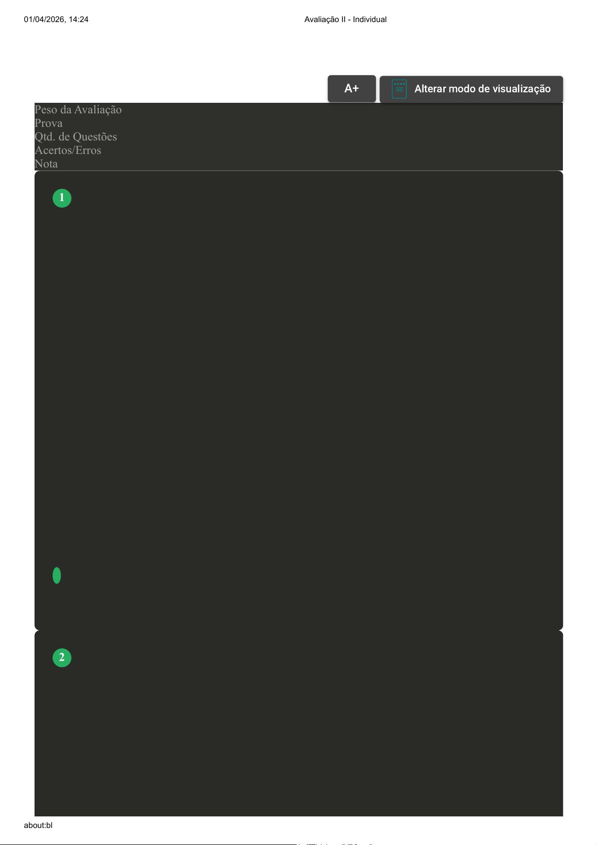Prova Impressa GABARITO | Avaliação II - Individual (Cod.:1600734) Peso da Avaliação 1,50 Prova 116865606 Qtd. de Questões 10 Acertos/Erros 8/2 Nota 8,00 [Laboratório Virtual – Coloração de Papanicolau] Após a realização da prática de Coloração de Papanicolau, é possível visualizar a lâmina corada. De acordo com a coloração de Papanicolau, assinale a alternativa CORRETA: A Ao visualizar as lâminas, é possível identificar células com núcleo corado em amarelo/laranja (hematoxilina), citoplasma queratinizado em azul-esverdeado (Orange-G) e citoplasma púrpura (EA-36). B Ao visualizar as lâminas, é possível identificar células com núcleo incolor (hematoxilina), citoplasma queratinizado em amarelo/laranja (Orange-G) e citoplasma azul-esverdeado (EA-36). C Nenhuma das alternativas está correta. D Ao visualizar as lâminas, é possível identificar células com núcleo corado em verde (hematoxilina), citoplasma queratinizado em púrpura (Orange-G) e citoplasma azul-esverdeado (EA-36). E Ao visualizar as lâminas, é possível identificar células com núcleo corado em púrpura (hematoxilina), citoplasma queratinizado em amarelo/laranja (Orange-G) e citoplasma azul- esverdeado (EA-36). Diversos materiais biológicos podem ser utilizados para análise citopatológica, podendo ser oriundos de esfoliação, punção, raspados, lavados ou espontâneos. Isso reflete em uma técnica diagnóstica altamente versátil e pouco invasiva. Com base no exposto, analise as asserções e a relação proposta entre elas: I - Lavados consistem em aplicar uma solução salina no local da lesão e aspirá-la em seguida. PORQUE II- Urina, escarro e secreção mamária são exemplos de material biológico obtido espontaneamente. VOLTAR A+Aumentar, FonteAlterar modo de visualização 1 2 01/04/2026, 14:24 Avaliação II - Individual about:blank 1/8 Assinale a alternativa CORRETA: A A asserção I é uma proposição falsa e a II é uma proposição verdadeira. B As asserções I e II são verdadeiras, e a II é uma justificativa correta da I. C A asserção I é uma proposição verdadeira e a II é uma proposição falsa. D As asserções I e II são verdadeiras, mas a II não é uma justificativa correta da I. E As asserções I e II são falsas. A análise microscópica das células só é possível se elas estiveram devidamente coradas. Na Citopatologia, a coloração-padrão é a coloração de Papanicolaou, no entanto, outras colorações podem ser necessárias em situações específicas. Sobre os corantes e soluções utilizados na coloração de Papanicolaou e as estruturas que eles coram, assinale a alternativa CORRETA: A Nenhuma das alternativa é correta. B Os corantes utilizados na coloração de Papanicolaou são Hematoxilina de Harris, Orange G e EA-36. C O processo de coloração-padrão é composto somente por corantes, não sendo necessários banhos de água e álcool. D Os corantes coram respectivamente os núcleos de vermelho e o citoplasma de roxo e rosa. E Somente o corante hematoxilina é utilizado na coloração de Papanicolaou. A Citopatologia é um ramo da ciência voltado ao rastreamento e detecção de celulares do tipo neoplásicas ou inflamatórias. Seu escopo também inclui a identificação de microrganismos patogênicos. 3 4 01/04/2026, 14:24 Avaliação II - Individual about:blank 2/8 De acordo com os aspectos inerentes a Citopatologia, analise as asserções e a relação proposta entre elas: I-A Citopatologia utiliza como principal ferramenta diagnóstica o microscópio óptico. PORQUE II - Atualmente, a Citopatologia é amplamente utilizada para exames de rastreamento de neoplasias. Assinale a alternativa CORRETA: A As asserções I e II são verdadeiras, mas a II não é uma justificativa correta da I. B A asserção I é uma proposição falsa e a II é uma proposição verdadeira. C As asserções I e II são verdadeiras, e a II é uma justificativa correta da I. D As asserções I e II são falsas. E A asserção I é uma proposição verdadeira e a II é uma proposição falsa. O procedimento conhecido como PAAF (punção aspirativa por agulha fina) por palpação é um método específico, em que o profissional médico é responsável por utilizar os dedos para detectar o nódulo de interesse, e realizar a inserção da agulha no local a ser puncionado. Sabendo dos aspectos da PAAF por palpação, analise as asserções e a relação proposta entre elas: Rephrase with Ginger (Ctrl+Alt+E) I - Tem caído em desuso pelo surgimento de novas formas de localização do nódulo. PORQUE II - Apesar de funcional, muitos casos precisavam de recoleta pela baixa precisão da punção. Assinale a alternativa CORRETA: Revisar Conteúdo do Livro 5 01/04/2026, 14:24 Avaliação II - Individual about:blank 3/8 A As asserções I e II são falsas. B As asserções I e II são verdadeiras, e a II é uma justificativa correta da I. C As asserções I e II são verdadeiras, mas a II não é uma justificativa correta da I. D A asserção I é uma proposição verdadeira e a II é uma proposição falsa. E A asserção I é uma proposição falsa e a II é uma proposição verdadeira. [Laboratório Virtual – Coloração de Papanicolau] Para a técnica de coloração de Papanicolau é importante seguir a bateria de corantes, álcool e água. Essa sequência específica permite que todas as estruturas celulares sejam devidamente coradas. Além disso, cada um dos corantes possui uma função específica dentro desse processo. Considerando o exposto, associe os itens, utilizando o código a seguir, indicando quais estruturas celulares são coradas pelos corantes Hematoxilina, OG-6 e EA-36: I- Citoplasma queratinizado. II- Núcleo. III- Citoplasma e Grânulos citoplasmáticos. ( ) Hematoxilina. ( ) OG-6 (Orange G). ( ) EA-36. Assinale a alternativa que apresenta a sequência CORRETA: A II - I - III. 6 01/04/2026, 14:24 Avaliação II - Individual about:blank 4/8 B Nenhu