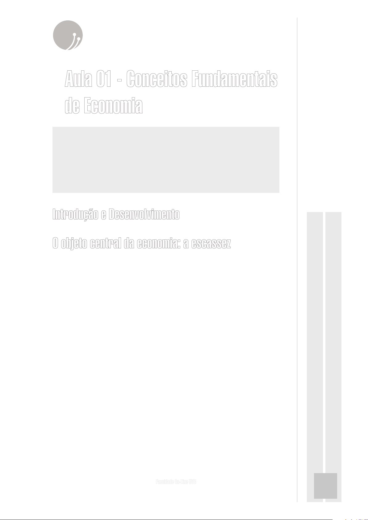Ma cr oe co no mi a Au la 01 - Co nc eit os Fu nd am en ta is de Ec on om ia �Faculdade On-Line UVB Anotações do Aluno uvb Aula 01 - Conceitos Fundamentais de Economia Nesta aula, você aprenderá o que a Economia estuda. Será apresentado(a) aos conceitos de escassez, produção, bens e serviços e fatores de produção. Saberá quais os problemas econômicos fundamentais e como a economia de mercado responde a eles. Conhecerá o método de estudo da Economia, através dos modelos econômicos, e observará dois modelos simples – o fluxo circular da renda e a fronteira das possibilidades de produção. Introdução e Desenvolvimento O objeto central da economia: a escassez A razão essencial da existência da Teoria Econômica (ou Ciência Econômica) é a escassez. Este conceito refere-se à falta ou insuficiência de alguma coisa. No caso das sociedades humanas, observamos que há um conflito constante entre necessidades e recursos, pois as nossas necessidades são ilimitadas, enquanto os recursos são escassos. Ao falarmos das necessidades, estamos nos referindo aos principais elementos que garantem a sobrevivência material da espécie humana ( todos e cada um de nós). No que você pensa quando se fala de necessidades com esse significado? Enumerei abaixo as necessidades básicas do homem atual. É bastante provável que esta lista contenha muitos, ou quase todos, os itens da sua própria lista: • alimentos (sólidos e líquidos) • vestuário e calçados • moradia, mobília • água corrente e eletricidade Ma cr oe co no mi a Au la 01 - Co nc eit os Fu nd am en ta is de Ec on om ia �Faculdade On-Line UVB Anotações do Aluno uvb • utensílios domésticos e eletrodomésticos • meios de transporte Esta lista é muito limitada. Observe, por exemplo, que excluímos tudo o que representa lazer e recreação no lar (aparelhos eletrônicos, livros e revistas etc.). Observe, ainda, que os meios de transporte podem variar de uma simples bicicleta a uma moto, um automóvel ou ao transporte público (ônibus, trem, metrô). Atividades fora do lar nem foram arranhadas (cinema, bares e restaurantes, viagens etc.). Além disso, se pensarmos que a vida em sociedade requer também que cada um possa contribuir para a melhora coletiva, através da participação enquanto cidadão livre e ativo, então o rol das necessidades aumenta bastante. Não acha? Pois estaríamos falando também em educação e saúde generalizados, imprensa livre e variada, governos democráticos com eleições regulares, justiça organizada e eficiente, etc. Existe um número significativo de seres humanos que conseguem, ao menos, usufruir a lista de necessidades básicas e muitos destes também se beneficiam dos itens citados abaixo da lista, tais como lazer, educação, saúde, etc. No entanto, os itens enumerados como de necessidades básicas do homem está fora do alcance de parcelas significativas da humanidade atual. Milhões de pessoas, no Brasil e no mundo, não tem acesso a essa lista como um todo. No máximo, elas conseguem obter dois ou três daqueles itens em quantidades insuficientes. Você já viu quantas pessoas passam fome no Brasil e no mundo? Quantos desabrigados existem pelas ruas a fora? A este fato denominamos de exclusão social, ou seja, a exclusão do acesso aos bens materiais mais elementares e à própria participação nas decisões da sociedade. O registro desse fato comum é importante para assinalar duas importantes características da vida social: as desigualdades sociais e a atualidade da luta pela sobrevivência de todos e de cada um. Os “incluídos” – isto é, aqueles que tem pelo menos acesso à lista mínima e à participação na cidadania – são, na imensa maioria, pessoas sem qualquer segurança de que manterão esse acesso por toda a sua vida. Ma cr oe co no mi a Au la 01 - Co nc eit os Fu nd am en ta is de Ec on om ia �Faculdade On-Line UVB Anotações do Aluno uvb O que a economia tem a ver com isso tudo? Veja, você acabou de ter o seu primeiro contato com a escassez, no sentido econômico da palavra. Se você for analisar, perceberá que os próprios itens da nossa lista, considerados necessários a um mínimo de qualidade de vida humana, não estão acessíveis a todos. Entre os que conseguem esse acesso, a maioria o faz à custa de muita luta, por todos os dias e anos de suas vidas. Mas o principal aspecto da escassez ainda não foi mencionado: a escassez de recursos. E o que são recursos? A palavra recursos não se refere apenas a “dinheiro”. Olhe novamente aquela lista de itens básicos e reflita: o que é preciso para que cada um deles esteja disponível para o nosso consumo? Aparecerá uma outra lista de elementos necessários para torná-los disponíveis: terra, ou área (espaço); materiais que se transformarão naqueles itens (sementes, matérias-primas e componentes); ferramentas, máquinas, instalações para possibilitar o processamento desses materiais; mão-de-obra humana, tanto direta (com a “mão na massa”), como indireta (técnicos, administradores, pessoal de apoio administrativo). Essa lista de elementos necessários acabará se tornando maior do que a primeira. Podemos dizer, então, que são necessários recursos materiais, técnicos, humanos e financeiros para os itens de necessidade básica do ser humano estejam disponíveis às pessoas que deles necessitam. Assim, os recursos financeiros – que correspondem ao dinheiro ou a algo equivalente a ele (conta bancária, cartões de crédito ou linhas de financiamento, títulos e ações etc.) - são importantes, mas não exclusivos. Sua importância é que eles possibilitam comprar ou pagar pelos demais recursos – mas não os substituem. Não se faz comida, roupa ou moradia com dinheiro. Infelizmente, os recursos mencionados são escassos. Em parte, porque a natureza não os oferece em todos os lugares de forma abundante. Os materiais básicos, por exemplo, não estão dispo