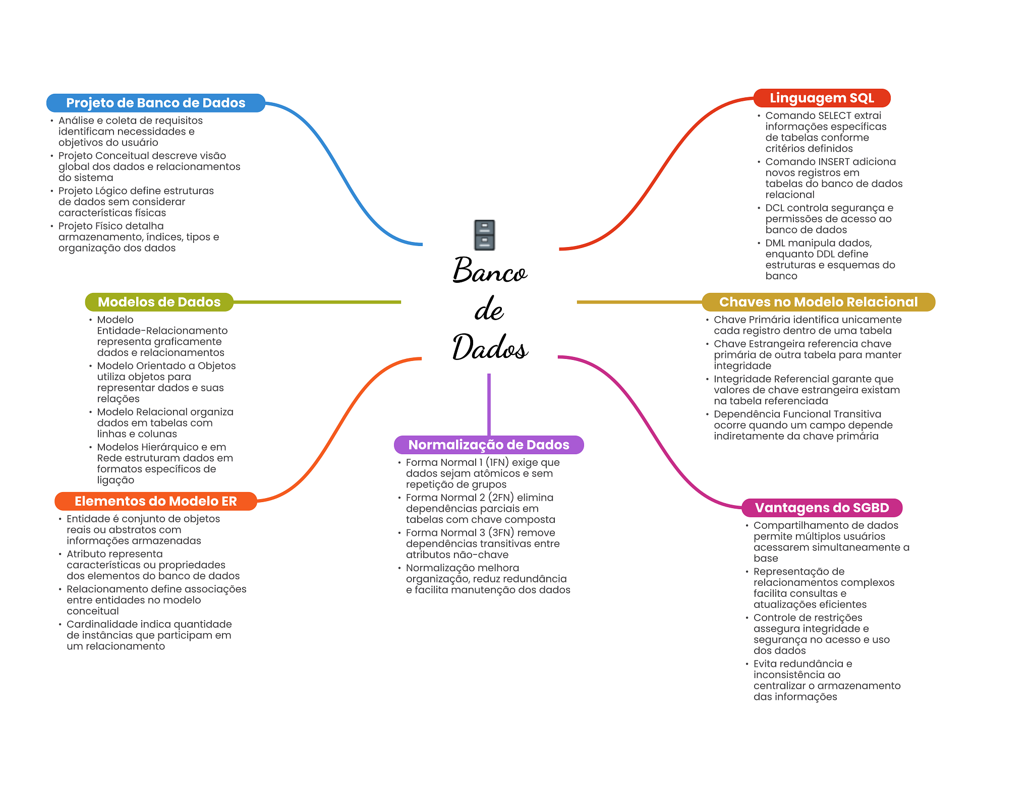 Projeto de Banco de Dados Linguagem SQL Comando SELECT extrai Análise e coleta de requisitos identificam necessidades e informações específicas de tabelas conforme objetivos do usuário critérios definidos Projeto Conceitual descreve visão Comando INSERT adiciona global dos dados e relacionamentos do sistema novos registros em tabelas do banco de dados Projeto Lógico define estruturas relacional de dados sem considerar características físicas DCL controla segurança e permissões de acesso ao Projeto Físico detalha banco de dados armazenamento, tipos e organização dos dados DML manipula dados, enquanto DDL define Banco estruturas e esquemas do banco Modelos de Dados de Chaves no Modelo Relacional Modelo Chave Primária identifica unicamente Entidade-Relacionamento cada registro dentro de uma tabela representa graficamente dados e relacionamentos Dados Chave Estrangeira referencia chave primária de outra tabela para manter Modelo Orientado a Objetos integridade utiliza objetos para Integridade Referencial garante que representar dados e suas valores de chave estrangeira existam relações na tabela referenciada Modelo Relacional organiza Dependência Funcional Transitiva dados em tabelas com ocorre quando um campo depende linhas e colunas indiretamente da chave primária Modelos Hierárquico e em Normalização de Dados Rede estruturam dados em Forma Normal 1 exige que formatos específicos de dados sejam atômicos e sem ligação repetição de grupos Elementos do Modelo ER Forma Normal 2 (2FN) elimina dependências parciais em Vantagens do SGBD Entidade é conjunto de objetos tabelas com chave composta reais ou abstratos com Forma Normal 3 (3FN) remove Compartilhamento de dados informações armazenadas permite múltiplos usuários dependências transitivas entre acessarem simultaneamente a Atributo representa atributos não-chave base características ou propriedades Normalização melhora dos elementos do banco de dados Representação de organização, reduz redundância relacionamentos complexos Relacionamento define associações e facilita manutenção dos dados facilita consultas e entre entidades no modelo atualizações eficientes conceitual Controle de restrições Cardinalidade indica quantidade assegura integridade e de instâncias que participam em um relacionamento segurança no acesso e uso dos dados Evita redundância e inconsistência ao centralizar O armazenamento das informações