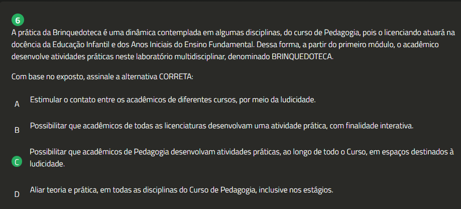6 A prática da Brinquedoteca é uma dinâmica contemplada em algumas disciplinas, do curso de Pedagogia, pois 0 licenciando atuará na docência da Educação Infantil e dos Anos Iniciais do Ensino Fundamental. Dessa forma, a partir do primeiro módulo, 0 acadêmico desenvolve atividades práticas neste laboratório multidisciplinar, denominado BRINQUEDOTECA. Com base no exposto, assinale a alternativa CORRETA: A Estimular contato entre acadêmicos de diferentes cursos, por meio da ludicidade. Possibilitar que acadêmicos de todas as licenciaturas desenvolvam uma atividade prática, com finalidade interativa. Possibilitar que acadêmicos de Pedagogia desenvolvam atividades práticas, ao longo de todo 0 Curso, em espaços destinados à ludicidade. D Aliar teoria e prática, em todas as disciplinas do Curso de Pedagogia, inclusive nos estágios.