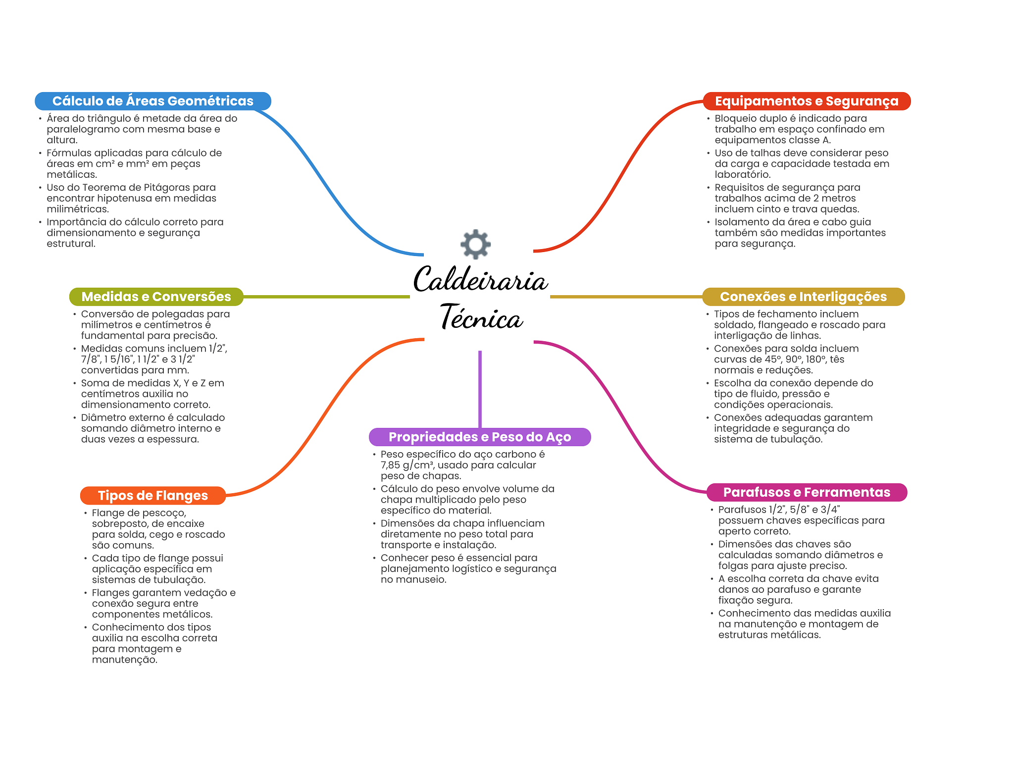 Cálculo de Áreas Geométricas Equipamentos e Segurança Área do triângulo é metade da área do Bloqueio duplo é indicado para paralelogramo com mesma base e trabalho em espaço confinado em altura. equipamentos classe A. Fórmulas aplicadas para cálculo de Uso de talhas deve considerar peso áreas em e em peças da carga e capacidade testada em metálicas. laboratório. Uso do Teorema de Pitágoras para Requisitos de segurança para encontrar hipotenusa em medidas trabalhos acima de 2 metros milimétricas. incluem cinto e trava quedas. Importância do cálculo correto para Isolamento da área e cabo guia dimensionamento e segurança também são medidas importantes estrutural. para segurança. Caldeiraria Medidas e Conversões Conexões e Interligações Conversão de polegadas para milímetros e centímetros é Técnica Tipos de fechamento incluem soldado, flangeado e roscado para fundamental para precisão. interligação de linhas. Medidas comuns incluem 1/2", Conexões para solda incluem 7/8", 5/16", 11/2" e 31/2" curvas de 45°, 90°, 180°, tês convertidas para mm. normais e reduções. Soma de medidas X, Y e Z em Escolha da conexão depende do centímetros auxilia no tipo de fluido, pressão e dimensionamento correto. condições operacionais. Diâmetro externo é calculado Conexões adequadas garantem somando diâmetro interno e integridade e segurança do duas vezes a espessura. Propriedades e Peso do Aço sistema de tubulação. Peso específico do aço carbono é 7,85 usado para calcular peso de chapas. Cálculo do peso envolve volume da Tipos de Flanges Parafusos e Ferramentas chapa multiplicado pelo peso Flange de pescoço, específico do material. Parafusos 1/2", 5/8" e 3/4" sobreposto, de encaixe Dimensões da chapa influenciam possuem chaves específicas para para solda, cego e roscado diretamente no peso total para aperto correto. são comuns. transporte e instalação. Dimensões das chaves são Cada tipo de flange possui Conhecer peso é essencial para calculadas somando diâmetros e aplicação específica em planejamento logístico e segurança folgas para ajuste preciso. sistemas de tubulação. no manuseio. A escolha correta da chave evita Flanges garantem vedação e danos ao e garante conexão segura entre fixação segura. componentes metálicos. Conhecimento das medidas auxilia Conhecimento dos tipos na manutenção e montagem de auxilia na escolha correta estruturas metálicas. para montagem e manutenção.