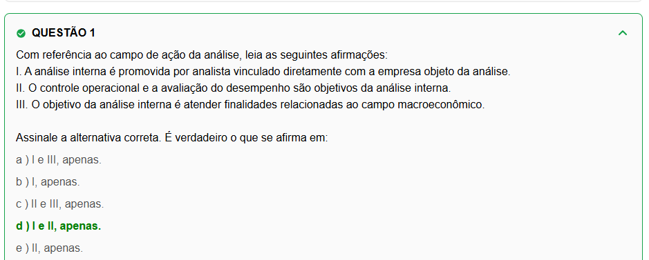 QUESTÃO 1 Com referência ao campo de ação da análise, leia as seguintes afirmações: A análise é promovida por analista vinculado diretamente com a empresa objeto da análise. II. O controle operacional e a avaliação do desempenho são objetivos da análise interna. III. objetivo da análise é atender finalidades relacionadas ao campo macroeconômico. Assinale a alternativa correta. É verdadeiro 0 que se afirma em: a) I e III, apenas. apenas. c) e III, apenas. e II, apenas. e ) II, apenas.