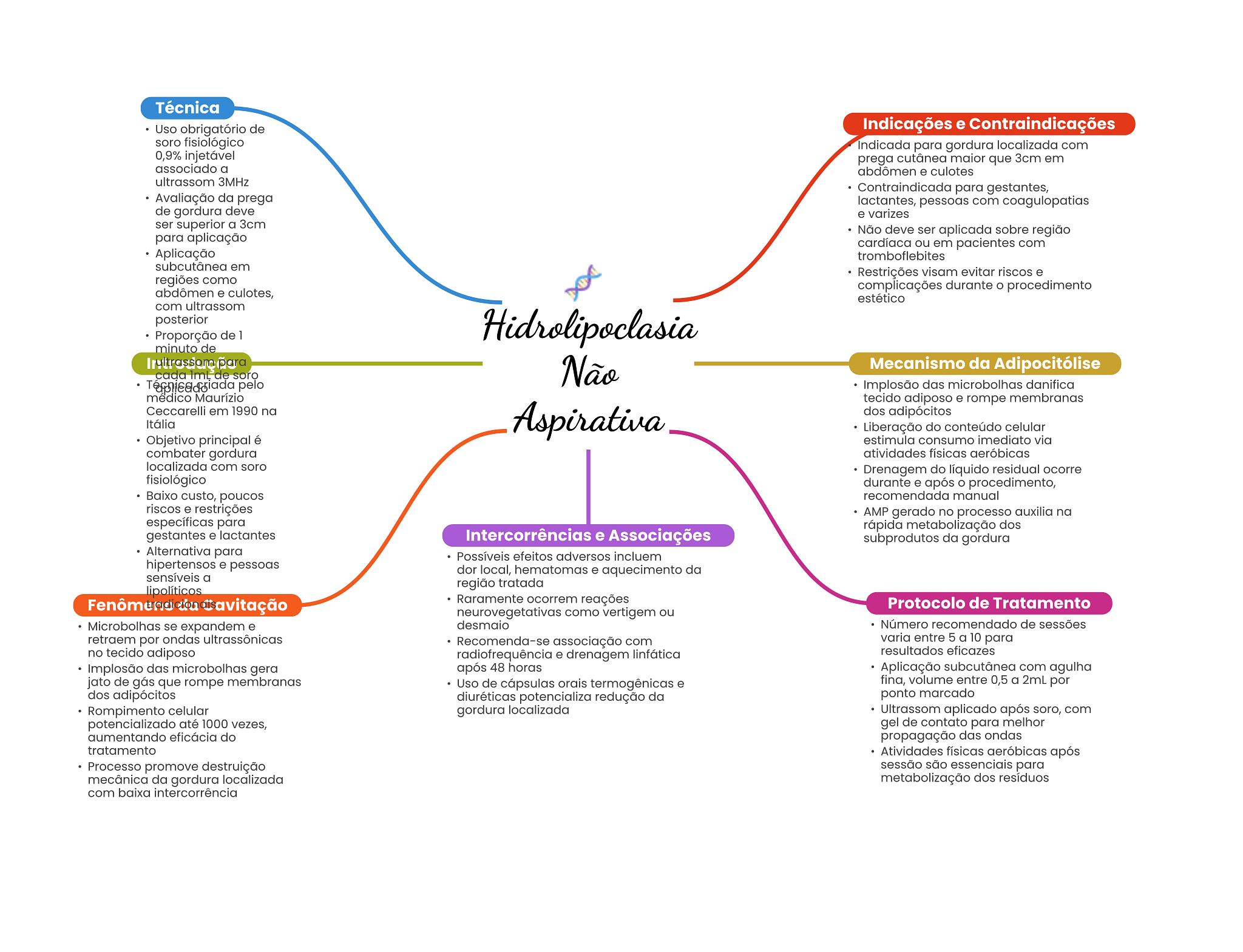 Técnica Uso obrigatório de Indicações e Contraindicações soro fisiológico Indicada para gordura localizada com 0,9% injetável prega cutânea maior que 3cm em associado a abdômen e culotes ultrassom 3MHz Contraindicada para gestantes, Avaliação da prega lactantes, pessoas com coagulopatias de gordura deve e varizes ser superior a 3cm Não deve ser aplicada sobre região para aplicação cardíaca ou em pacientes com Aplicação tromboflebites subcutânea em Restrições visam evitar riscos e regiões como complicações durante procedimento abdômen e culotes, estético com ultrassom posterior Proporção de 1 Hidrolipoclasia minuto de cada de soro Não Mecanismo da Adipocitólise pelo Implosão das microbolhas danifica médico Maurízio tecido adiposo e rompe membranas Ceccarelli em 1990 na Itália Aspirativa dos adipócitos Liberação do conteúdo celular Objetivo principal é estimula consumo imediato via combater gordura atividades físicas aeróbicas localizada com soro Drenagem do líquido residual ocorre fisiológico durante e após procedimento, Baixo custo, poucos recomendada manual riscos e restrições AMP gerado no processo auxilia na específicas para rápida metabolização dos gestantes e lactantes Intercorrências e Associações subprodutos da gordura Alternativa para Possíveis efeitos adversos incluem hipertensos e pessoas dor local, hematomas e aquecimento da sensíveis a região tratada lipolíticos cion Raramente ocorrem reações Protocolo de Tratamento neurovegetativas como vertigem ou Microbolhas se expandem e desmaio Número recomendado de sessões retraem por ondas ultrassônicas Recomenda-se associação com varia entre 5 a 10 para no tecido adiposo radiofrequência e drenagem linfática resultados eficazes Implosão das microbolhas gera após 48 horas Aplicação subcutânea com agulha jato de gás que rompe membranas Uso de cápsulas orais termogênicas e fina, volume entre 0,5 a 2mL por dos adipócitos diuréticas potencializa redução da ponto marcado Rompimento celular gordura localizada Ultrassom aplicado após soro, com potencializado até 1000 vezes, gel de contato para melhor aumentando eficácia do propagação das ondas tratamento Atividades físicas aeróbicas após Processo promove destruição sessão são essenciais para mecânica da gordura localizada metabolização dos resíduos com baixa intercorrência