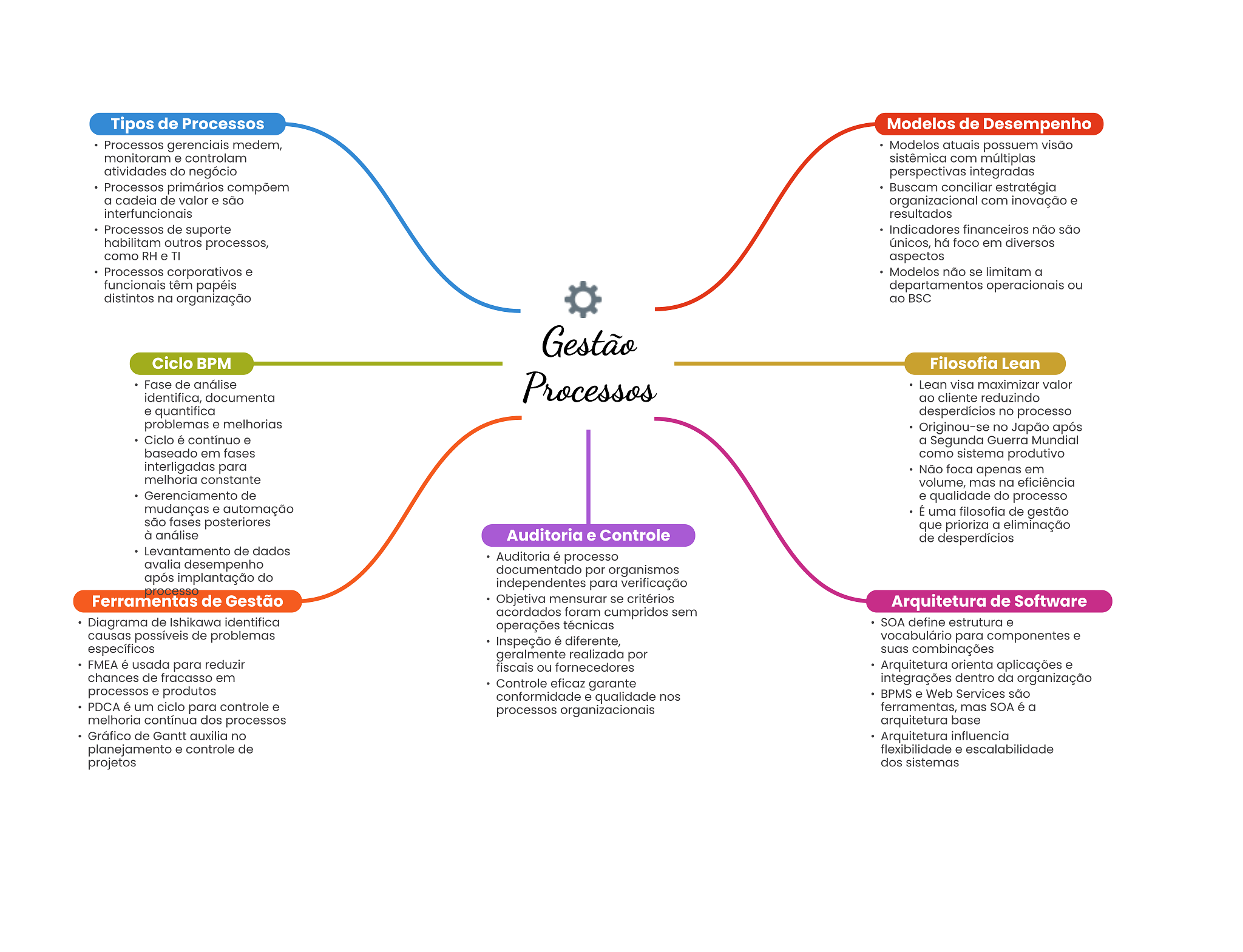 Tipos de Processos Modelos de Desempenho Processos gerenciais medem, Modelos atuais possuem visão monitoram e controlam sistêmica com múltiplas atividades do negócio perspectivas integradas Processos primários compõem Buscam conciliar estratégia a cadeia de valor e são organizacional com inovação e interfuncionais resultados Processos de suporte Indicadores financeiros não são habilitam outros processos, únicos, há foco em diversos como RH e TI aspectos Processos corporativos e Modelos não se limitam a funcionais têm papéis departamentos operacionais ou distintos na organização ao BSC Gestão Ciclo BPM Filosofia Lean Fase de análise Processos Lean visa maximizar valor identifica, documenta ao cliente reduzindo e quantifica desperdícios no processo problemas e melhorias Originou-se no Japão após Ciclo é contínuo e a Segunda Guerra Mundial baseado em fases como sistema produtivo interligadas para Não foca apenas em melhoria constante volume, mas na eficiência Gerenciamento de e qualidade do processo mudanças e automação É uma filosofia de gestão são fases posteriores que prioriza a eliminação à análise Auditoria e Controle de desperdícios Levantamento de dados Auditoria é processo avalia desempenho documentado por organismos após implantação do independentes para verificação processo Ferramentas de Gestão Objetiva mensurar se critérios Arquitetura de Software acordados foram cumpridos sem Diagrama de Ishikawa identifica operações técnicas SOA define estrutura e causas possíveis de problemas Inspeção é diferente, vocabulário para componentes e específicos geralmente realizada por suas combinações FMEA é usada para reduzir fiscais ou fornecedores Arquitetura orienta aplicações e chances de fracasso em Controle eficaz garante integrações dentro da organização processos e produtos conformidade e qualidade nos BPMS e Web Services são PDCA é um ciclo para controle e processos organizacionais ferramentas, mas SOA é a melhoria contínua dos processos arquitetura base Gráfico de Gantt auxilia no Arquitetura influencia planejamento e controle de flexibilidade e escalabilidade projetos dos sistemas