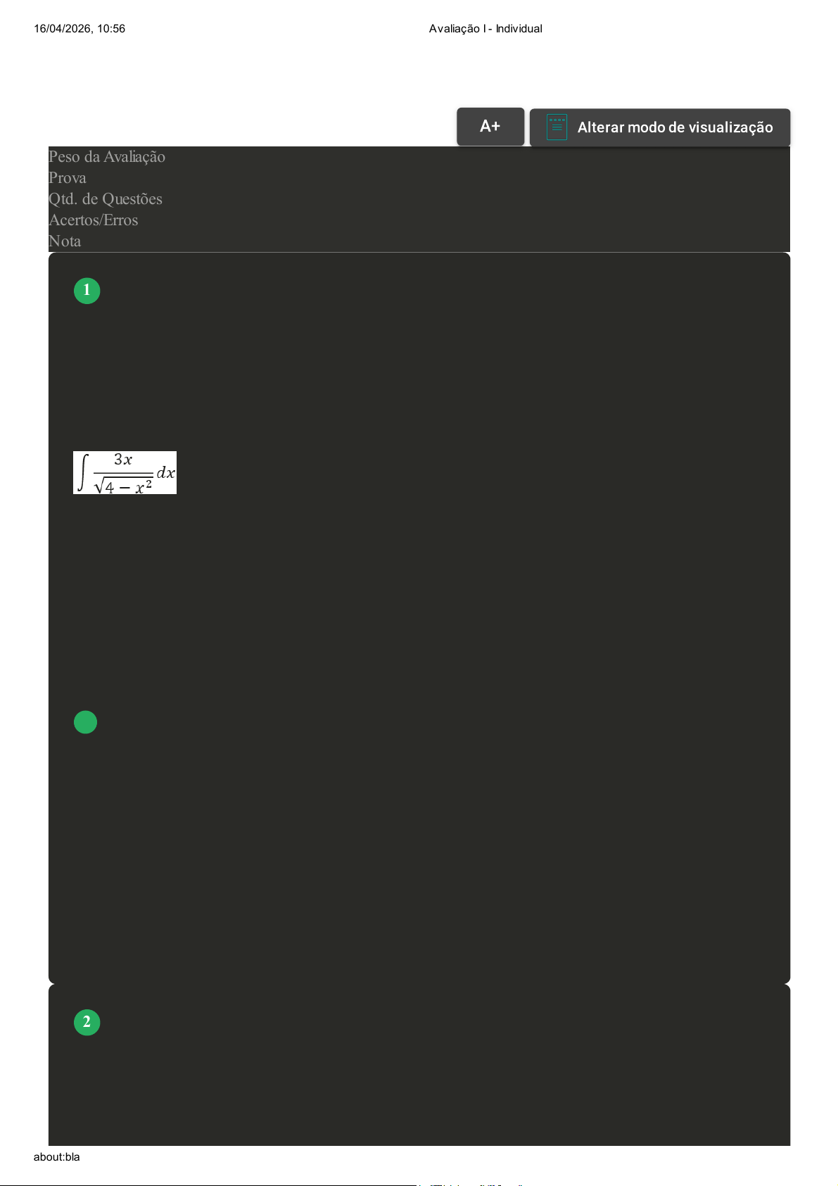Prova Impressa GABARITO | Avaliação I - Individual (Cod.:1597376) Peso da Avaliação 1,50 Prova 118432612 Qtd. de Questões 10 Acertos/Erros 8/2 Nota 8,00 O método da substituição trigonométrica, como indica o seu nome, envolve a substituição de um termo na expressão original por uma função trigonométrica adequada. Esse método se assemelha ao método de substituição padrão, mas com o uso específico de funções trigonométricas para simplificar a integração. Em certos casos, é possível utilizar qualquer uma das duas substituições, porém, no caso das trigonométricas, estas apresentam estruturas peculiar e padronizada. Desta forma, utilizando destas ideias, analise as opções que apresentam argumentos válidos, sobre a resolução da integral a seguir: I. Está integral em particular, é um caso em que podemos aplicar qualquer um dos casos de substituição. II. Para resolver pela substituição trigonométrica, devemos adotar inicialmente x = 2sen(y). III. É possível resolver, substituindo de forma simples u = 4 - x². IV. O método da substituição padrão falha, pois, ao derivar uma escolha apropriada para u, a integral não é simplificada. É correto o que se afirma em: A I e II, apenas. B I, II e III, apenas. C II e IV, apenas. D I e IV, apenas. E II e III, apenas. A resolução de integrais requer a aplicação meticulosa de métodos analíticos e estratégias de simplificação, visando encontrar soluções que capturem com precisão os aspectos fundamentais das funções em estudo, sendo uma habilidade essencial em diversas áreas da matemática e ciências aplicadas. Portanto, utilizando das técnicas e métodos desenvolvidos no estudo das integrais, assinale entre as opções a seguir, qual delas apresenta a primitiva da função f(x) = 4xex². VOLTAR A+Aumentar, FonteAlterar modo de visualização 1 2 16/04/2026, 10:56 Avaliação I - Individual about:blank 1/7 A 2ex² + c. B 8xex² + c. C 4ex² + c. D 4xex² + c. E 2xex² + c. As operações inversas: adição e subtração, multiplicação e divisão, potenciação e radiciação, exponenciação e logaritmação, já são bastante conhecidas. A integração indefinida é basicamente a operação inversa da diferenciação. Assim, dada a derivada de uma função, o processo que consiste em achar a função que a originou, ou seja, achar a sua primitiva denomina-se de antiderivação. Baseado nisso, analise as opções que apresentam f(x), sendo que f'(x) = 3x² - 6x + 2 para todo x e com f(1) = 2: I. f(x) = 6x² - 6 II. f(x) = x³ - 3x² + 2x + 2 III. f(x) = x³ - 6x² + 2x IV. f(x) = 3x² - 2x - 3 É correto apenas o que se afirma em A II e IV, apenas. B I e II, apenas. C II e III, apenas. D I, apenas. E II, apenas. 3 16/04/2026, 10:56 Avaliação I - Individual about:blank 2/7 No cálculo, a integral de uma função foi criada originalmente para determinar a área sob uma curva no plano cartesiano e também surge naturalmente em dezenas de problemas da física, como na determinação da posição em todos os instantes de um objeto, se for conhecida a sua velocidade instantânea em todos os instantes. Para resolver estas integrais, podemos recorrer a alguns métodos de resolução. Um deles é o método da integração por substituição. Sobre o exposto, analise as sentenças a seguir: É correto o que se afirma em: A I, II e IV, apenas. B I e III, apenas. C I e IV, apenas. D II, apenas. E II, III e IV, apenas. O cálculo integral desempenha um papel fundamental em uma ampla gama de disciplinas, desde a física e a engenharia até a economia e as ciências naturais. Sua versatilidade e poder analítico permitem modelar e resolver problemas complexos que envolvem taxas de variação e acumulação contínua. Ele abrange dois aspectos principais: as integrais definidas e as indefinidas. Sobre o exposto, analise as sentenças a seguir: I. Uma integral definida tem limites de integração, enquanto uma integral indefinida não os tem. II. A integral indefinida, tem como princípio, encontrar uma função cuja derivada seja igual à função original. III. Um indicador que podemos usar para definir se a integral é definida ou indefinida, é o diferencial de integração, presente no final da integral. IV. As integrais indefinidas, resultam em uma família de funções cuja derivada é igual à função original. É correto o que se afirma em: 4 Revisar Conteúdo do Livro 5 16/04/2026, 10:56 Avaliação I - Individual about:blank 3/7 A II e III, apenas. B II, III e IV, apenas. C I, II e IV, apenas. D I e III, apenas. E I, II, III e IV. Frações parciais são uma técnica fundamental no cálculo integral, utilizada para decompor uma fração em uma soma de frações mais simples. Esse método é especialmente útil para integrar funções racionais do tipo f(x) = p(x)/q(x), tornando-as mais fáceis de serem manipuladas e integradas. Através da decomposição em frações parciais, é possível resolver integrais que seriam difíceis ou impossíveis de serem calculadas de outra forma. Considerando as informações apresentadas, avalie as asserções a seguir e a relação proposta entre elas. I. Considerando o polinômio q(x) = x · (x² + 4)³, este será decomposto em quatro partes. PORQUE II. O polinômio q(x) apresenta um fator linear e um fator quadrático irredutível que se repete por três vezes. A respeito dessas asserções, assinale a opção correta: A As asserções I e II são verdadeiras, mas a II não é uma justificativa correta da I. B A asserção I é uma proposição verdadeira e a II é uma proposição falsa. C A asserção I é uma proposição falsa e a II é uma proposição verdadeira. D As asserções I e II são falsas. E As asserções I e II são verdadeiras, e a II é uma justificativa correta da I. 6 16/04/2026, 10:56 Avaliação I - Individual about:blank 4/7 Em situações em que uma função possui partes de sua representação gráfica acima e abaixo do eixo das 