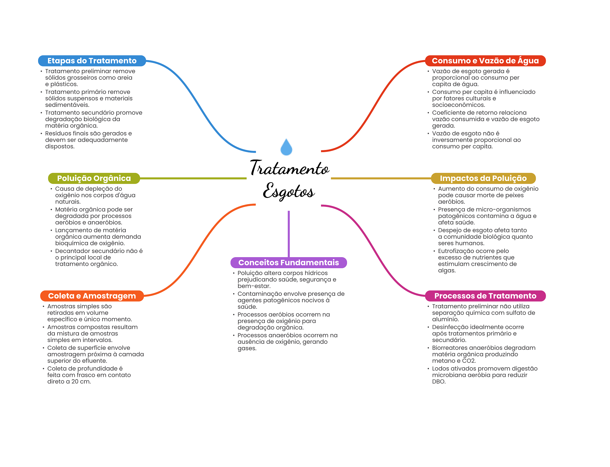 Etapas do Tratamento Consumo e Vazão de Água Tratamento preliminar remove Vazão de esgoto gerada é sólidos grosseiros como areia proporcional ao consumo per e plásticos. capita de água. Tratamento primário remove Consumo per capita é influenciado sólidos suspensos e materiais por fatores culturais e sedimentáveis. socioeconômicos. Tratamento secundário promove Coeficiente de retorno relaciona degradação biológica da vazão consumida e vazão de esgoto matéria orgânica. gerada. Resíduos finais são gerados e Vazão de esgoto não é devem ser adequadamente inversamente proporcional ao dispostos. consumo per capita. Tratamento Poluição Orgânica Impactos da Poluição Causa de depleção do oxigênio nos corpos d'água Esgotos Aumento do consumo de oxigênio pode causar morte de peixes naturais. aeróbios. Matéria orgânica pode ser Presença de micro-organismos degradada por processos patogênicos contamina a água e aeróbios e anaeróbios. afeta saúde. Lançamento de matéria Despejo de esgoto afeta tanto orgânica aumenta demanda a comunidade biológica quanto bioquímica de oxigênio. seres humanos. Decantador secundário não é Eutrofização ocorre pelo principal local de excesso de nutrientes que tratamento orgânico. Conceitos Fundamentais estimulam crescimento de Poluição altera corpos hídricos algas. prejudicando saúde, segurança e bem-estar. Coleta e Amostragem Contaminação envolve presença de Processos de Tratamento agentes patogênicos nocivos à Amostras simples são saúde. Tratamento preliminar não utiliza retiradas em volume Processos aeróbios ocorrem na separação química com sulfato de específico e único momento. presença de oxigênio para alumínio. Amostras compostas resultam degradação orgânica. Desinfecção idealmente ocorre da mistura de amostras Processos anaeróbios ocorrem na após tratamentos primário e simples em intervalos. ausência de oxigênio, gerando secundário. Coleta de superfície envolve gases. Biorreatores anaeróbios degradam amostragem próxima à camada matéria orgânica produzindo superior do efluente. metano e CO2. Coleta de profundidade é Lodos ativados promovem digestão feita com frasco em contato microbiana aeróbia para reduzir direto a 20 cm. DBO.