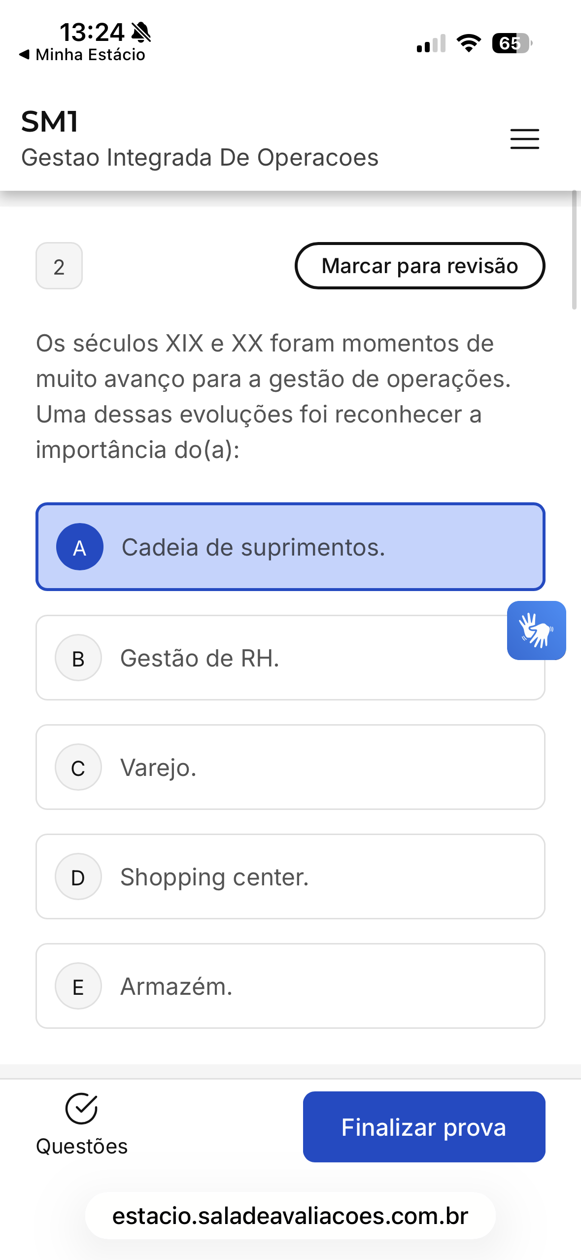 13:24 65 Minha Estácio SM1 Gestao Integrada De Operacoes 2 Marcar para revisão Os séculos XIX e XX foram momentos de muito avanço para a gestão de operações. Uma dessas evoluções foi reconhecer a importância do(a): A Cadeia de suprimentos. Gestão de RH. c Varejo. D Shopping center. E Armazém. Finalizar prova Questões estacio.saladeavaliacoes.com.br