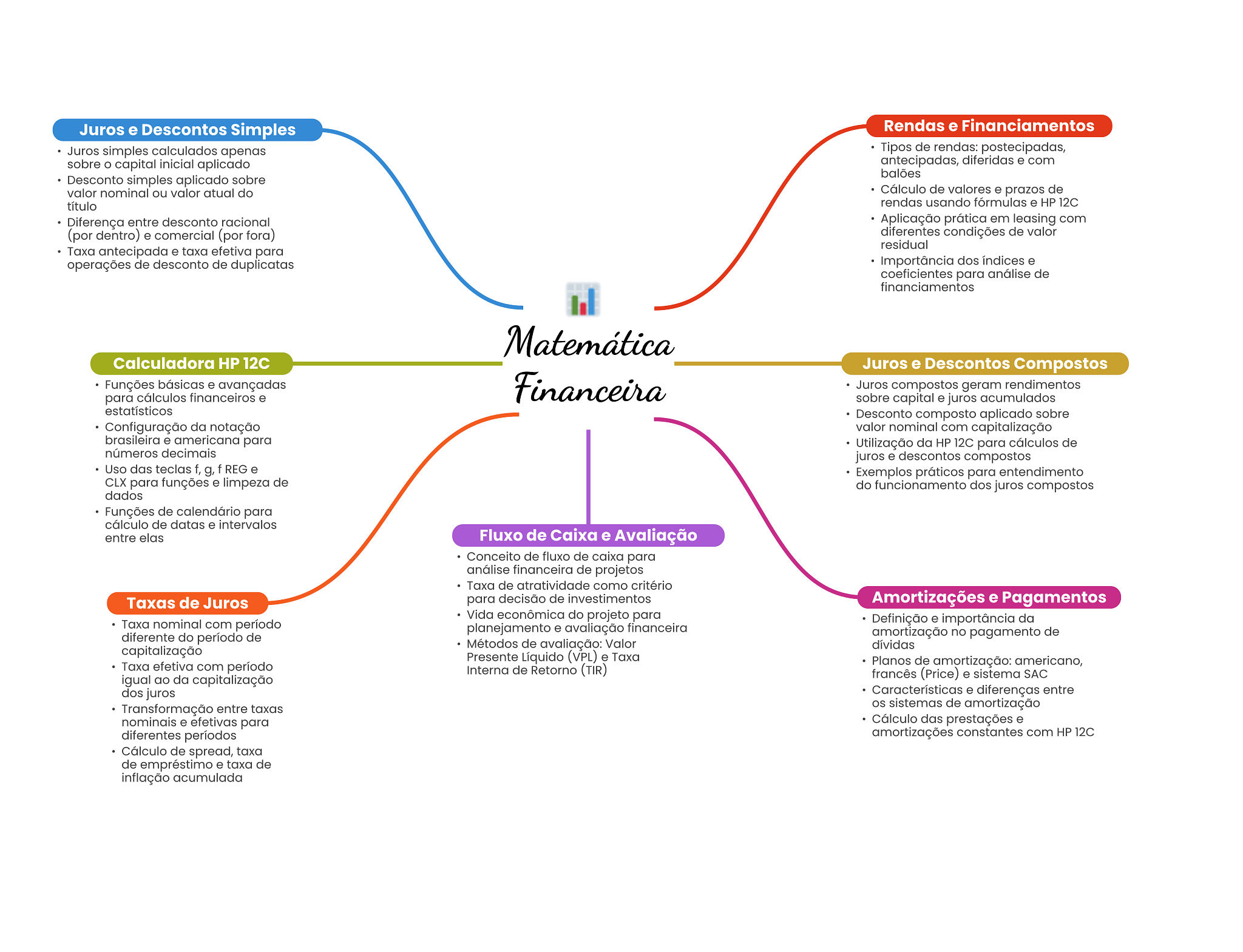 Juros e Descontos Simples Rendas e Financiamentos Juros simples calculados apenas Tipos de rendas: postecipadas, sobre capital inicial aplicado antecipadas, diferidas e com balões Desconto simples aplicado sobre valor nominal ou valor atual do Cálculo de valores e prazos de título rendas usando fórmulas e HP 12C Diferença entre desconto racional Aplicação prática em leasing com (por dentro) e comercial (por fora) diferentes condições de valor residual Taxa antecipada e taxa efetiva para operações de desconto de duplicatas Importância dos índices e coeficientes para análise de financiamentos Matemática Calculadora HP Juros e Descontos Compostos Funções básicas e avançadas Financeira Juros compostos geram rendimentos para cálculos financeiros e sobre capital e juros acumulados estatísticos Desconto composto aplicado sobre Configuração da notação valor nominal com capitalização brasileira e americana para Utilização da HP 12C para cálculos de números decimais juros e descontos compostos Uso das teclas f, g, f REG e Exemplos práticos para entendimento CLX para funções e limpeza de do funcionamento dos juros compostos dados Funções de calendário para cálculo de datas e intervalos entre elas Fluxo de Caixa e Avaliação Conceito de fluxo de caixa para análise financeira de projetos Taxa de atratividade como critério Taxas de Juros para decisão de investimentos Amortizações e Pagamentos Vida econômica do projeto para Taxa nominal com período Definição e importância da planejamento e avaliação financeira diferente do período de amortização no pagamento de Métodos de avaliação: Valor dívidas capitalização Presente Líquido (VPL) e Taxa Taxa efetiva com período Planos de amortização: americano, Interna de Retorno (TIR) igual ao da capitalização francês (Price) e sistema SAC dos juros Características e diferenças entre Transformação entre taxas sistemas de amortização nominais e efetivas para Cálculo das prestações e diferentes períodos amortizações constantes com HP 12C Cálculo de spread, taxa de empréstimo e taxa de inflação acumulada